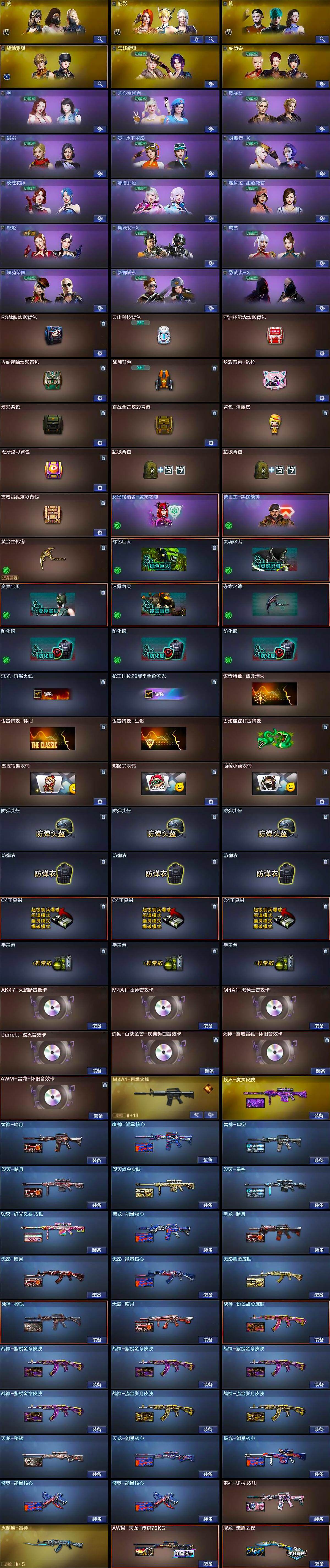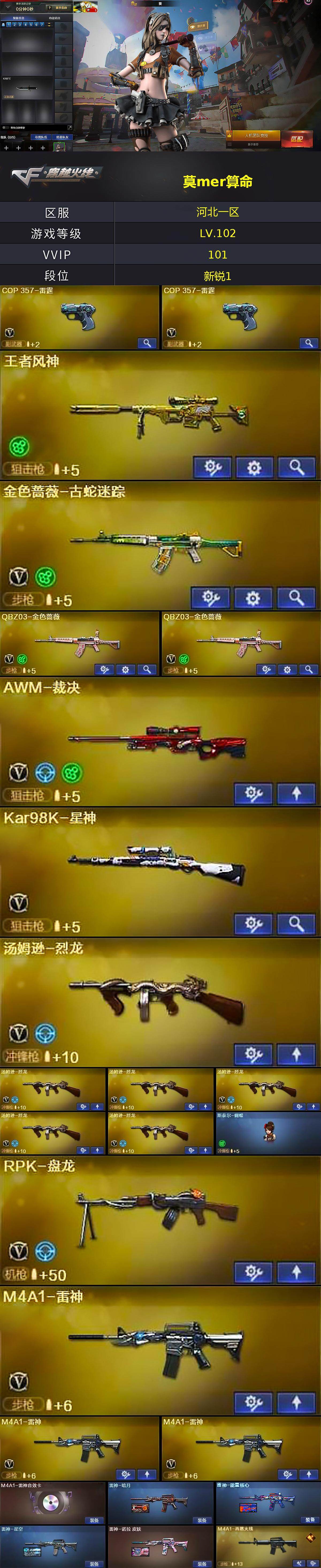 河北一区-99v-3王者武器数-0炫金武器数 【热门武器】:q03-金色蔷薇2,金色蔷薇-古蛇迷踪,修罗-古蛇迷踪,死亡之眼4,kar98k-星神,金色小号,c.a.t,牛牛-ak47,汤姆逊-烈龙6,rpk-盘龙,加特林-炼狱3,斯泰尔-蝴蝶,沙鹰-修罗6 【王者炫金武器】:王者风神 【音效卡】:ak47-火麒麟音效卡,m4a1-雷神音效卡,m4a1-黑骑士音效卡,barret