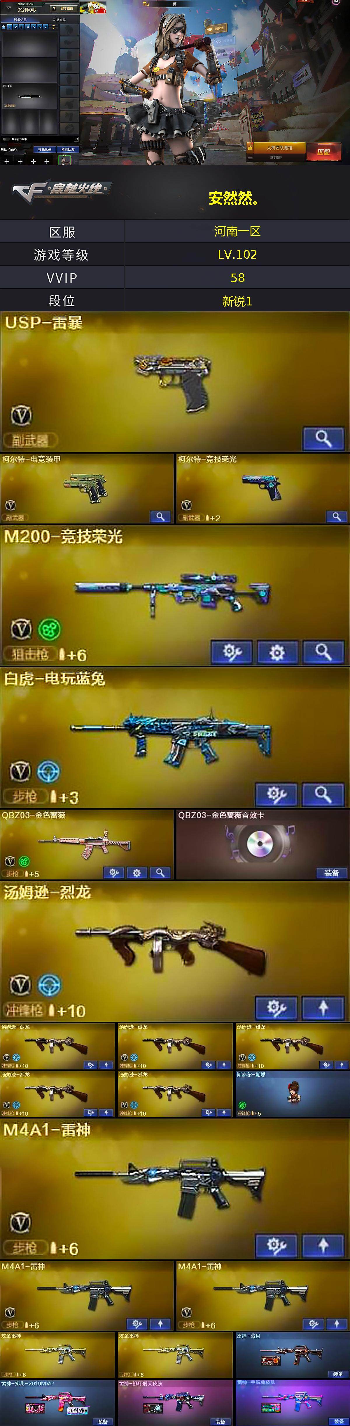 河南一区-62v-4王者武器数-3炫金武器数 【热门武器】:q03-金色蔷薇,m200-竞技荣光,死亡之眼,白虎-电玩蓝兔,m4a1-黑骑士,汤姆逊-烈龙6,斯泰尔-蝴蝶,雷神-小红,usp-雷暴,沙鹰-修罗3 【王者炫金武器】:炫金骑士,炫金雷神2 【音效卡】:m4a1-黑龙音效卡,m4a1-黑骑士音效卡,绝迹语音包 【皮肤】:雷神-暗月,雷神-宠儿-2019mvp,雷神-机甲刑天