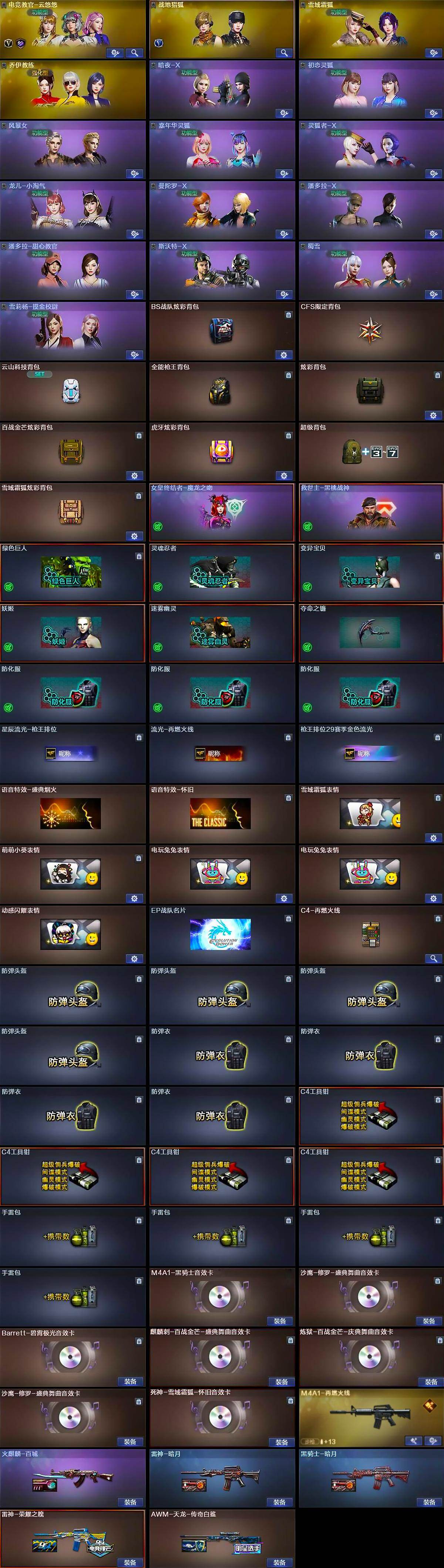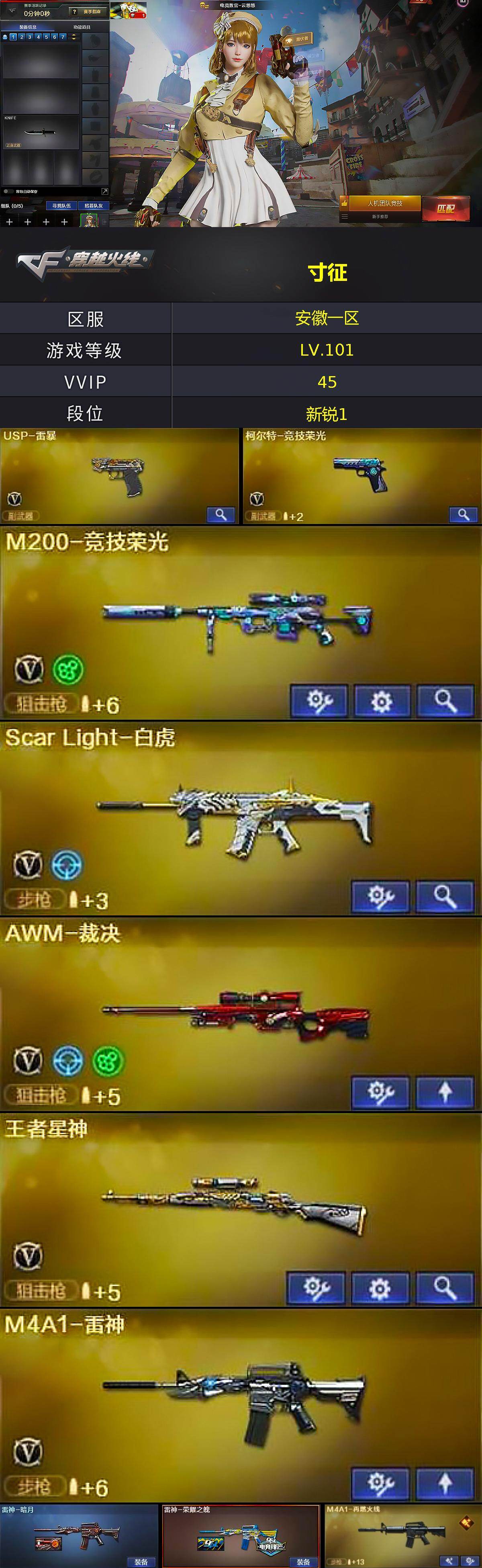 安徽一区-46v-4王者武器数-0炫金武器数 【热门武器】:scar light-白虎,m200-竞技荣光,m4a1-黑骑士,usp-雷暴,沙鹰-修罗 【音效卡】:m4a1-黑骑士音效卡,沙鹰-修罗-盛典舞曲音效卡2,barrett-碧霄极光音效卡,麒麟刺-百战金芒-盛典舞曲音效卡,炼狱-百战金芒-庆典舞曲音效卡,死神-雪域霜狐-怀旧音效卡 【皮肤】:雷神-暗月,雷神-荣耀之魄,m4a1-再