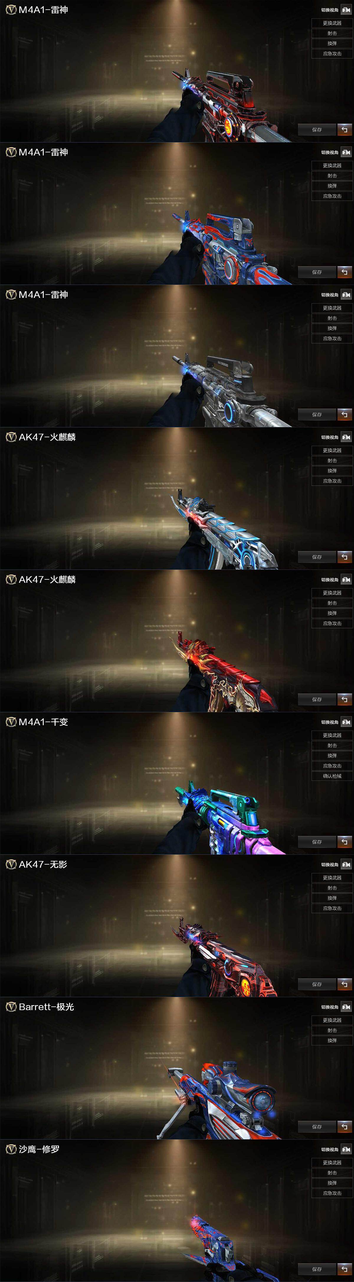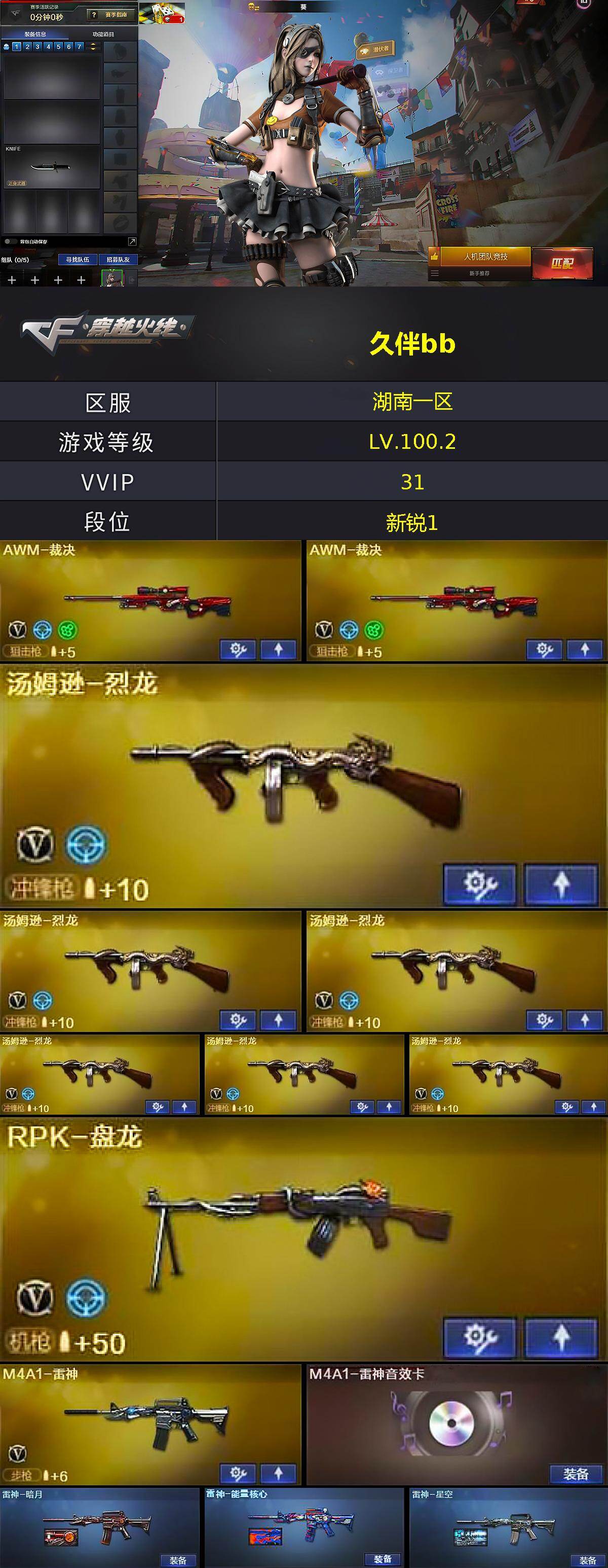 湖南一区-33v-4王者武器数-4炫金武器数 【热门武器】:hk417-朱雀,死亡之眼3,汤姆逊-烈龙6,rpk-盘龙,沙鹰-修罗2 【王者炫金武器】:王者之影,王者之刺,炫金骑士,炫金毁灭,炫金修罗2 【音效卡】:m4a1-雷神音效卡,barrett-毁灭音效卡 【皮肤】:雷神-暗月,雷神-能量核心,雷神-星空,火麒麟-雷神,火麒麟-平天大圣,m4a1-千变-孔明皮肤,无影-暗月,极