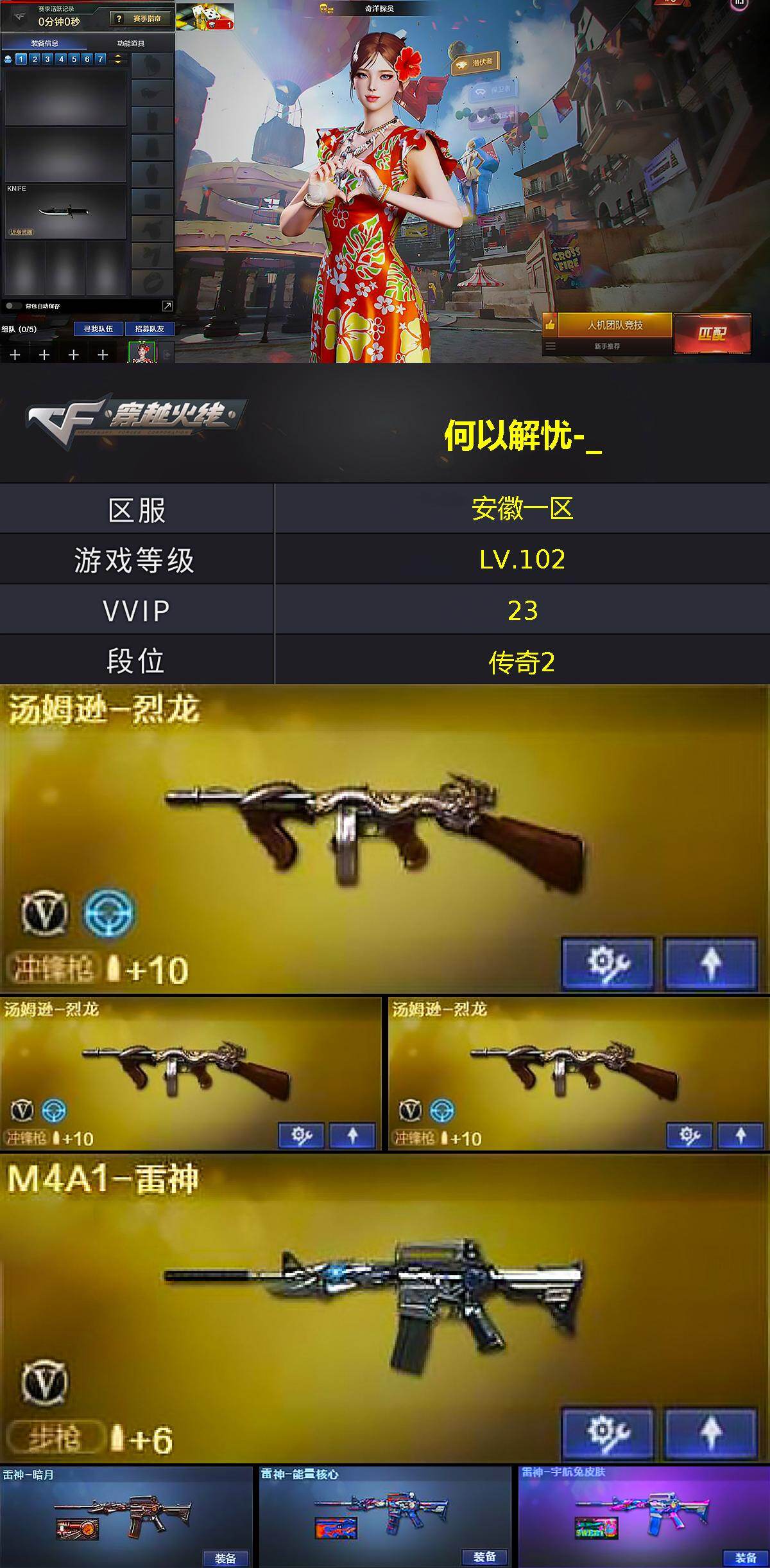 安徽一区-29v-1王者武器数-0炫金武器数 【热门武器】:死亡之眼,m4a1-黑骑士,汤姆逊-烈龙3,沙鹰-修罗2 【王者炫金武器】:ak47-雷暴王者 【皮肤】:雷神-暗月,雷神-能量核心,雷神-宇航兔皮肤,火麒麟-心动糖果,毁灭-暗月,毁灭-英雄计划 皮肤,黑龙-能量核心,黑龙-暗月,黑骑士-暗月2,死神-秘银,天启-暗月,hk417-朱雀-掌火灵橙 皮肤,天龙-能量核心,极光-能