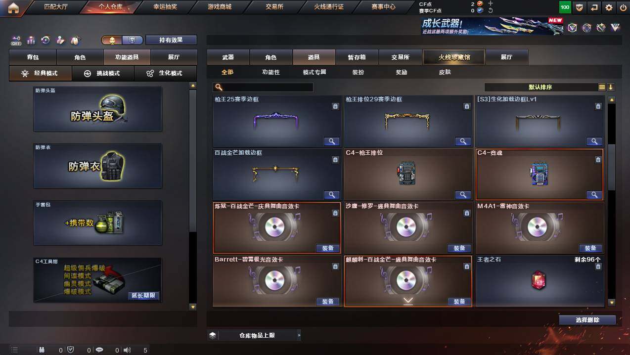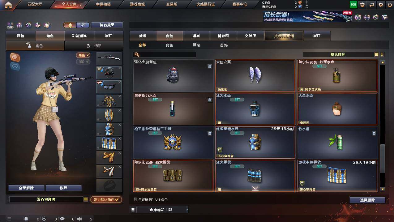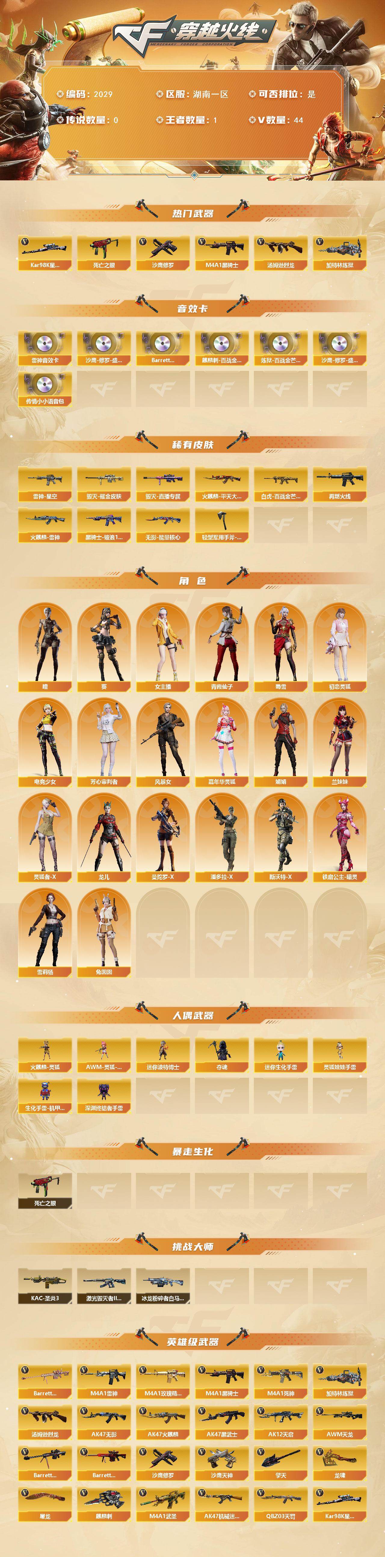 湖南一区-44v-1王者武器数-0炫金武器数 【热门武器】:死亡之眼,kar98k-星神,m4a1-黑骑士,汤姆逊-烈龙2,加特林-炼狱2,沙鹰-修罗3 【音效卡】:m4a1-雷神音效卡,沙鹰-修罗-盛典舞曲音效卡2,barrett-碧霄极光音效卡,麒麟刺-百战金芒-盛典舞曲音效卡,炼狱-百战金芒-庆典舞曲音效卡,传情小小语音包 【皮肤】:白虎-百战金芒 皮肤,雷神-星空,m4a1-再
