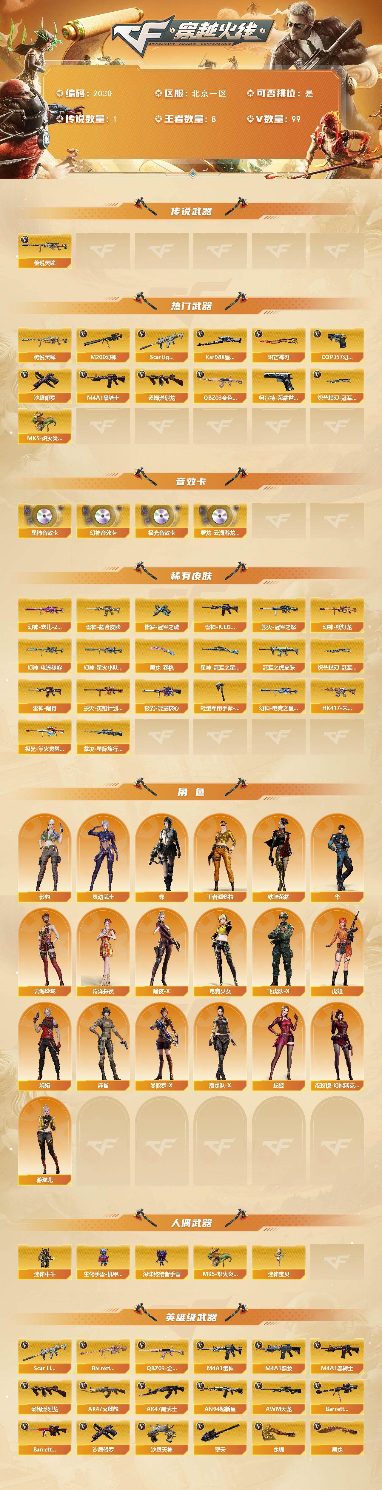 北京一区-99v-8王者武器数-0炫金武器数 【传说武器】:传说灵眸 【热门武器】:传说灵眸,q03-金色蔷薇,scar light-白虎,m200-幻神,柯尔特-荣耀世冠白鲨2023,kar98k-星神,m4a1-黑骑士,汤姆逊-烈龙,mk5-炽火炎龙,cop 357-幻灵,沙鹰-修罗4,炽芒蝶刃,炽芒蝶刃-冠军炽芒皮肤2 【音效卡】:屠龙-云海游龙音效卡,m200-幻神音效卡,ba