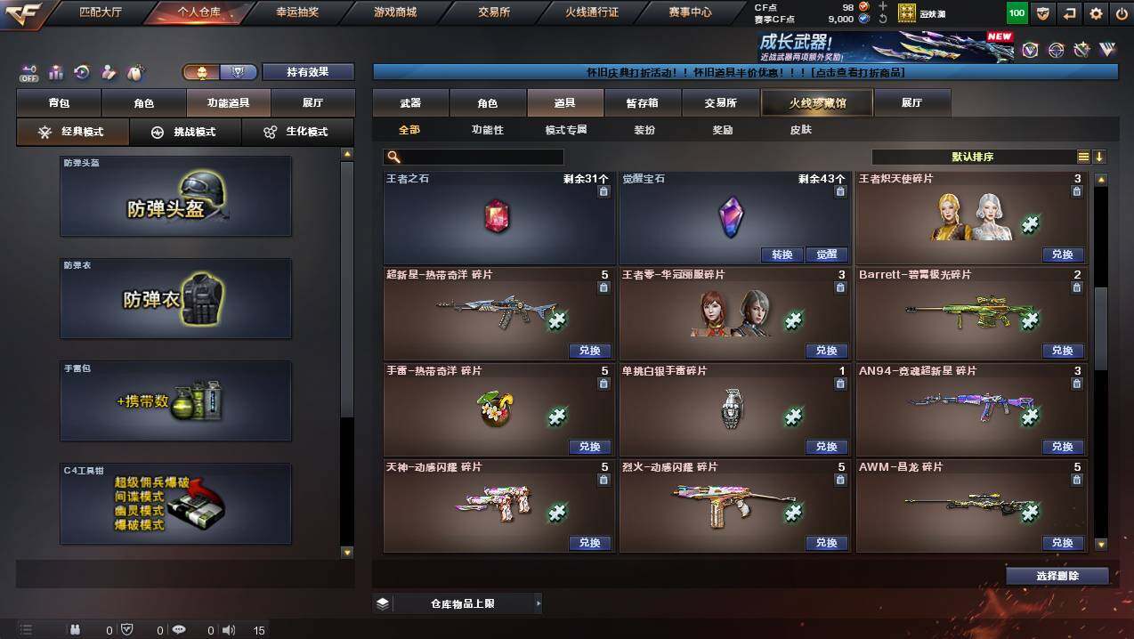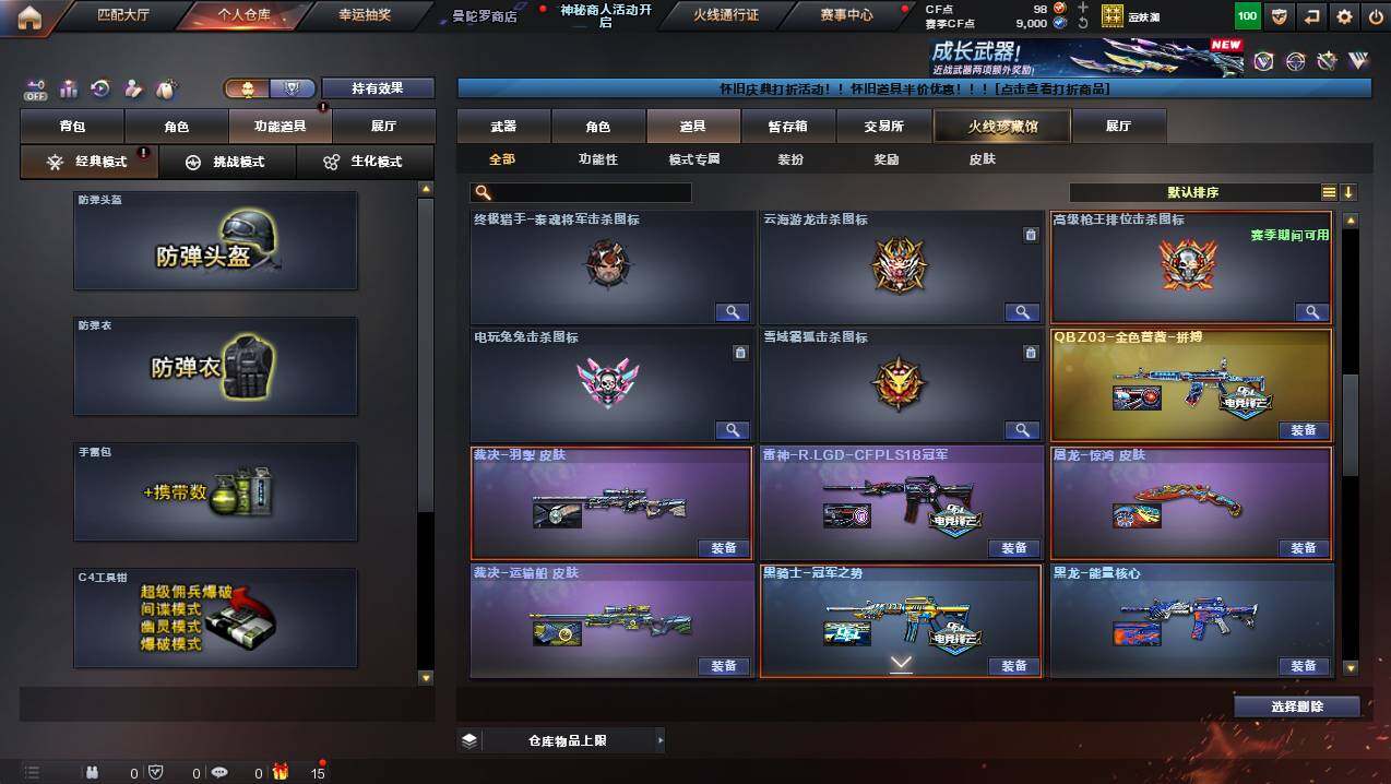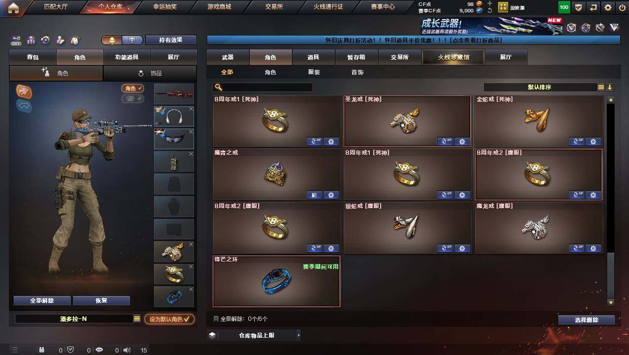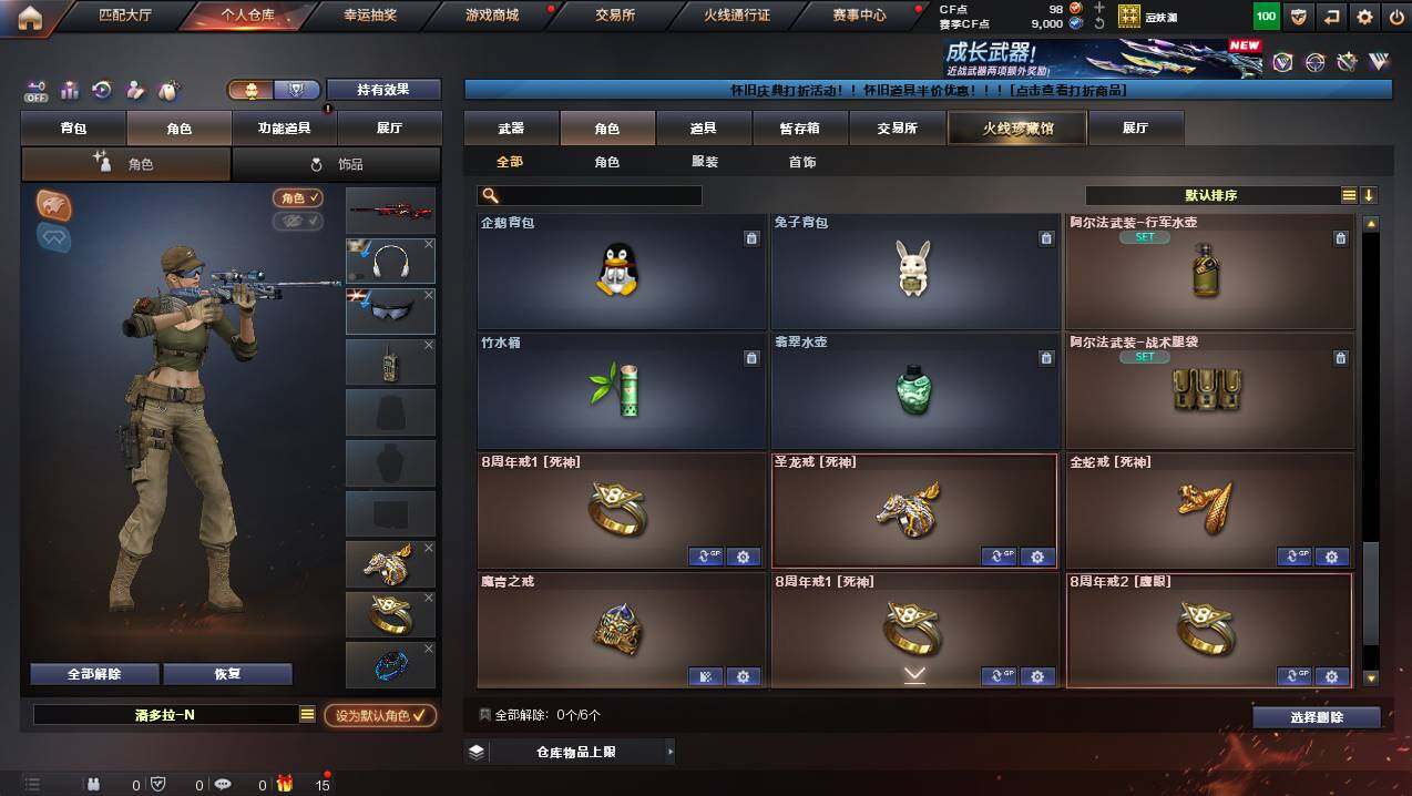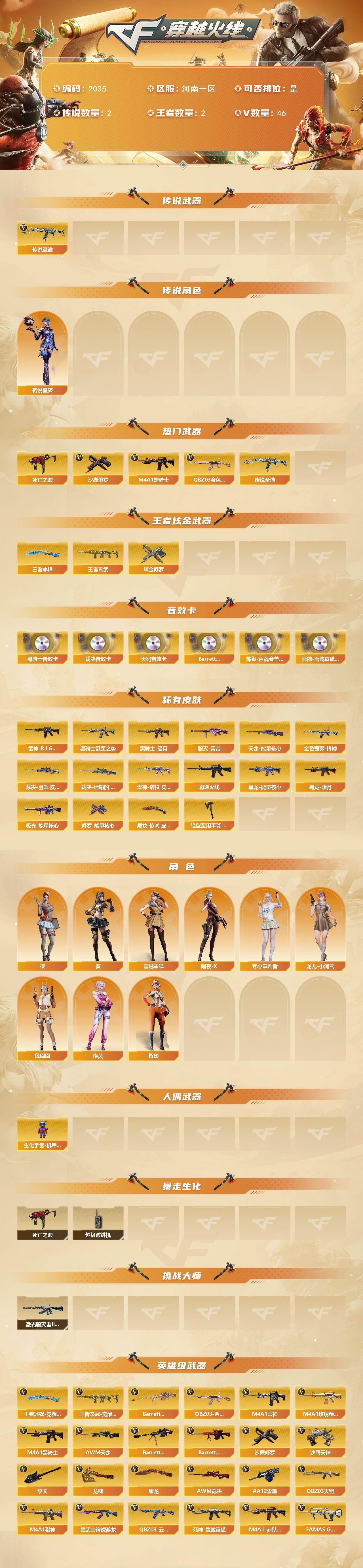 河南一区-46v-2王者武器数-1炫金武器数 【传说武器】:传说圣谕2 【传说角色】:传说星骇 【热门武器】:传说圣谕2,q03-金色蔷薇,死亡之眼4,m4a1-黑骑士,沙鹰-修罗5 【王者炫金武器】:王者玄武,王者冰锋,炫金修罗 【音效卡】:m4a1-黑骑士音效卡,awm-裁决音效卡2,q03-天罚音效卡,barrett-碧霄极光音效卡,炼狱-百战金芒-庆典舞曲音效卡,死神