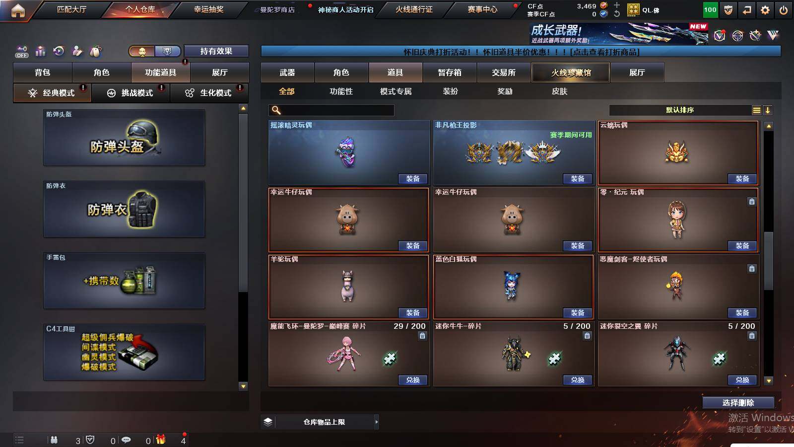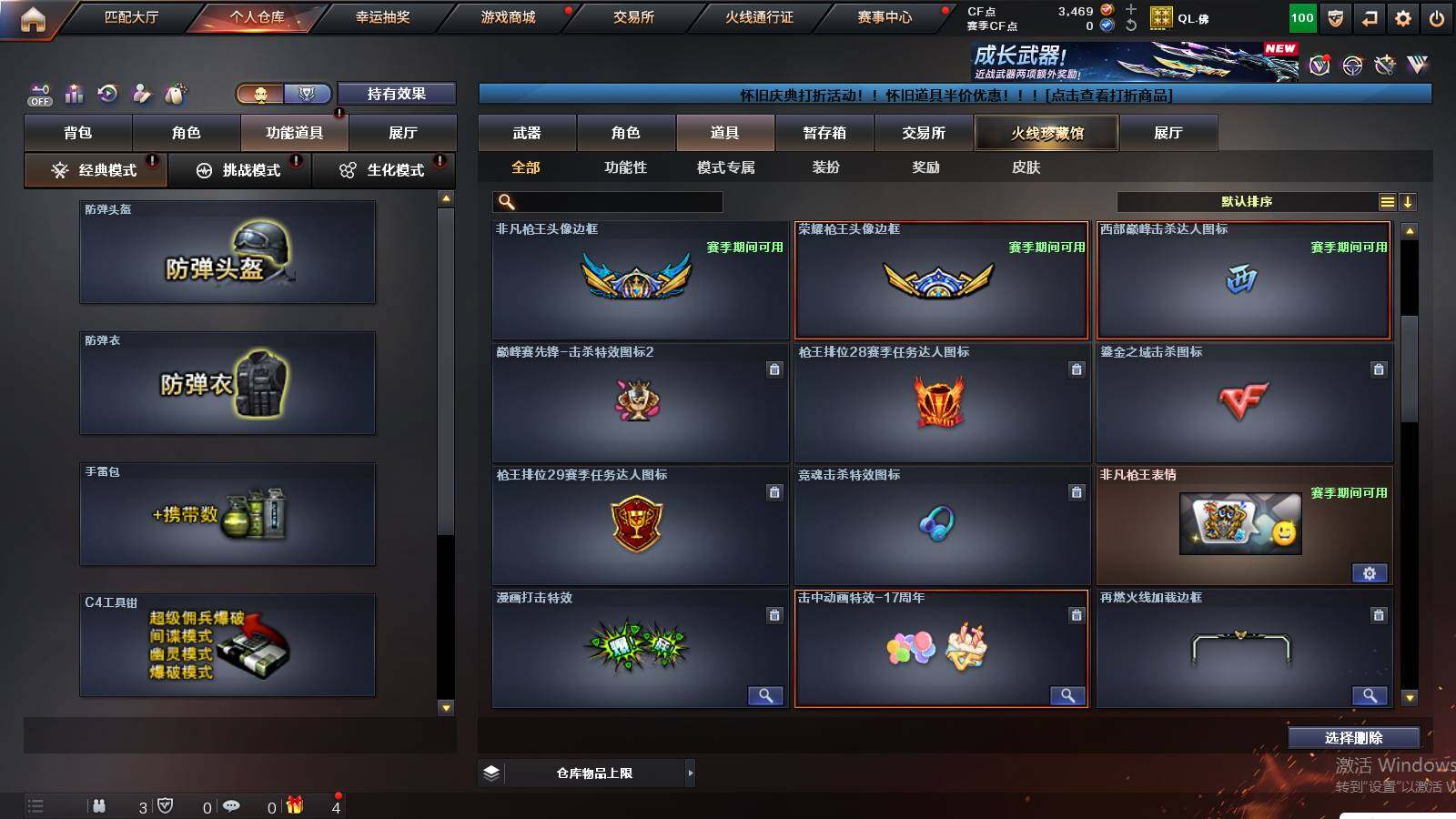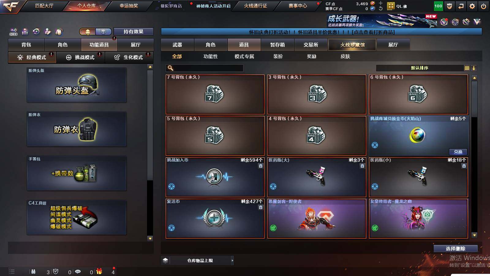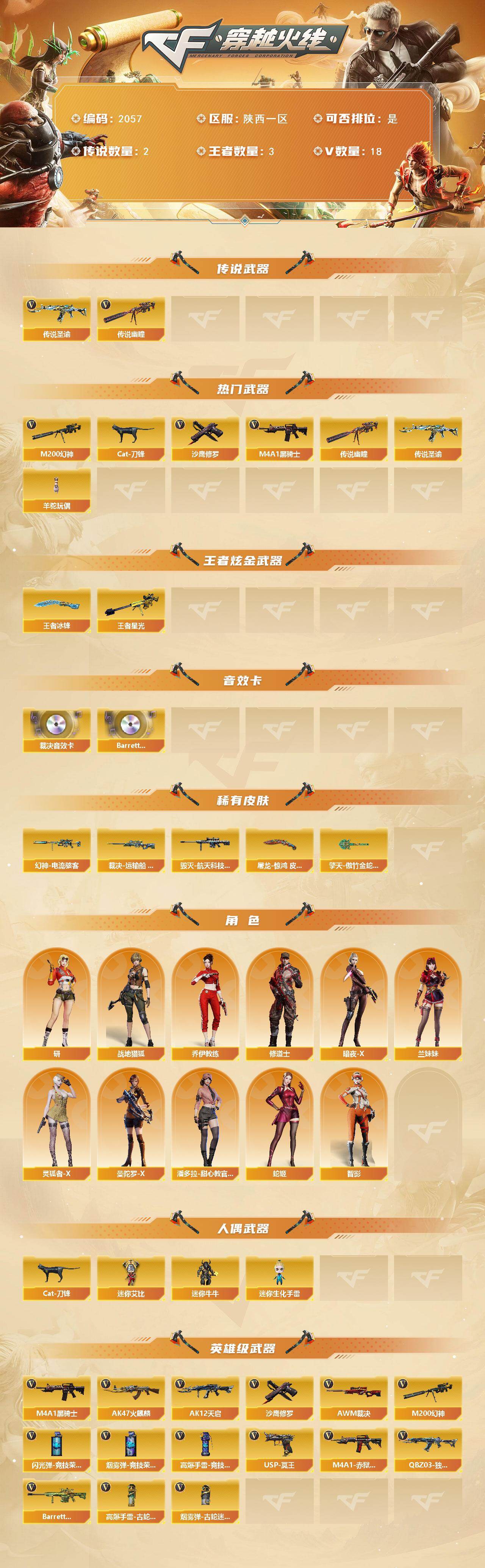 陕西一区-18v 【传说武器】:传说圣谕,传说幽瞳 【热门武器】:传说幽瞳,传说圣谕,m200-幻神,cat-刀锋,m4a1-黑骑士,羊驼玩偶,沙鹰-修罗 【王者炫金武器】:王者星光,王者冰锋 【音效卡】:awm-裁决音效卡,barrett-碧霄极光音效卡 【皮肤】:幻神-电流骇客 皮肤,裁决-运输船 皮肤,毁灭-航天科技皮肤,屠龙-惊鸿 皮肤,擎天-傲竹金蛇 皮肤 【角色】:研,战地猎狐,乔