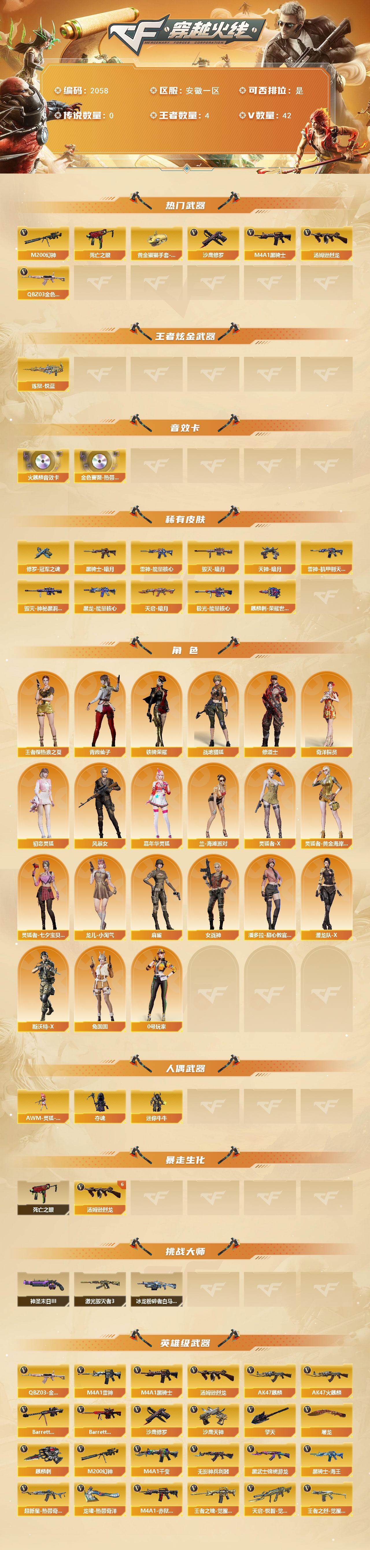 福建一区-43v-4王者武器数-0炫金武器数 【热门武器】:q03-金色蔷薇,m200-幻神,死亡之眼,m4a1-黑骑士,汤姆逊-烈龙6,沙鹰-修罗6,黄金猫猫手套-白鲨 【王者炫金武器】:炼狱-悦蓝 【音效卡】:q03-金色蔷薇-热带奇洋音效卡,ak47-火麒麟音效卡 【皮肤】:雷神-能量核心2,雷神-机甲刑天皮肤,毁灭-暗月,毁灭-神秘黑洞皮肤,黑龙-能量核心2,黑骑士-暗