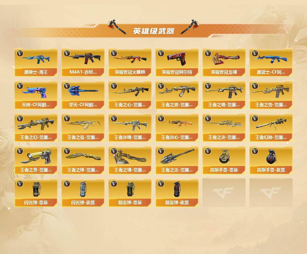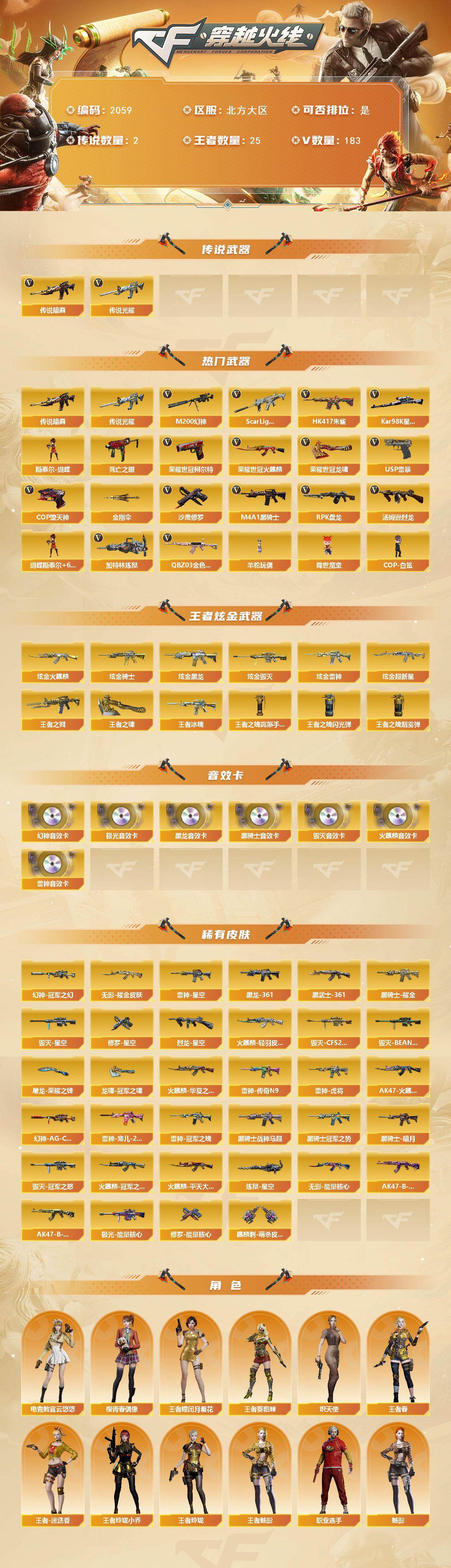 北方大区-183v-25王者武器数-9炫金武器数 【传说武器】:传说光耀,传说暗裔 【热门武器】:传说光耀,传说暗裔,q03-金色蔷薇,scar light-白虎,hk417-朱雀,m200-幻神,死亡之眼2,荣耀世冠-火麒麟,荣耀世冠-柯尔特,kar98k-星神,m4a1-黑骑士10,汤姆逊-烈龙6,rpk-盘龙6,加特林-炼狱4,斯泰尔-蝴蝶,羊驼玩偶,降世魔童,cop-白鲨