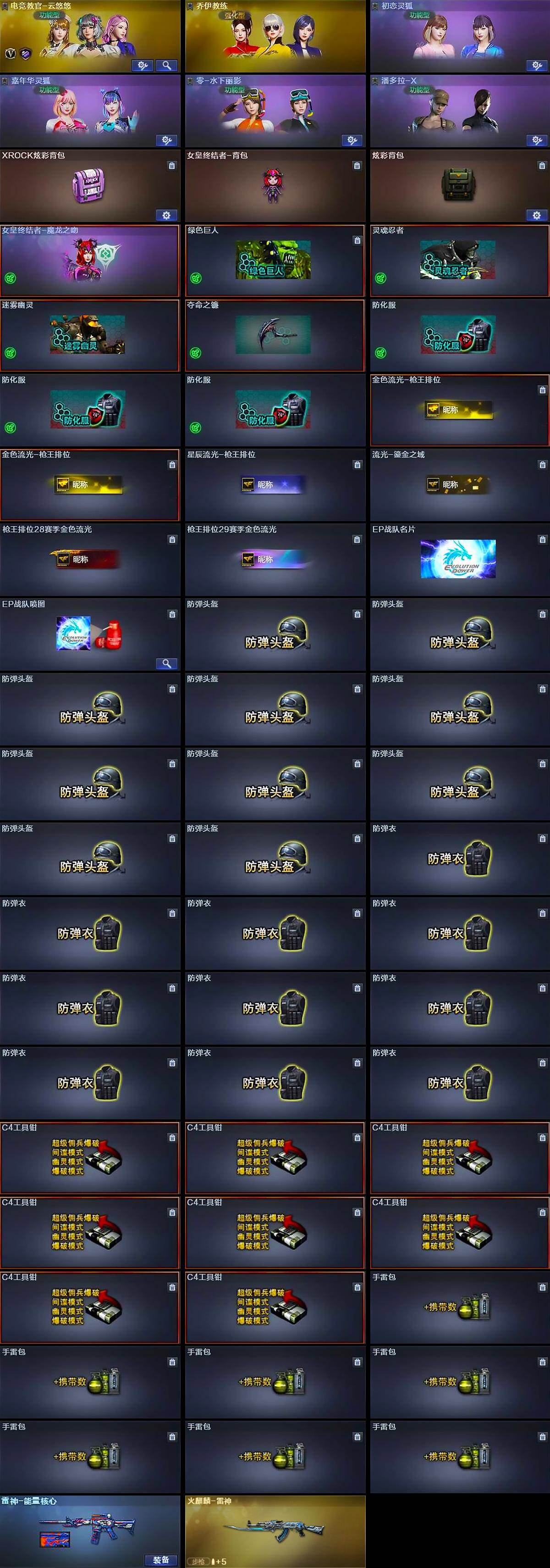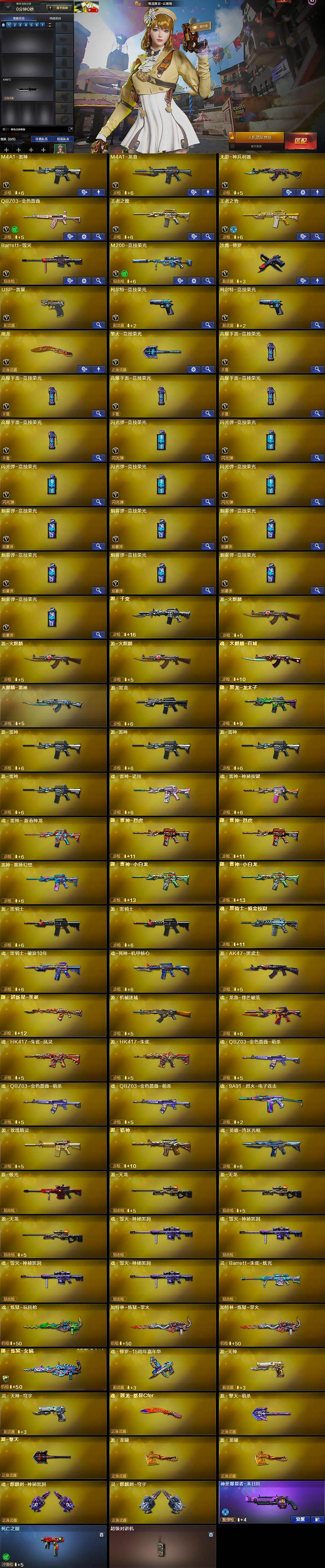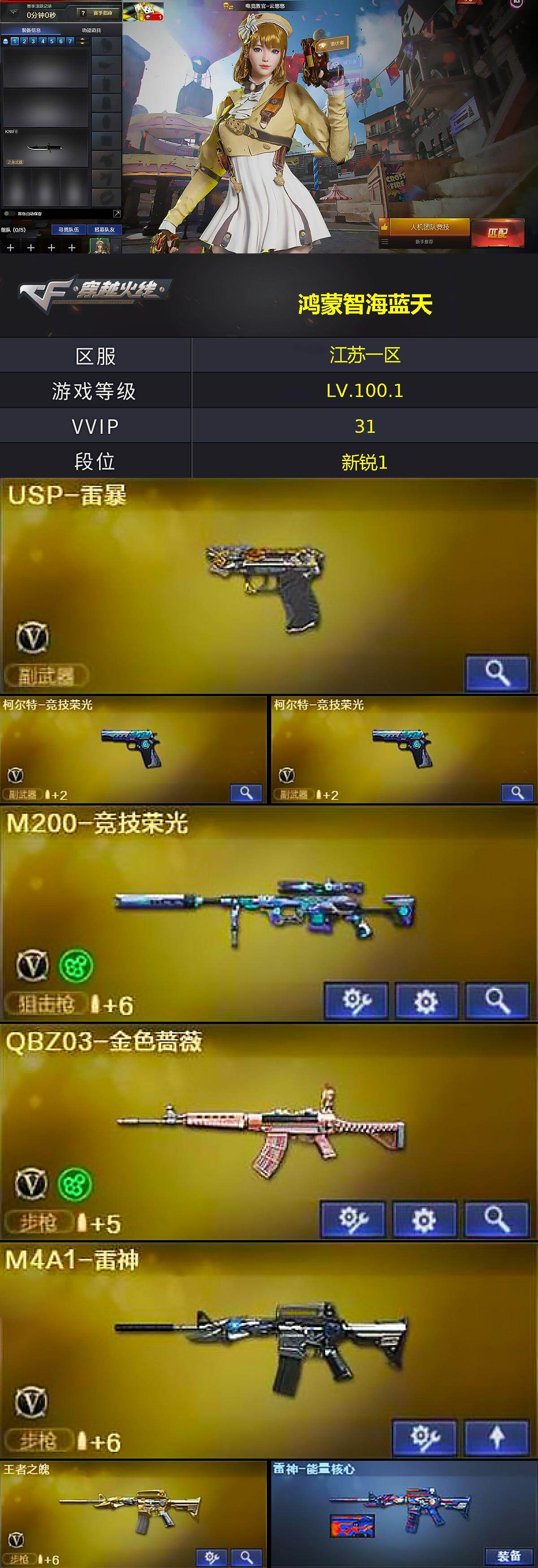 江苏一区-33v-2王者武器数-0炫金武器数 【热门武器】:q03-金色蔷薇,m200-竞技荣光,死亡之眼,usp-雷暴,沙鹰-修罗 【皮肤】:雷神-能量核心,火麒麟-雷神 【角色】:电竞教官-云悠悠,乔伊教练,初恋灵狐,嘉年华灵狐,零-水下丽影,潘多拉-x 【暴走生化】:死亡之眼,超级对讲机 【挑战大师】:神圣爆裂者-末日iii 【英雄级武器】:m4a1-雷神,m4a1-龙血,无影-神兵