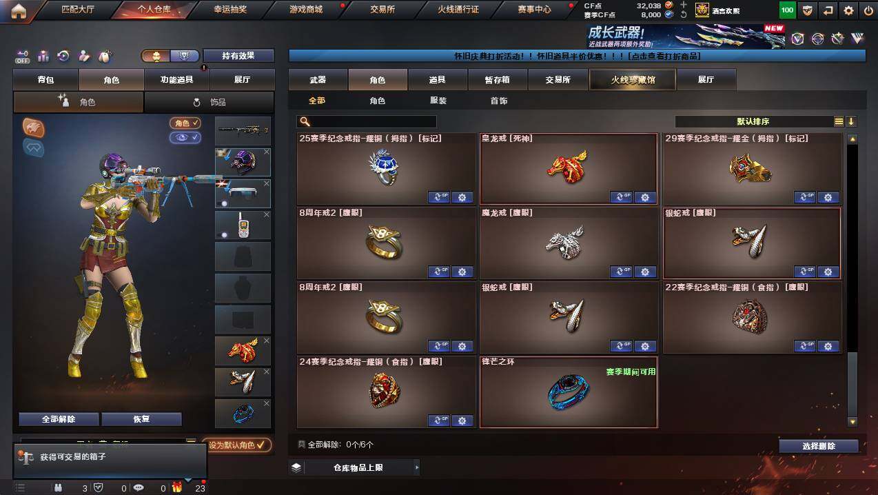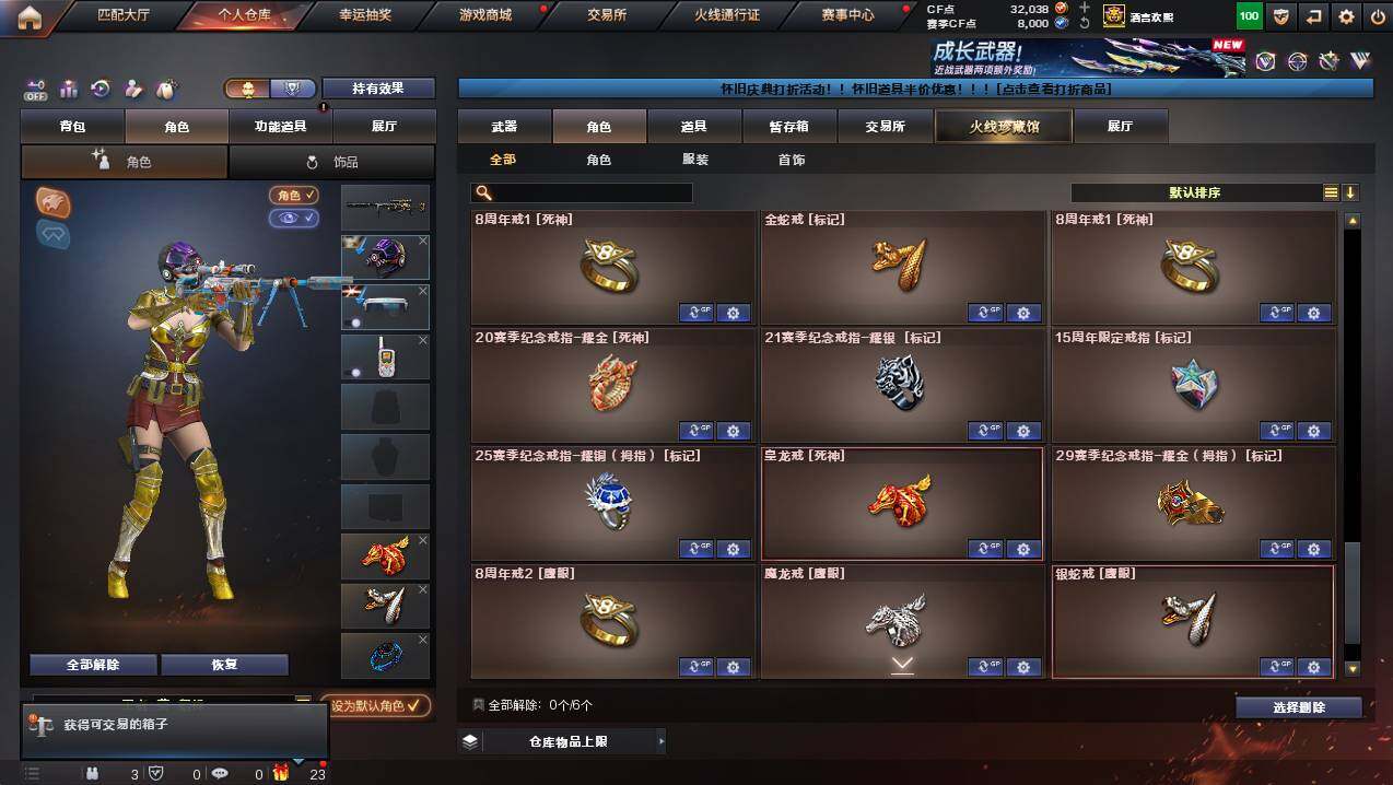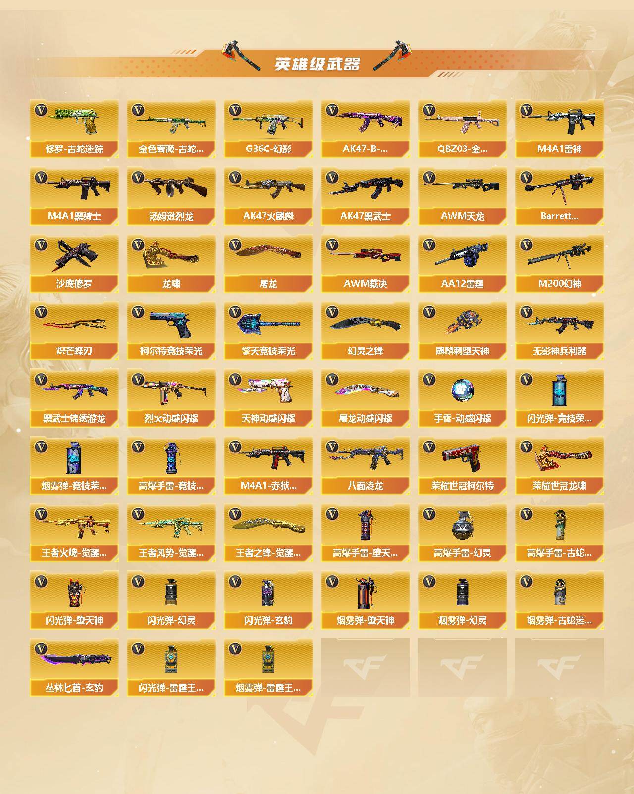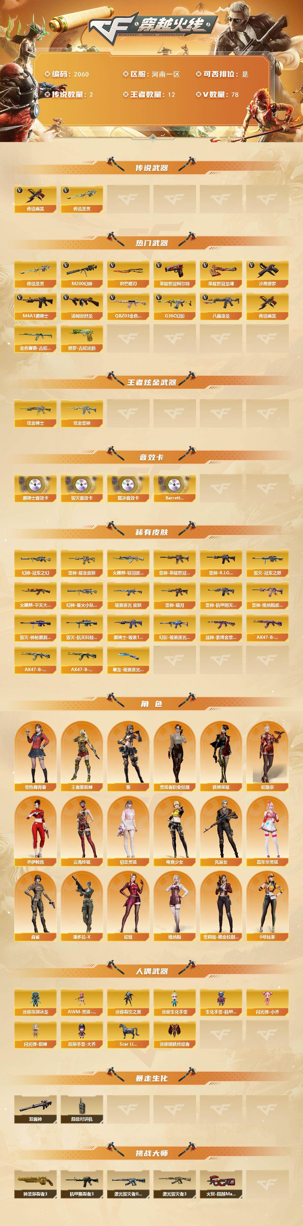 河南一区-78v-12王者武器数-2炫金武器数 【传说武器】:传说圣灵,传说幽冥 【热门武器】:传说圣灵,传说幽冥,g36c-幻影,q03-金色蔷薇,m200-幻神,金色蔷薇-古蛇迷踪,修罗-古蛇迷踪,八面凌龙,荣耀世冠-柯尔特,m4a1-黑骑士,汤姆逊-烈龙3,沙鹰-修罗2,炽芒蝶刃,荣耀世冠-龙啸 【王者炫金武器】:炫金骑士,炫金雷神 【音效卡】:m4a1-黑骑士音效卡,barre