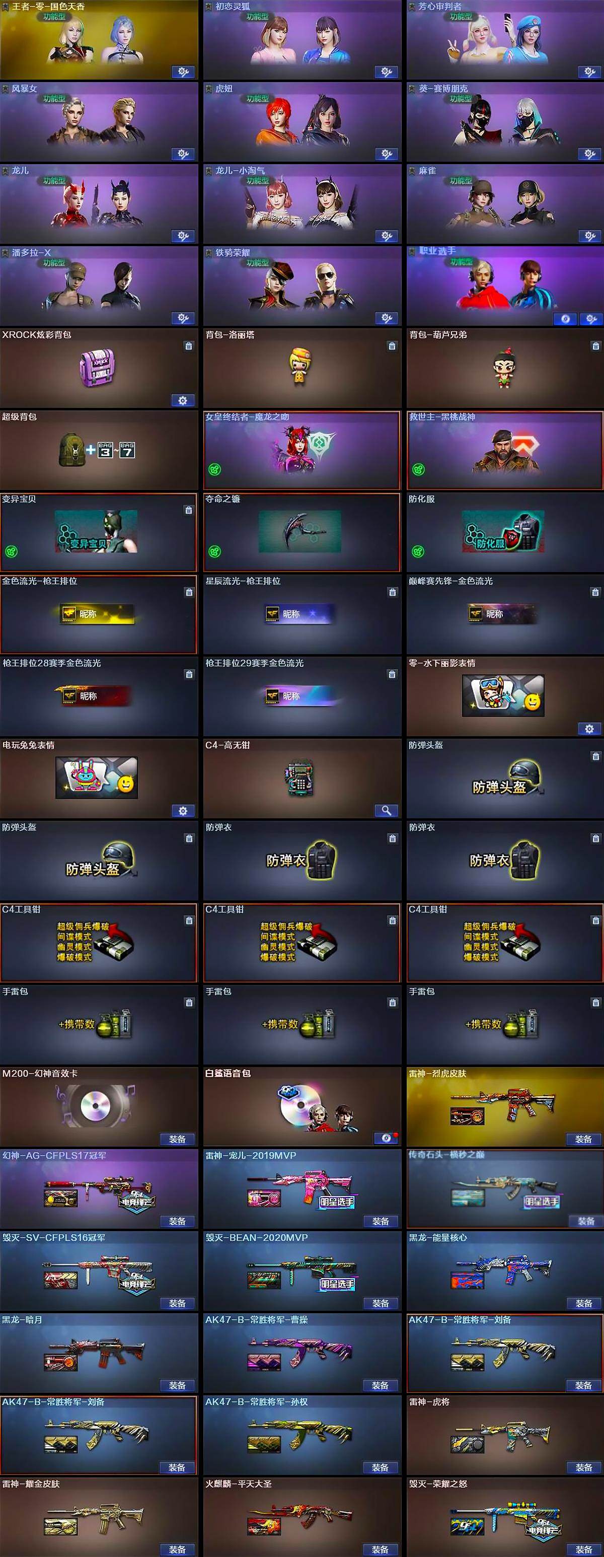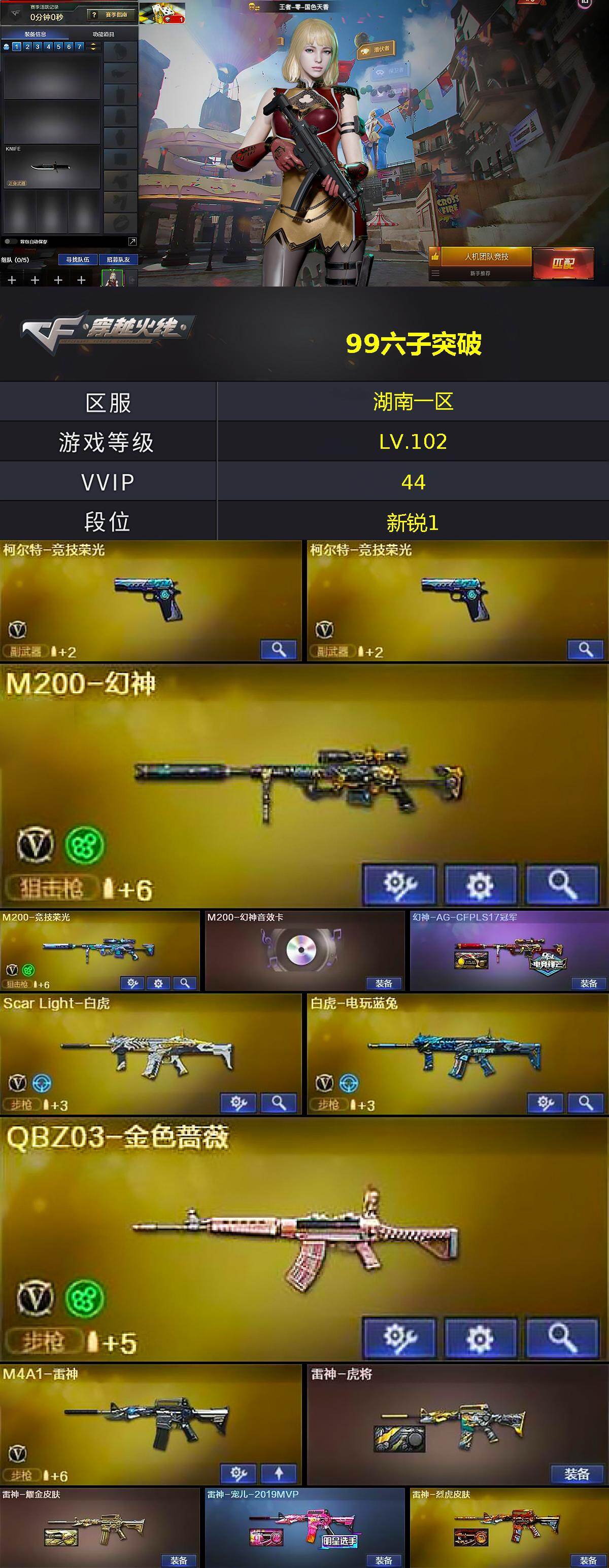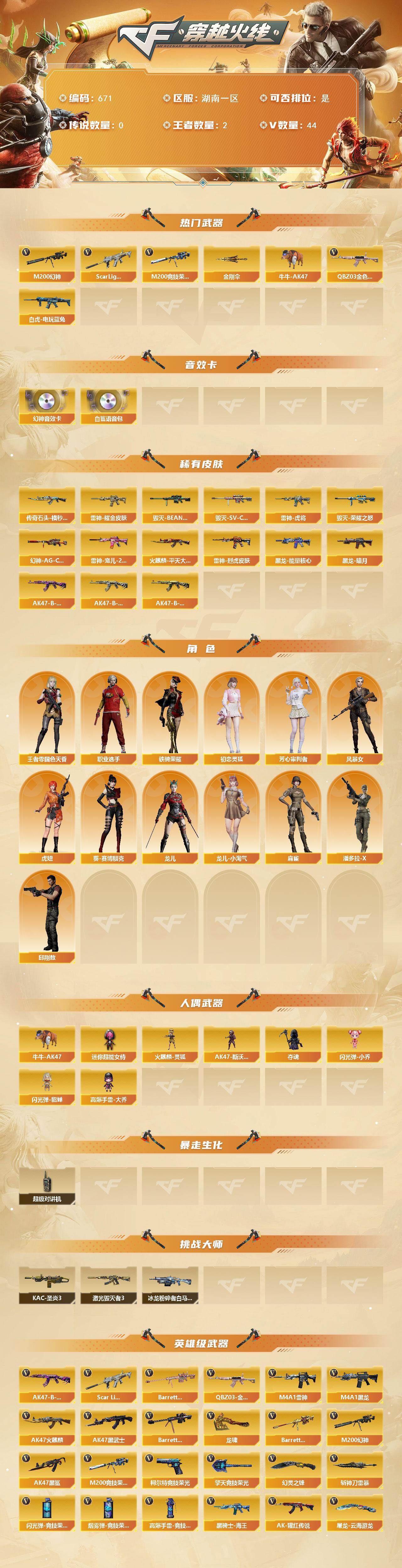 湖南一区-45v-2王者武器数-0炫金武器数 【热门武器】:q03-金色蔷薇,scar light-白虎,m200-幻神,m200-竞技荣光,白虎-电玩蓝兔,牛牛-ak47,金刚伞 【音效卡】:m200-幻神音效卡,白鲨语音包 【皮肤】:幻神-ag-cfpls17冠军,雷神-虎将,雷神-耀金皮肤,雷神-宠儿-2019mvp,雷神-烈虎皮肤,传奇石头-横秒之巅,火麒麟-平天大圣,毁灭-荣耀之怒,毁灭-sv-cfpls16冠军,毁灭-bean-2020mvp,黑龙-能量核心,黑龙-暗月,ak47-b-常胜将军-曹操,ak47-b-常胜将军-刘备2,ak47-b-常胜将军-孙权 【角色】:王者-零-国色天香,初恋灵狐,芳心审判者,风暴女,虎妞,葵-赛博朋克,龙儿,龙儿-小淘气,麻雀,潘多拉-x,邱刚敖,铁骑荣耀,职业选手 【人偶武器】:火麒麟-灵狐,牛牛-ak47,夺魂,闪光丹-小乔,闪光丹-貂蝉,高爆手蕾-大乔,ak47-斯沃特,迷你超能女侍 【暴走生化】:超级对讲机 【挑战大师】:冰龙粉碎者-白马银呛,激光毁灭者iii,kac-圣炎切割者iii 【英雄级武器】:ak47-火麒麟,m4a1-黑龙2,m4a1-雷神,ak47-黑武士,ak47-黑鲨,scar light-白虎,q03-金色蔷薇,ak-47-猩红传说3,黑骑士-海王,ak47-b-常胜将军,白虎-电玩蓝兔,barrett-毁灭,m200-幻神,barrett-朱雀,m200-竞技荣光,barrett-金色蔷薇,柯尔特-竞技荣光2,龙啸3,幻灵之锋,擎天-竞技荣光,斩神刀-雷暴,屠龙-云海游龙,王者之啸-觉醒版,高爆手蕾-雷暴,高爆手蕾-幻灵,高爆手蕾-竞技荣光,闪光丹-雷暴,闪光丹-竞技荣光,盐雾蛋-雷暴,盐雾蛋-幻灵2,盐雾蛋-竞技荣光,m4a1-赤狱骑士 【道具】:xrock炫彩背包,背包-洛丽塔,背包-葫芦兄弟,超级背包,女皇终结者-魔龙之吻,救世主-黑桃战神,变异宝贝,夺命之镰,防化服,金色流光-呛王排位,星辰流光-呛王排位,巅峰赛先锋-金色流光,呛王排位28赛季金色流光,呛王排位29赛季金色流光,零-水下丽影表情,电玩兔兔表情,c4-高无钳,防弹头盔2,防弹衣2,c4工具钳3,手蕾包3 【特殊呛械】:1白虎