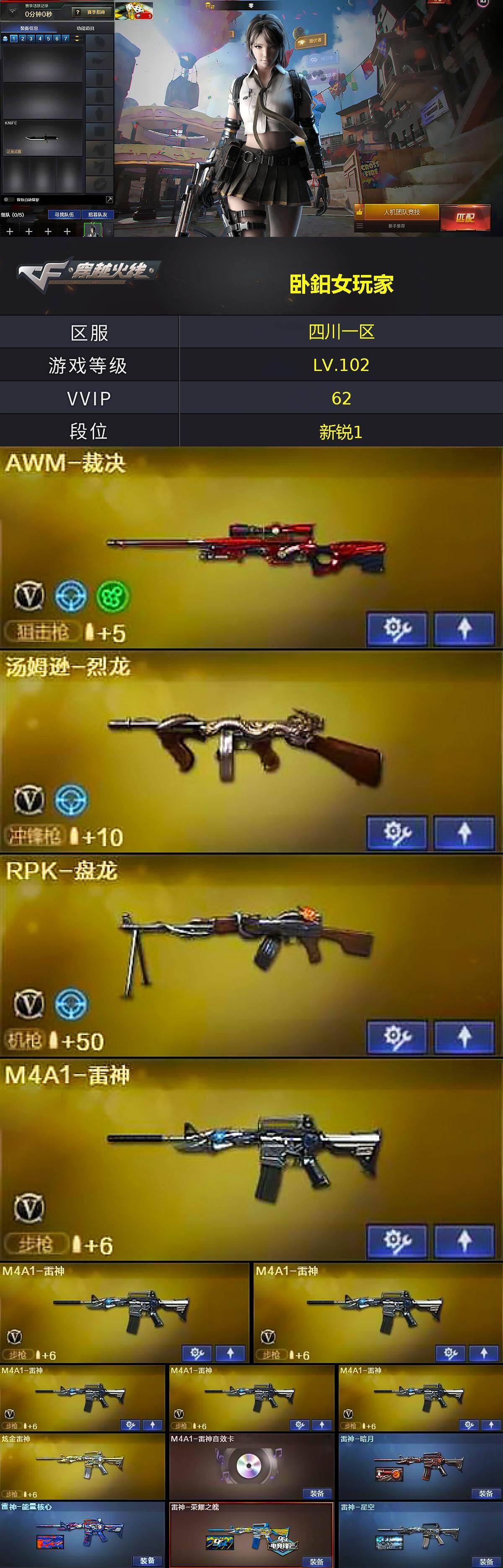四川一区-64v-4王者武器数-1炫金武器数 【热门武器】:死亡之眼,m4a1-黑骑士,汤姆逊-烈龙,rpk-盘龙,沙鹰-修罗5 【王者炫金武器】:炼狱-悦蓝2,炫金雷神 【音效卡】:ak47-火麒麟音效卡,m4a1-雷神音效卡,barrett-毁灭音效卡 【皮肤】:雷神-暗月,雷神-能量核心,雷神-荣耀之魄,雷神-星空,火麒麟-雷神,火麒麟-平天大圣,毁灭-荣耀之怒2,毁灭-星空,毁灭
