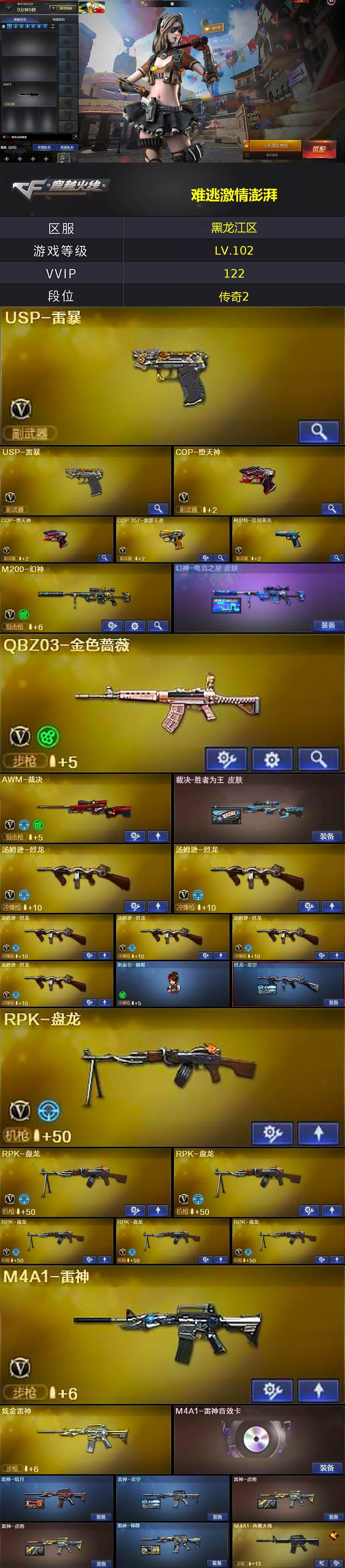 黑龙江区-129v-3王者武器数-3炫金武器数 【热门武器】:q03-金色蔷薇,hk417-朱雀,m4a1-青龙,m200-幻神,毒蜂,m4a1-黑骑士,汤姆逊-烈龙6,rpk-盘龙6,加特林-炼狱2,斯泰尔-蝴蝶,火麒麟-绝迹,usp-雷暴2,cop-堕天神2,沙鹰-修罗4,金刚伞 【王者炫金武器】:炫金骑士,炫金雷神,炫金毁灭 【音效卡】:ak47-火麒麟音效卡,m4a1-