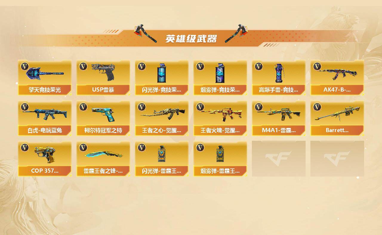 山东一区-50v-10王者武器数-3炫金武器数 【传说武器】:传说光耀,传说辉光 【热门武器】:传说光耀,传说辉光,q03-金色蔷薇,scar light-白虎,m200-幻神,m200-竞技荣光2,白虎-电玩蓝兔,柯尔特-冠军之特2,m4a1-黑骑士,汤姆逊-烈龙,usp-雷暴,沙鹰-修罗2,knife-冠军之刃 【王者炫金武器】:炫金骑士,炫金雷神,炫金毁灭 【音效卡】:m200