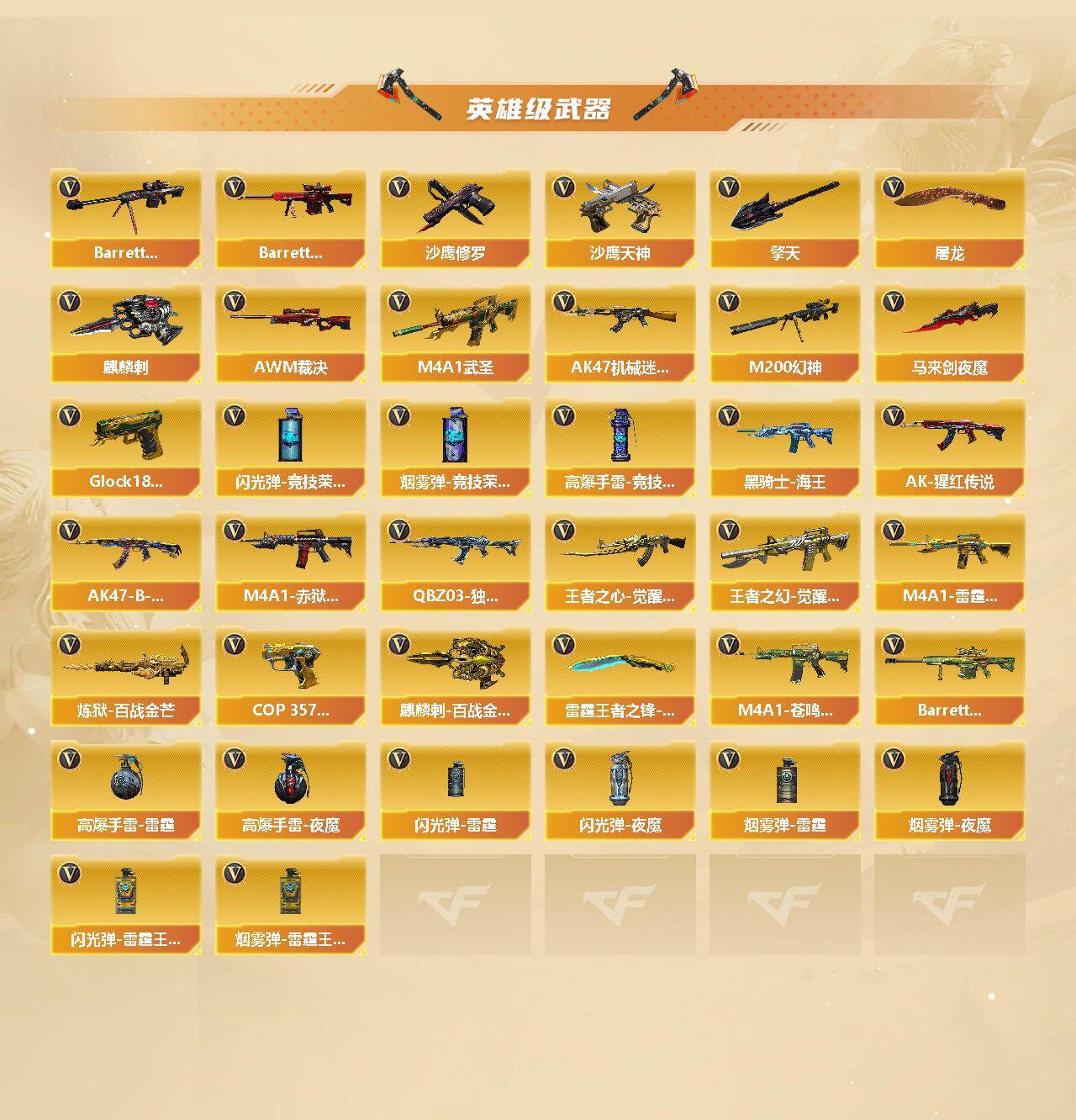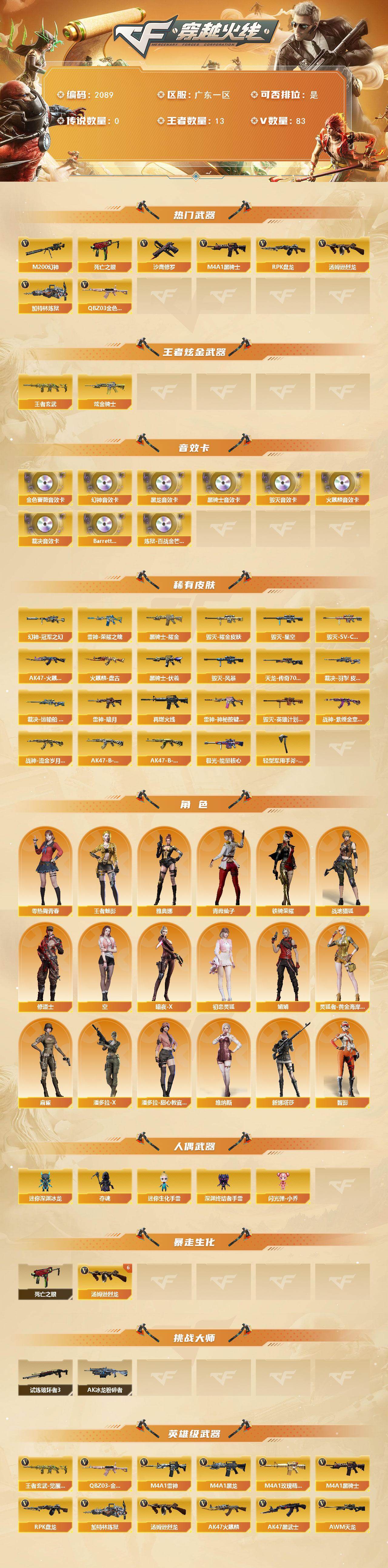 广东一区-83v 【热门武器】:q03-金色蔷薇,m200-幻神,死亡之眼,m4a1-黑骑士,汤姆逊-烈龙6,rpk-盘龙3,加特林-炼狱,沙鹰-修罗5 【王者炫金武器】:王者玄武,炫金骑士 【音效卡】:m200-幻神音效卡,ak47-火麒麟音效卡,m4a1-黑龙音效卡,m4a1-黑骑士音效卡,barrett-毁灭音效卡,q03-金色蔷薇音效卡,awm-裁决音效卡,barrett