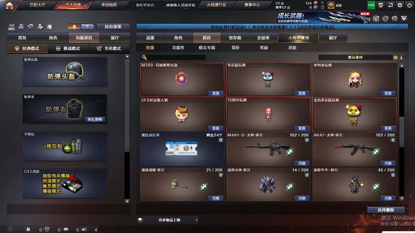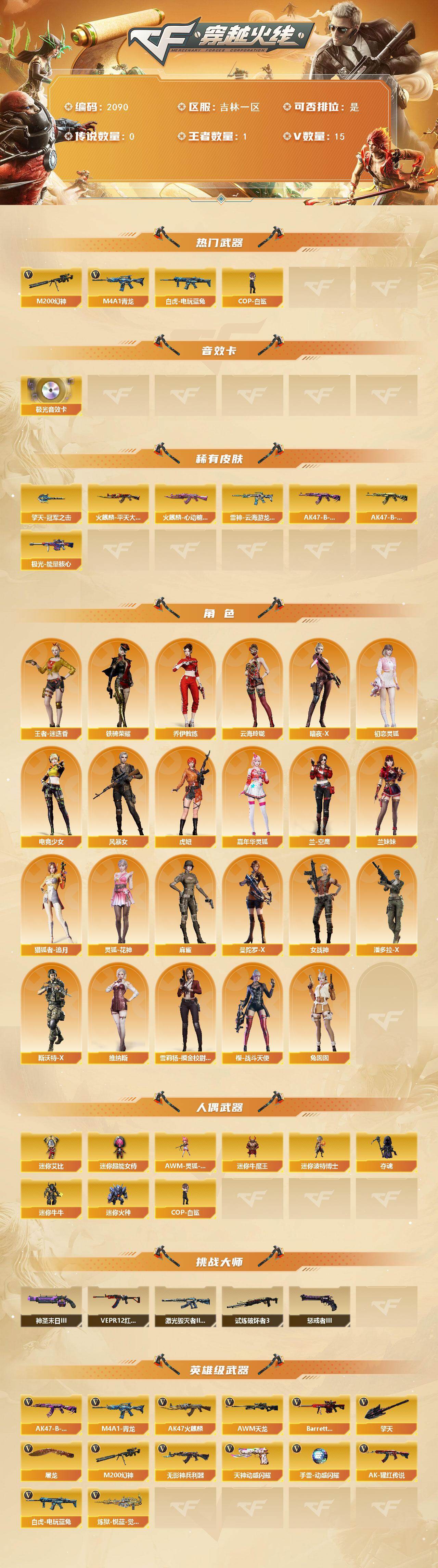 吉林一区-16v 【热门武器】:m4a1-青龙,m200-幻神,白虎-电玩蓝兔,cop-白鲨 【音效卡】:barrett-极光音效卡 【皮肤】:雷神-云海游龙皮肤,火麒麟-平天大圣,火麒麟-心动糖果,ak47-b-常胜将军-曹操,ak47-b-常胜将军-孙权2,极光-能量核心,擎天-冠军之击 【角色】:王者-迷迭香,乔伊教练,云海玲珑,暗夜-x,初恋灵狐,电竞少女,风暴女,虎妞,嘉年华灵狐,