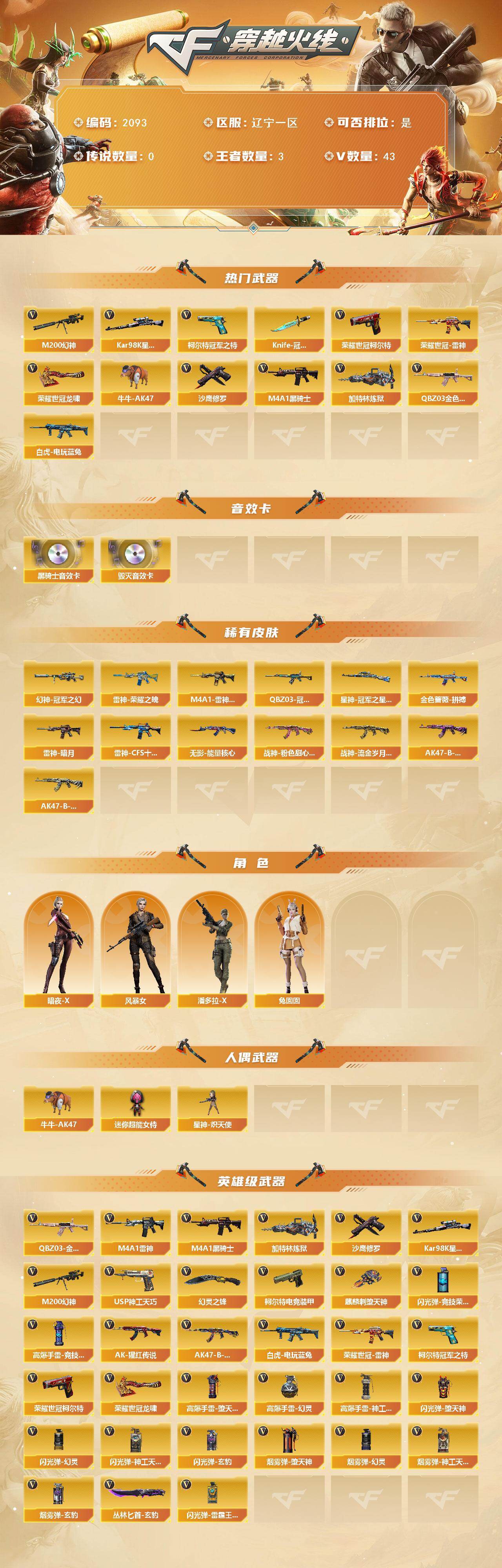 辽宁一区-40v 【热门武器】:q03-金色蔷薇,m200-幻神,荣耀世冠-雷神,白虎-电玩蓝兔,柯尔特-冠军之特,荣耀世冠-柯尔特,kar98k-星神,牛牛-ak47,m4a1-黑骑士,加特林-炼狱,沙鹰-修罗2,knife-冠军之刃,荣耀世冠-龙啸 【音效卡】:m4a1-黑骑士音效卡,barrett-毁灭音效卡 【皮肤】:幻神-冠军之幻,q03-冠军之薇,q03-金色蔷薇-拼