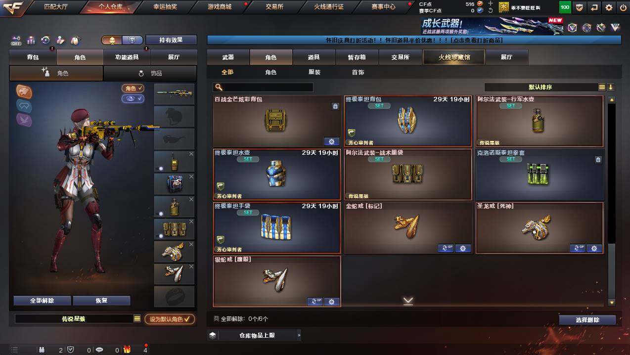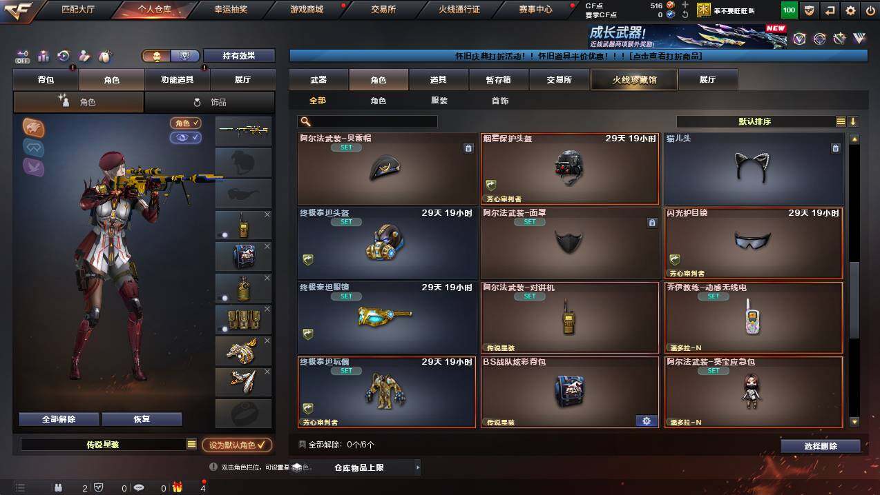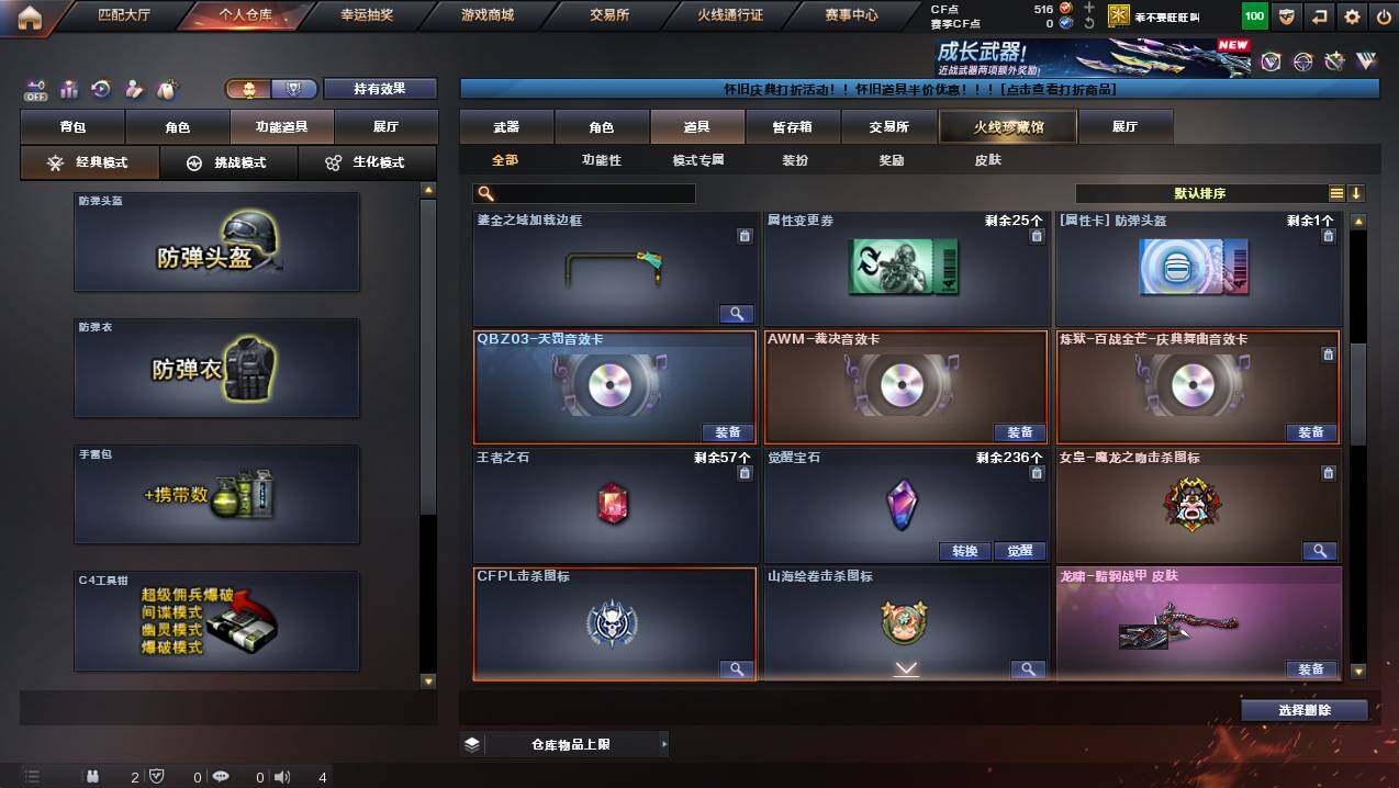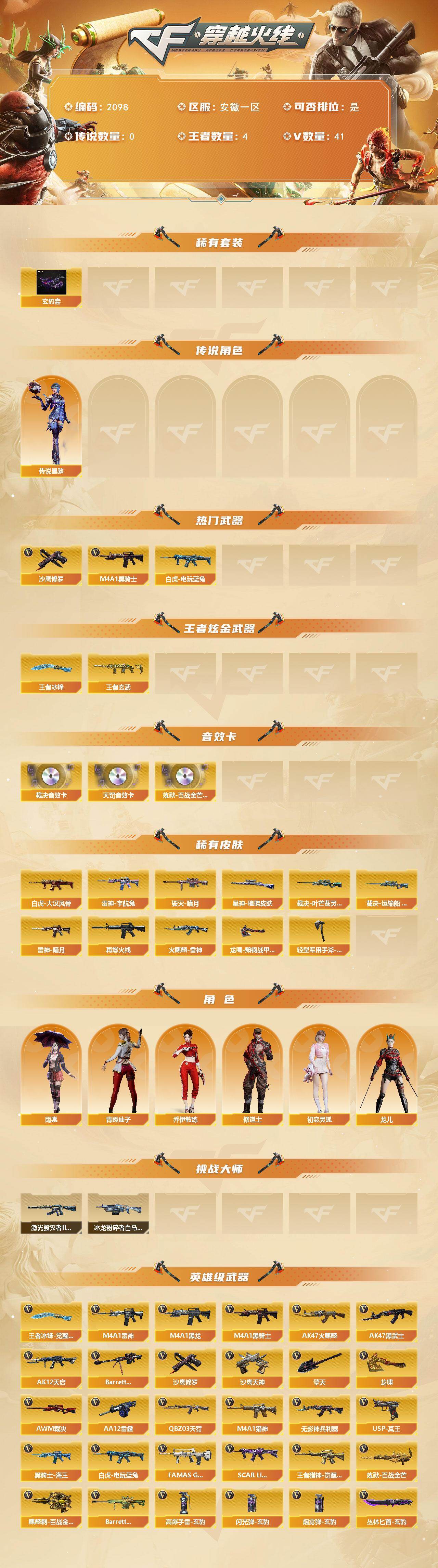 安徽一区-41v-4王者武器数-0炫金武器数 【传说角色】:传说星骇 【热门武器】:白虎-电玩蓝兔,m4a1-黑骑士,沙鹰-修罗 【王者炫金武器】:王者玄武,王者冰锋2 【音效卡】:awm-裁决音效卡,q03-天罚音效卡,炼狱-百战金芒-庆典舞曲音效卡 【皮肤】:白虎-大汉风骨,裁决-叶芒苍灵 皮肤,裁决-运输船 皮肤,星神-璀璨皮肤,雷神-暗月,雷神-宇航兔皮肤,m4a1-再燃火线,火