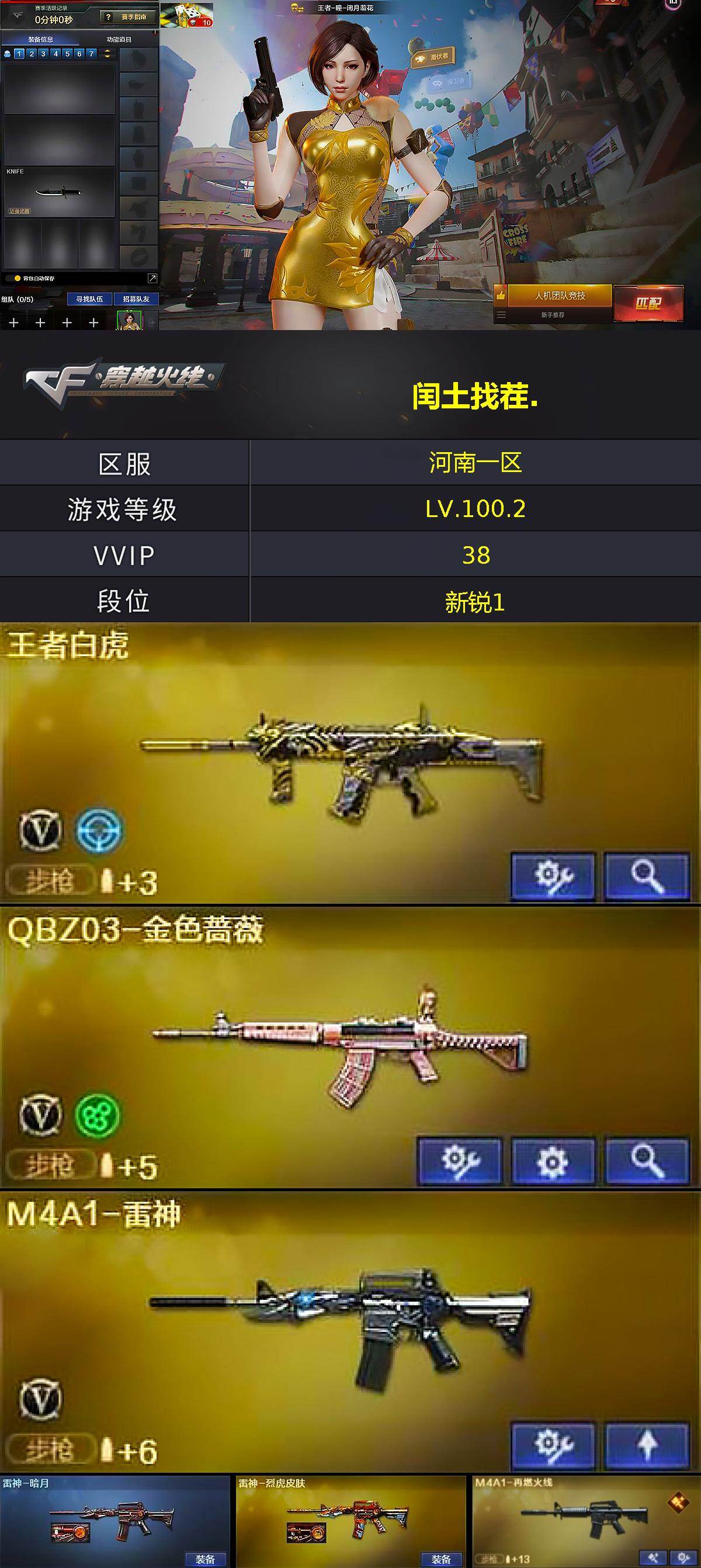 河南一区-49v-8王者武器数-2炫金武器数 【热门武器】:q03-金色蔷薇,m4a1-黑骑士,降世魔童,cop-白鲨,沙鹰-修罗,金刚伞 【王者炫金武器】:炫金毁灭2,王者之魄闪光丹2 【音效卡】:m4a1-黑骑士音效卡,barrett-碧霄极光音效卡,炼狱-百战金芒-庆典舞曲音效卡 【皮肤】:雷神-暗月,雷神-烈虎皮肤,m4a1-再燃火线,火麒麟-雷神,火麒麟-华夏之心,毁灭耀金皮
