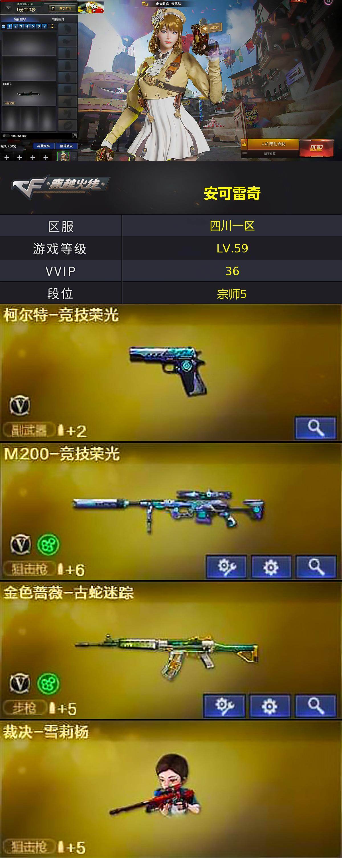 四川一区-33v-1王者武器数-0炫金武器数 【热门武器】:金色蔷薇-古蛇迷踪,修罗-古蛇迷踪,m200-竞技荣光,cat-刀锋,牛牛-ak47,裁决-雪莉杨 【王者炫金武器】:王者蔷薇 【音效卡】:m4a1-黑骑士音效卡 【角色】:电竞教官-云悠悠,蛇隐宗,潘多拉-甜心教官,蛇姬,兔囡囡 【人偶武器】:裁决-雪莉杨,m4a1-雷神-精英刀锋,cat-刀锋,牛牛-ak47,生化手蕾-机甲核心