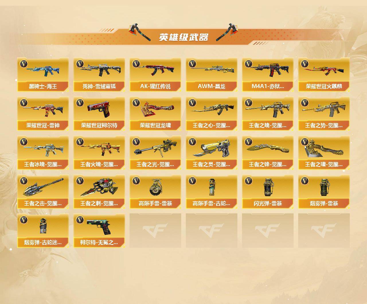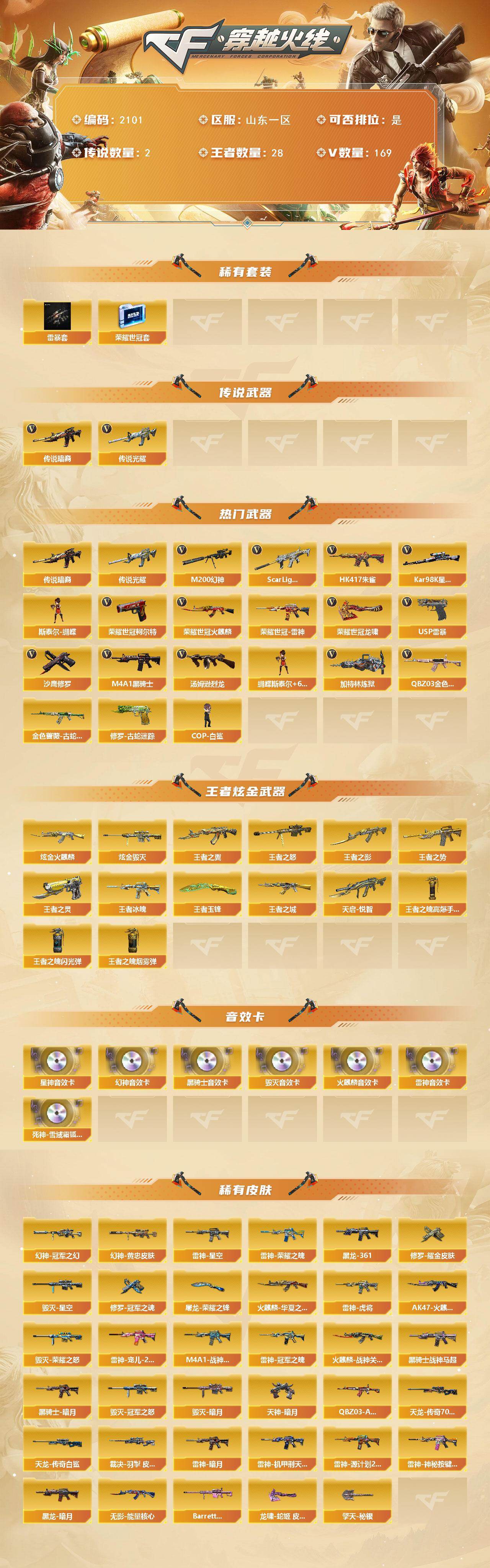 山东一区-169v 【传说武器】:传说光耀,传说暗裔 【热门武器】:传说光耀,传说暗裔,q03-金色蔷薇2,scar light-白虎,hk417-朱雀,m200-幻神,金色蔷薇-古蛇迷踪,修罗-古蛇迷踪,荣耀世冠-火麒麟,荣耀世冠-雷神,荣耀世冠-柯尔特,kar98k-星神,m4a1-黑骑士,汤姆逊-烈龙6,加特林-炼狱2,斯泰尔-蝴蝶,cop-白鲨2,usp-雷暴,沙鹰-修罗