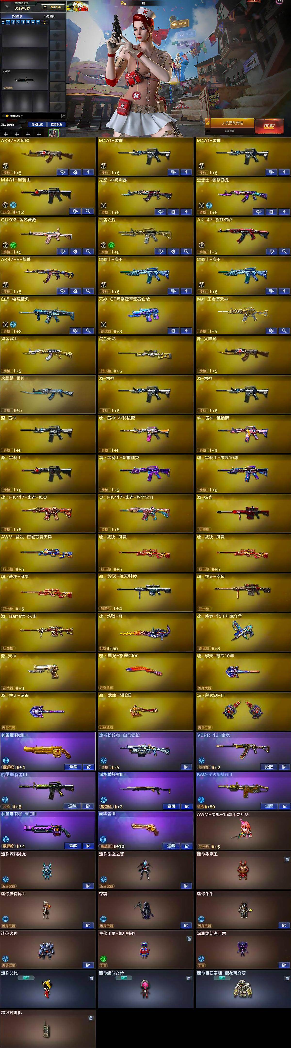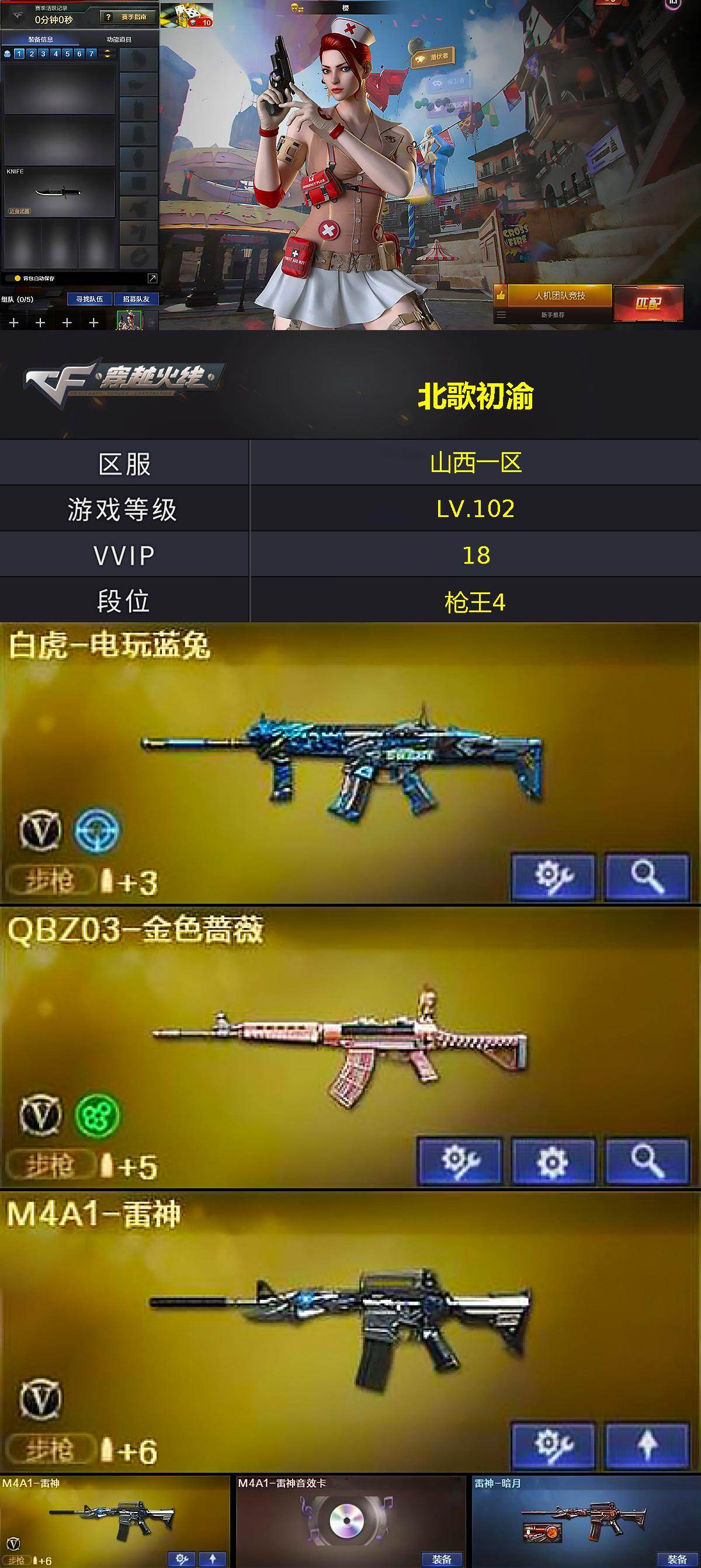 山西一区-19v-2王者武器数-2炫金武器数 【热门武器】:q03-金色蔷薇,白虎-电玩蓝兔,m4a1-黑骑士 【王者炫金武器】:m4a1-王者堕天神,炫金武士,炫金天龙 【音效卡】:m4a1-雷神音效卡 【皮肤】:雷神-暗月,火麒麟-雷神,火麒麟-心动糖果,毁灭-黑大圣皮肤,m4a1-千变-孔明皮肤,黑骑士-电玩青兔皮肤,无影-能量核心,战神-紫绶金章皮肤2,战神-流金岁月皮肤,ak47-b-常胜将军-孙权,炼狱-星空 【角色】:樱,暗夜-x,北极狐-x,初恋灵狐,电竞少女,芳心审判者,飞虎队-x,风暴女,虎妞,嘉年华灵狐,娟娟,猎狐者-追月,灵狐者-x,龙儿-小淘气,麻雀,曼陀罗-x,潘多拉-x,潘多拉-甜心教官,潜龙队-x,邱刚敖,青霞仙子,斯沃特-x,铁骑荣耀,兔囡囡,影武者-x,游珑儿 【人偶武器】:awm-灵狐-15周年嘉年华,迷你深渊冰龙,迷你裂空之翼,迷你牛魔王,迷你波特博士,夺魂,迷你牛牛,迷你火种,生化手蕾-机甲核心,深渊终结者手蕾,迷你艾比,迷你超能女侍,迷你巨石泰坦-魔花研究所,灵狐娃娃手蕾 【暴走生化】:超级对讲机 【挑战大师】:神圣爆裂者iii,冰龙粉碎者-白马银呛,vepr-12-金魔,机甲撕裂者iii,试炼破坏者iii,kac-圣炎切割者iii,神圣爆裂者-末日iii,阐释者iii 【英雄级武器】:ak47-火麒麟,m4a1-雷神2,m4a1-黑骑士,无影-神兵利器,黑武士-锦绣游龙,q03-金色蔷薇,王者之戮-觉醒版,ak-47-猩红传说,ak47-b-战神,黑骑士-海王2,白虎-电玩蓝兔,天神-cf网剧冠军 【道具】:xrock炫彩背包,全能呛王背包,冰冰企鹅背包-猛男专用,机械魔影背包-红色,超级背包,妖姬,生化弹匣,夺命之镰2,防化服3,金色流光-呛王排位2,星辰流光-呛王排位,呛王排位28赛季金色流光,电玩兔兔表情,ep战队名片,防弹头盔9,防弹衣9,c4工具钳4,手蕾包5 【特殊呛械】:1黑骑士