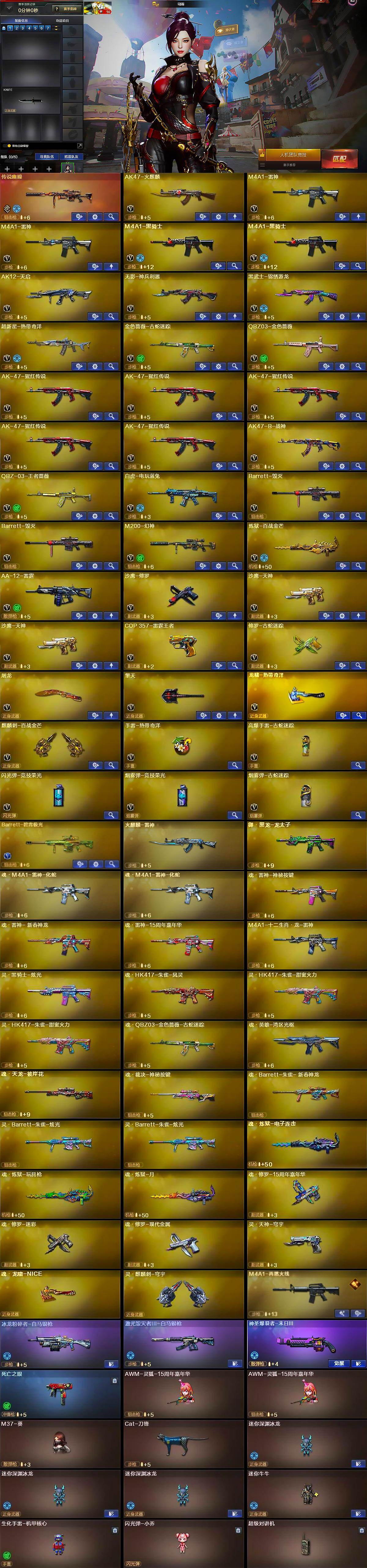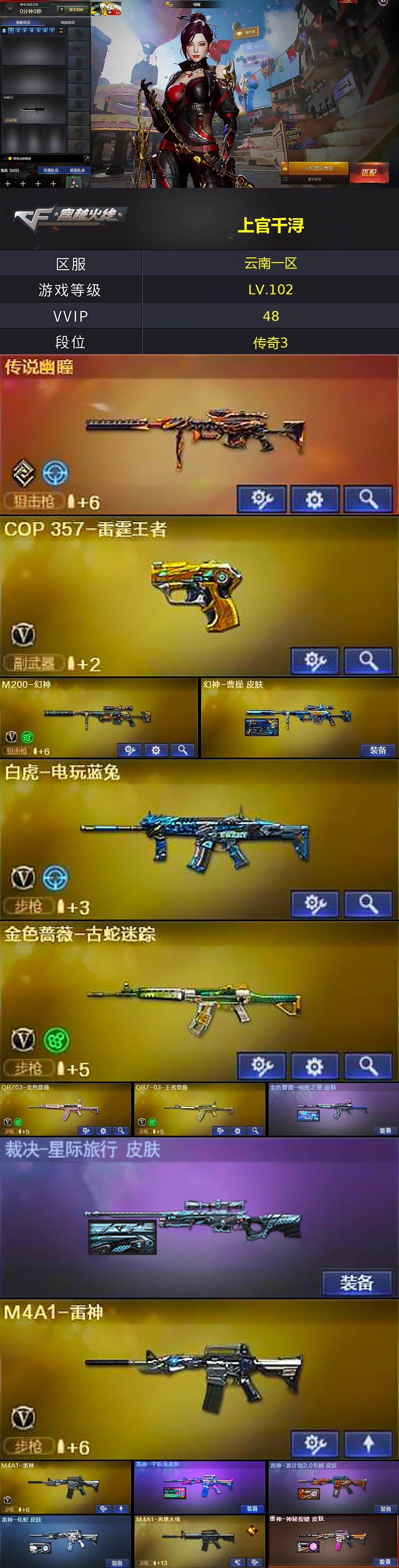 云南一区-48v-2王者武器数-0炫金武器数 【传说武器】:传说幽瞳 【热门武器】:传说幽瞳,q03-金色蔷薇,m200-幻神,金色蔷薇-古蛇迷踪,修罗-古蛇迷踪,死亡之眼,白虎-电玩蓝兔,cat-刀锋,m4a1-黑骑士2,羊驼玩偶,沙鹰-修罗 【音效卡】:m4a1-黑骑士音效卡,麒麟刺-百战金芒-盛典舞曲音效卡,炼狱-百战金芒-庆典舞曲音效卡 【皮肤】:幻神-曹操 皮肤,金色蔷薇-电竞