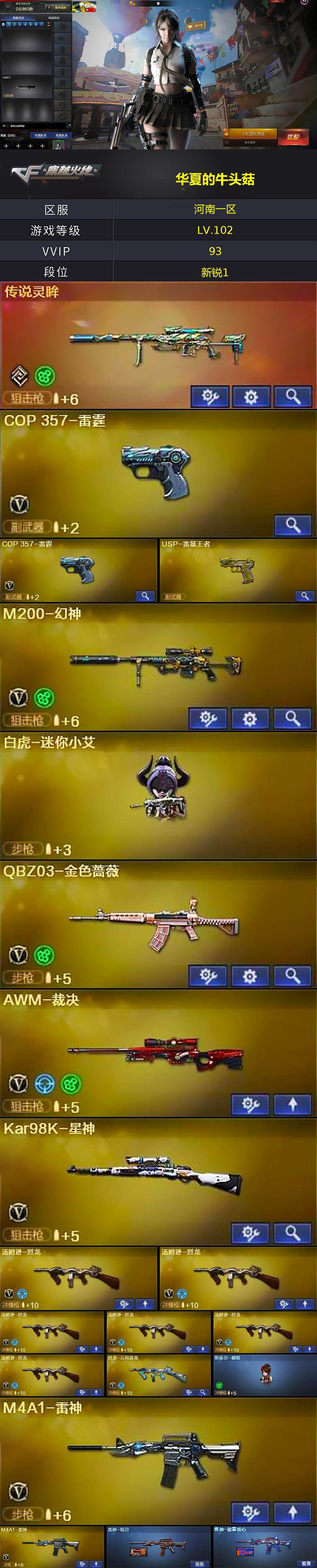 河南一区-97v-9王者武器数-0炫金武器数 【传说武器】:传说灵眸 【热门武器】:传说灵眸,q03-金色蔷薇,hk417-朱雀,m200-幻神,死亡之眼2,kar98k-星神,金色小号,炼狱-迷你小钢,m4a1-黑骑士4,汤姆逊-烈龙6,加特林-炼狱7,斯泰尔-蝴蝶,沙鹰-修罗4,黄