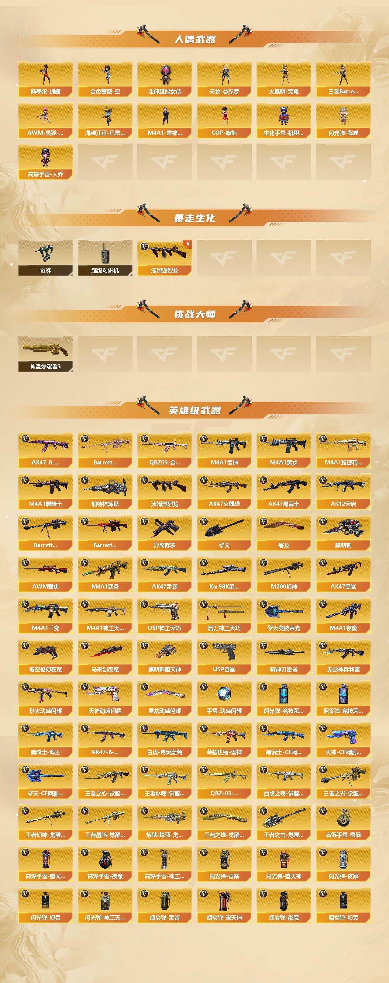 [16633194]南方大区-114v-12王者-2炫金 【热门武器】:q03-金色蔷薇,m200-幻神,荣耀世冠-雷神,白虎-电玩蓝兔,kar98k-星神,毒蜂2,m4a1-黑骑士3,汤姆逊-烈龙6,加特林-炼狱,金色蔷薇-空,斯泰尔-蝴蝶,usp-雷暴,沙鹰-修罗4,金刚伞 【王者炫金武器】:王者之城,王者之武,炫金天龙2 【音效卡】:烈火-动感闪耀 音效卡,m200-幻神音效卡,ak47-火麒麟音效卡,m4a1-雷神音效卡,m4a1-黑骑士音效卡,barrett-毁灭音效卡,barrett-极光音效卡,scar light-白虎音效卡,70kg语音包,白鲨语音包 【皮肤】:幻神-巅峰荣耀,m200-幻神-荣耀世冠白鲨,白虎-大汉风骨,q03-荣耀世冠白鲨,雷神-暗月,雷神-荣耀之魄,雷神-耀金皮肤,雷神-烈虎皮肤,雷神-宇航兔皮肤,火麒麟-盘古,火麒麟-大唐荣光,火麒麟-心动糖果,毁灭-荣耀之怒,毁灭-冠军之怒,毁灭-纸鸢皮肤,m4a1-千变-孔明皮肤,黑龙-能量核心,黑骑士-冠军之势,无影-能量核心,黑武士-典韦皮肤,天启-暗月,战神-粉色甜心皮肤2,ak47-b-常胜将军-曹操,ak47-b-常胜将军-刘备3,ak47-b-常胜将军-孙权,极光-能量核心,炼狱-玩具呛皮肤,修罗-冠军之魂3,擎天-冠军之击 【角色】:葵,春,迷迭香,王者-瞳-闭月羞花,王者-葵-貂蝉,王者春,王者玲珑,王者玲珑-小乔,堕落女神,乔伊教练,暗夜-x,初恋灵狐,芳心审判者,风暴女2,虎妞,嘉年华灵狐,兰-梨园特工,灵狐-花神,灵狐者-x,灵狐者-黄金海岸,龙儿,曼陀罗-x,曼陀罗-礼服,女主播,潘多拉-x,潘多拉-甜心教官,青霞仙子,斯沃特-x,铁骑荣耀,兔囡囡,夜玫瑰-幻能朋克,职业选手 【人偶武器】:天龙-曼陀罗,火麒麟-灵狐,王者barrett-英勇金戈,m4a1-雷神-精英刀锋,金色蔷薇-空,斯泰尔-蝴蝶,awm-灵狐-15周年嘉年华,海滩汪汪-芭蕾特,cop-旗袍,生化手蕾-机甲核心,闪光丹-貂蝉,高爆手蕾-大乔,迷你超能女侍 【暴走生化】:毒蜂2,超级对讲机 【挑战大师】:神圣爆裂者iii 【英雄级武器】:m4a1-千变,ak47-火麒麟2,m4a1-黑龙,m4a1-雷神,m4a1-黑骑士3,ak47-黑武士,ak12-天启,m4a1-武圣,ak47-