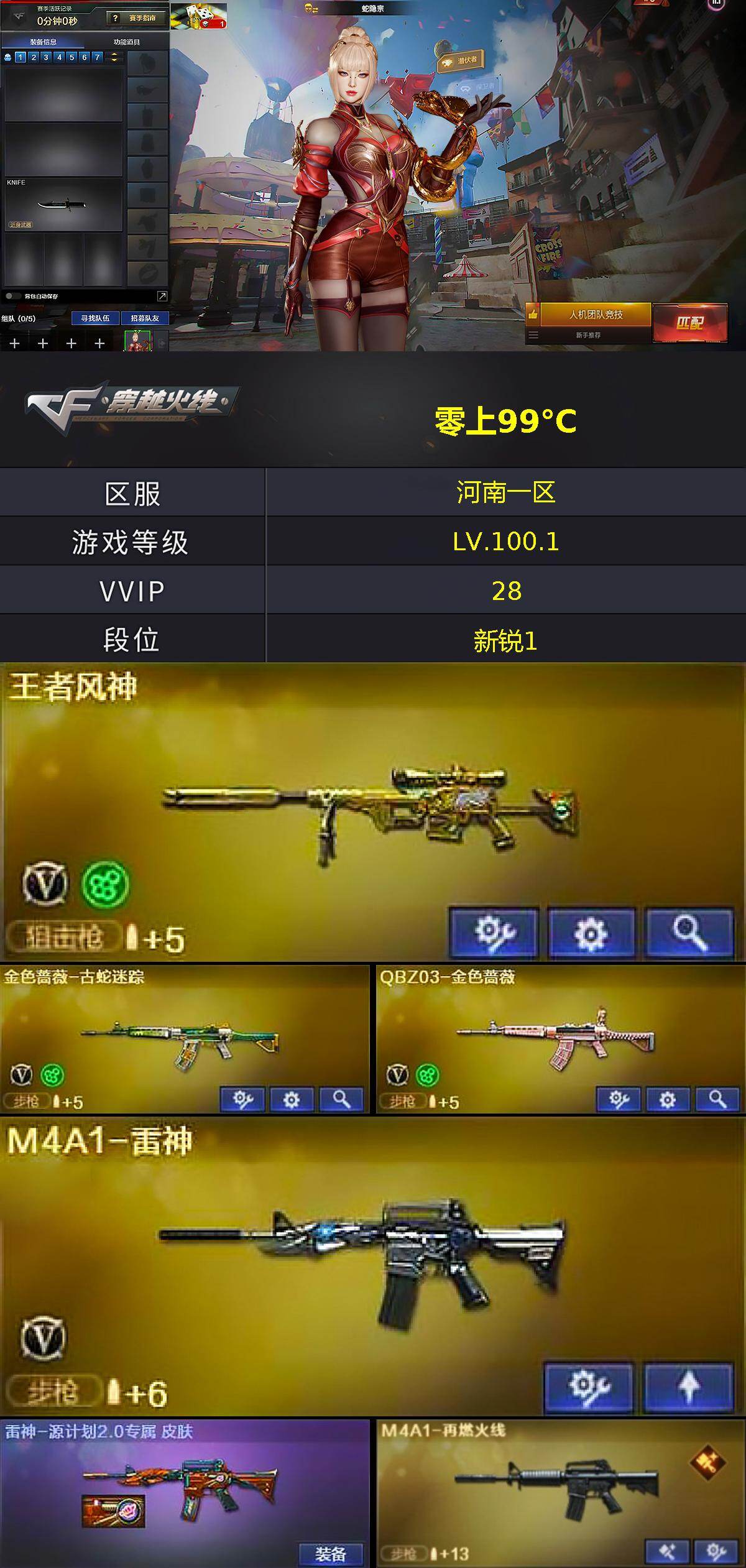河南一区-26v-1王者武器数-0炫金武器数 【热门武器】:q03-金色蔷薇,m4a1-青龙,金色蔷薇-古蛇迷踪,修罗-古蛇迷踪,金色小号,雷神-小红 【音效卡】:炼狱-百战金芒-庆典舞曲音效卡 【皮肤】:雷神-源计划2.0专属 皮肤,m4a1-再燃火线,轻型军用手斧-再燃火线 【角色】:蛇隐宗