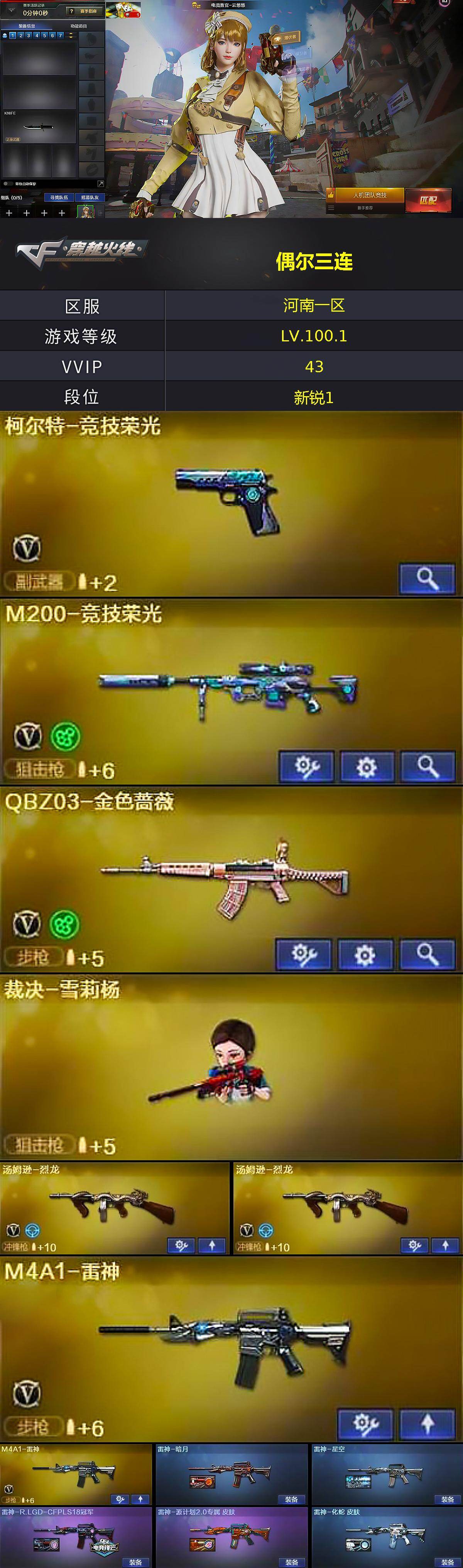 河南一区-43v-0王者武器数-0炫金武器数 【热门武器】:q03-金色蔷薇,m200-竞技荣光,cat-刀锋,牛牛-ak47,汤姆逊-烈龙2,裁决-雪莉杨,沙鹰-修罗2 【音效卡】:barrett-毁灭音效卡 【皮肤】:雷神-暗月,雷神-星空,雷神-r.lgd-cfpls18冠军,雷神-源计划2.0专属 皮肤,雷神-化蛇 皮肤,火麒麟-百城,毁灭-黑大圣皮肤,毁灭-直播专属,毁灭-航天科技皮肤,毁灭-英雄计划 皮肤,烈火-动感闪耀 皮肤,轻型军用手斧-再燃火线,麒麟刺-萌杀皮肤 【角色】:电竞教官-云悠悠,战地猎狐,乔伊教练,修道士,云海玲珑,暗夜-x,芳心审判者,风暴女,嘉年华灵狐,兰-空鹰,灵狐-花神,灵狐者-x,麻雀,曼陀罗-x,玫瑰花神,萌儿,女主播,潘多拉-x,斯沃特-x,游珑儿 【人偶武器】:裁决-雪莉杨,scar light-马呛,awm-灵狐-15周年嘉年华,cat-刀锋,牛牛-ak47,迷你牛魔王,迷你牛牛,迷你艾比 【挑战大师】:冰龙粉碎者-白马银呛4,kac-圣炎切割者iii,神圣爆裂者-末日iii 【英雄级武器】:ak47-火麒麟,m4a1-雷神2,m4a1-武圣,q03-天罚,无影-神兵利器,黑武士-锦绣游龙,q03-金色蔷薇,awm-天龙,barrett-毁灭,m200-竞技荣光,汤姆逊-烈龙2,沙鹰-修罗2,沙鹰-天神,柯尔特-竞技荣光,屠龙,麒麟刺,擎天-竞技荣光,麒麟刺-百战金芒,高爆手蕾-竞技荣光8,闪光丹-竞技荣光3,盐雾蛋-竞技荣光3,m4a1-赤狱骑士,awm-昌龙 【道具】:cfs限定背包,云山科技背包,亚洲杯纪念炫彩背包,全能呛王背包,炫彩背包,超级背包,女皇终结者-魔龙之吻,救世主-黑桃战神,绿色巨人,灵魂忍者,迷雾幽灵,夺命之镰,防化服3,金色流光-呛王排位2,呛王排位28赛季金色流光,呛王排位29赛季金色流光,语音特效-盛典烟火,萌萌小葵表情,炽雪表情,ep战队名片,ep战队喷图,ep战队击杀图标,c4-再燃火线,防弹头盔3,防弹衣3,c4工具钳3,手蕾包3 【特殊呛械】:2烈龙