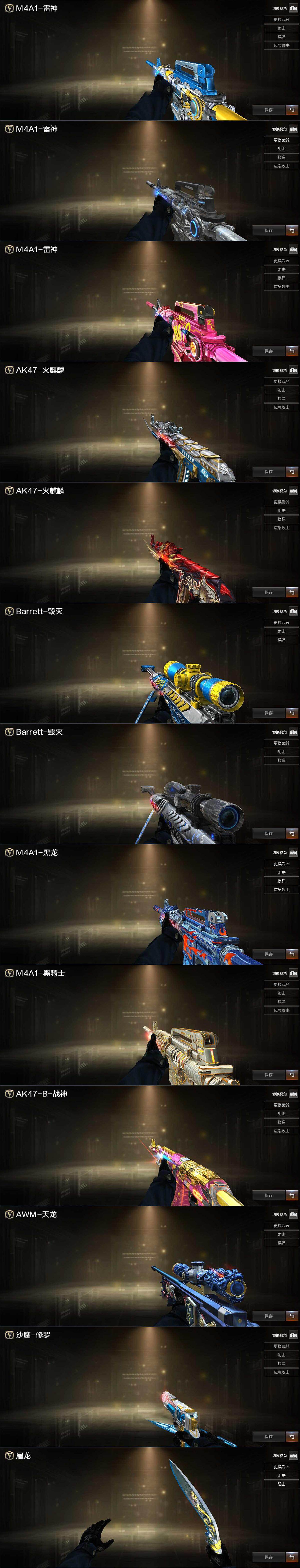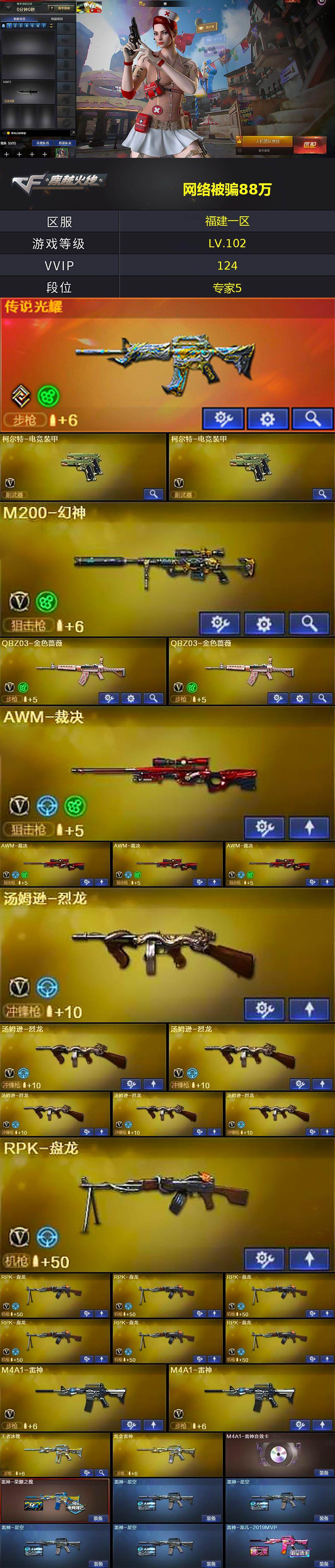 福建一区-127v-7王者武器数-2炫金武器数 【传说武器】:传说光耀 【热门武器】:传说光耀,q03-金色蔷薇2,m200-幻神,死亡之眼,m4a1-黑骑士,汤姆逊-烈龙6,rpk-盘龙7,加特林-炼狱3,羊驼玩偶,沙鹰-修罗3 【王者炫金武器】:王者冰魄,王者之影,炼狱-悦蓝,王者之灵,炫金雷神,炫金武士 【音效卡】:ak47-火麒麟音效卡,m4a1-雷神音效卡,m4a1-黑