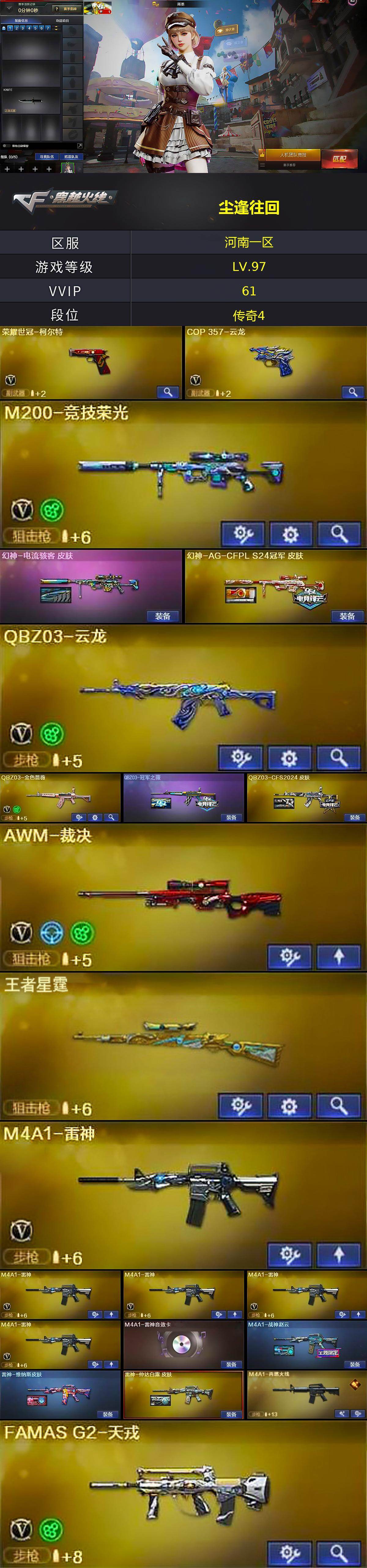 河南一区-65v-15王者武器数-1炫金武器数 【热门武器】:q03-金色蔷薇,m200-竞技荣光,青龙之魄,荣耀世冠-火麒麟,荣耀世冠-柯尔特,毒蜂,m4a1-黑骑士,加特林-炼狱,王者ak47-萌萌银发刀锋,cop 357-雷霆王者2 【王者炫金武器】:m4a1-雷霆王者,青龙之魄,王者玄武,王者星霆,cop 357-雷霆王者2,雷霆王者之锋,炫金骑士 【音效卡】:ak47-火麒麟音效卡,m4a1-雷神音效卡,m4a1-黑骑士音效卡,q03-天罚音效卡,m14ebr-玄武音效卡,炼狱-百战金芒-庆典舞曲音效卡 【皮肤】:幻神-电流骇客 皮肤,幻神-ag-cfpl s24冠军 皮肤,q03-冠军之薇,q03-cfs2024 皮肤,m4a1-战神赵云,雷神-维纳斯皮肤,雷神-仲达白露 皮肤,m4a1-再燃火线,火麒麟-巅峰荣耀,毁灭-暗月,毁灭-sv-cfpls16冠军,毁灭-战神张飞,毁灭-风暴,毁灭-神秘黑洞皮肤,毁灭-星耀 皮肤,毁灭-梦蝶 皮肤,毁灭-秦师 皮肤,毁灭-英雄计划 皮肤,m4a1-千变-孔明皮肤,黑龙-能量核心,黑骑士-cfs2021,黑骑士-破浪10年皮肤,黑骑士-破界 皮肤,无影-能量核心,修罗耀金皮肤,轻型军用手斧-再燃火线,擎天-冠军之击 【角色】:雨墨,机械姬,华,蛇隐宗,奇洋探员,炽天使,电竞少女,飞虎队-x,兰妹妹,猎狐者-追月,潘多拉-甜心教官,蛇姬,维纳斯,新娜塔莎,夜玫瑰-宠粉,樱-战斗天使 【人偶武器】:火麒麟-灵狐,王者ak47-萌萌银发刀锋,迷你泡泡象,ak47-红水晶-斯沃特精英,cop-旗袍,迷你牛牛2,生化手蕾-机甲核心2 【暴走生化】:毒蜂,黑龙吞噬者 【挑战大师】:冰龙粉碎者-白马银呛 【英雄级武器】:ak47-火麒麟3,m4a1-雷神5,m4a1-黑骑士,ak12-天启,an94-超新星,ak47-黑鲨,q03-天罚,q03-云龙,黑武士-锦绣游龙,超新星-热带奇洋,famas g2-天戎,q03-金色蔷薇,王者猎神-觉醒版,王者玄武-觉醒版,荣耀世冠-火麒麟,barrett-毁灭,awm-裁决,m200-竞技荣光,加特林-炼狱,炼狱-百战金芒,沙鹰-天神2,荣耀世冠-柯尔特,cop 357-云龙,王者之魂-觉醒版,擎天,龙啸-热带奇洋,麒麟刺-百战金芒,高爆手蕾-云龙7,手蕾-热带奇洋,闪光丹-云龙6,闪光丹-雷霆王者-觉醒版,盐雾蛋-云龙5,盐雾蛋-雷霆王者-觉醒版2,m4a1-赤狱骑士 【道具】:cfpl炫彩背包,cfs限定背包,ep战队炫彩背包,奇洋探员-海龟背包,热带奇洋炫彩背包,百战金芒炫彩背包,超级背包,女皇终结者-魔龙之吻,救世主-黑桃战神,绿色巨人,灵魂忍者,迷雾幽灵,生化弹匣,夺命之镰,防化服2,巅峰赛先锋-金色流光,呛王排位28赛季金色流光,呛王排位29赛季金色流光,语音特效-盛典烟火,语音特效-机器人2,语音特效-生化,萌萌小葵表情,热带奇洋表情,ep战队收纳包,防弹头盔2,防弹衣2,c4工具钳2,手蕾包2 【特殊呛械】:1黑骑士,1炼狱