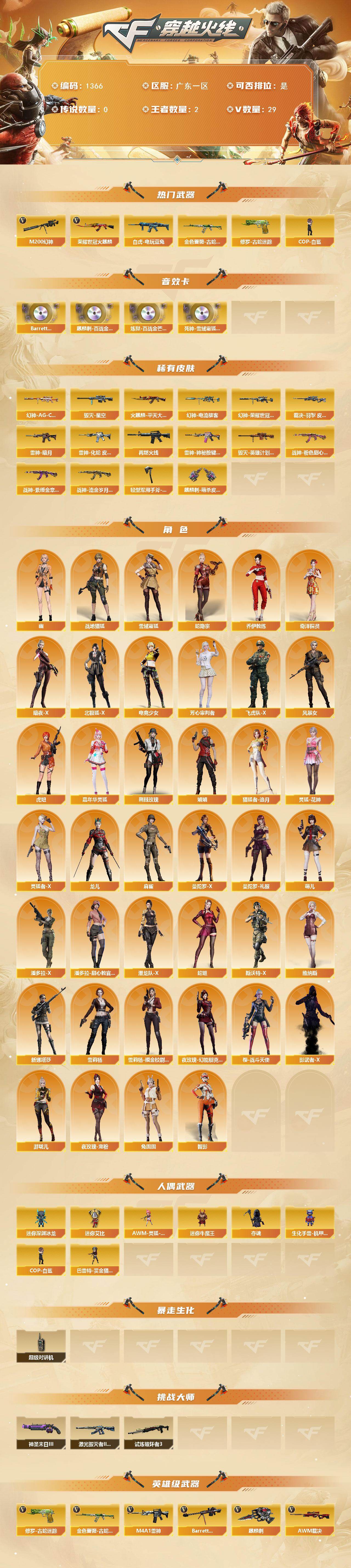 [16636484]广东一区-29v-2王者-0炫金 【热门武器】:m200-幻神,金色蔷薇-古蛇迷踪,修罗-古蛇迷踪,荣耀世冠-火麒麟,白虎-电玩蓝兔,cop-白鲨 【音效卡】:barrett-碧霄极光音效卡,麒麟刺-百战金芒-盛典舞曲音效卡,炼狱-百战金芒-庆典舞曲音效卡,死神-雪域霜狐-怀旧音效卡 【皮肤】:幻神-电流骇客 皮肤,幻神-荣耀世冠白鲨2023 皮肤,幻神-ag-cfpl s24冠军 皮肤,裁决-羽掣 皮肤,雷神-暗月,雷神-化蛇 皮肤,m4a1-再燃火线,雷神-神秘按键 皮肤,火麒麟-平天大圣,毁灭-星空,毁灭-英雄计划 皮肤,战神-粉色甜心皮肤2,战神-紫绶金章皮肤,战神-流金岁月皮肤,轻型军用手斧-再燃火线,麒麟刺-萌杀皮肤 【角色】:战地猎狐,雪域霜狐,蛇隐宗,奇洋探员,乔伊教练,暗夜-x,北极狐-x,电竞少女,芳心审判者,飞虎队-x,风暴女,虎妞,嘉年华灵狐,荆棘玫瑰,娟娟,猎狐者-追月,灵狐-花神,灵狐者-x,龙儿,麻雀,曼陀罗-x,曼陀罗-礼服,萌儿,潘多拉-x,潘多拉-甜心教官,潜龙队-x,蛇姬,斯沃特-x,兔囡囡,维纳斯,新娜塔莎,雪莉杨,雪莉杨-摸金校尉,夜玫瑰-幻能朋克,夜玫瑰-宠粉,樱-战斗天使,影武者-x,幽,游珑儿,智影 【人偶武器】:cop-白鲨,awm-灵狐-15周年嘉年华2,迷你深渊冰龙2,迷你牛魔王,夺魂,生化手蕾-机甲核心,芭蕾特-赏金猎人,迷你艾比 【暴走生化】:超级对讲机 【挑战大师】:激光毁灭者iii-白马银呛,试炼破坏者iii,神圣爆裂者-末日iii 【英雄级武器】:m4a1-雷神2,无影-神兵利器,黑武士-锦绣游龙,超新星-热带奇洋,金色蔷薇-古蛇迷踪,死神-雪域霜狐,ak-47-猩红传说,黑骑士-海王2,白虎-电玩蓝兔,荣耀世冠-火麒麟,barrett-毁灭,awm-裁决,m200-幻神,炼狱-百战金芒,修罗-古蛇迷踪,麒麟刺,龙啸-热带奇洋,麒麟刺-百战金芒,雷霆王者之锋-觉醒版,丛林匕首-玄豹,高爆手蕾-云龙,手蕾-热带奇洋,高爆手蕾-古蛇迷踪,闪光丹-雷霆王者-觉醒版,盐雾蛋-古蛇迷踪,盐雾蛋-玄豹3,m4a1-赤狱骑士,m4a1-苍鸣雷神,barrett-碧霄极光 【道具】:bs战队炫彩背包,云山科技背包,全能呛王背包,冰冰企鹅背包,古蛇迷踪炫彩背包,奇洋探员-海龟背包,女皇终结者-背包,热带奇洋
