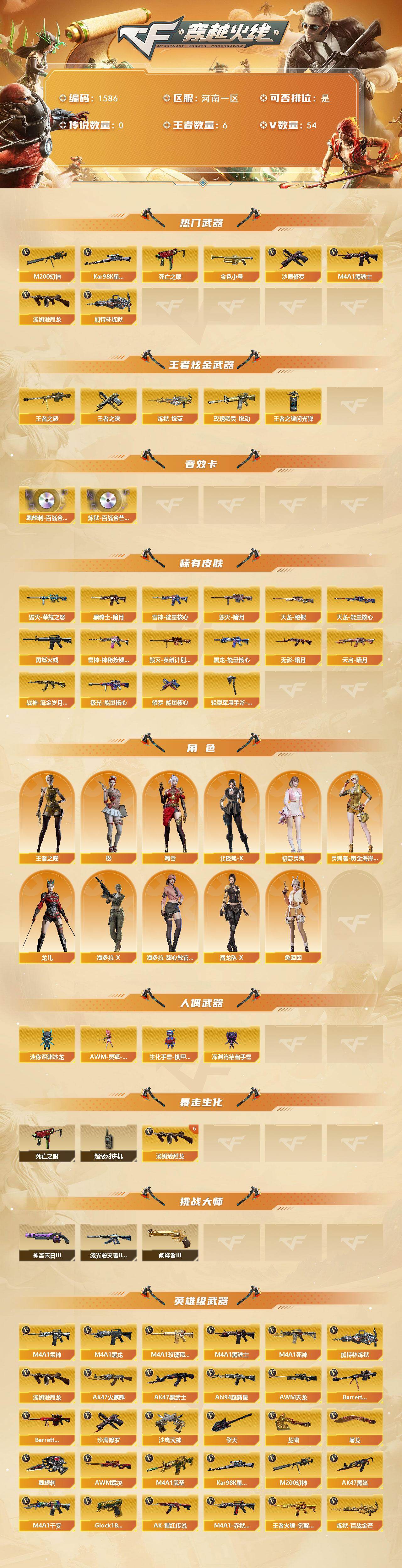 [16636521]河南一区-59v-6王者武器数-0炫金武器数 【热门武器】:m200-幻神,死亡之眼3,kar98k-星神,金色小号,m4a1-黑骑士,汤姆逊-烈龙6,加特林-炼狱,沙鹰-修罗3 【王者炫金武器】:玫瑰精灵-悦动,王者之怒,炼狱-悦蓝,王者之魂,王者之魄闪光丹 【音效卡】:麒麟刺-百战金芒-盛典舞曲音效卡,炼狱-百战金芒-庆典舞曲音效卡 【皮肤】:雷神-能量核心,m4a1-再燃火线,雷神-神秘按键 皮肤,毁灭-暗月,毁灭-荣耀之怒,毁灭-英雄计划 皮肤,黑龙-能量核心,黑骑士-暗月,无影-暗月,天启-暗月2,战神-流金岁月皮肤,天龙-秘银,天龙-能量核心,极光-能量核心,修罗-能量核心2,轻型军用手斧-再燃火线 【角色】:樱,王者之瞳,北极狐-x,初恋灵狐,灵狐者-黄金海岸,龙儿,潘多拉-x,潘多拉-甜心教官,潜龙队-x,蜀雪,兔囡囡 【人偶武器】:awm-灵狐-15周年嘉年华,迷你深渊冰龙,生化手蕾-机甲核心,深渊终结者手蕾 【暴走生化】:死亡之眼3,超级对讲机 【挑战大师】:激光毁灭者iii-白马银呛,神圣爆裂者-末日iii,阐释者iii 【英雄级武器】:m4a1-千变,ak47-火麒麟,m4a1-黑龙,m4a1-雷神2,m4a1-黑骑士,m4a1-死神,ak47-黑武士2,an94-超新星,m4a1-武圣,ak47-黑鲨,m4a1-玫瑰精灵,ak-47-猩红传说,王者火魄-觉醒版,awm-天龙,barrett-毁灭2,barrett-极光,awm-裁决,m200-幻神,kar98k-星神,加特林-炼狱,炼狱-百战金芒,汤姆逊-烈龙6,沙鹰-修罗3,沙鹰-天神2,glock18-武圣,屠龙3,龙啸,擎天2,麒麟刺,麒麟刺-百战金芒,m4a1-赤狱骑士,barrett-碧霄极光2 【道具】:bs战队炫彩背包,cfs限定背包,战舰背包,百战金芒炫彩背包,超级背包,圣拳猎手-炽雪,女皇终结者-魔龙之吻,救世主-黑桃战神,绿色巨人,灵魂忍者,变异宝贝,妖姬,迷雾幽灵,夺命之镰,防化服3,金色流光-呛王排位,星辰流光-呛王排位,呛王排位28赛季金色流光,呛王排位29赛季金色流光,语音特效-盛典烟火,萌萌小葵表情,ep战队名片,ep战队喷图,防弹头盔6,防弹衣6,c4工具钳3,手蕾包3 【特殊呛械】:1黑骑士,6烈龙,1炼狱