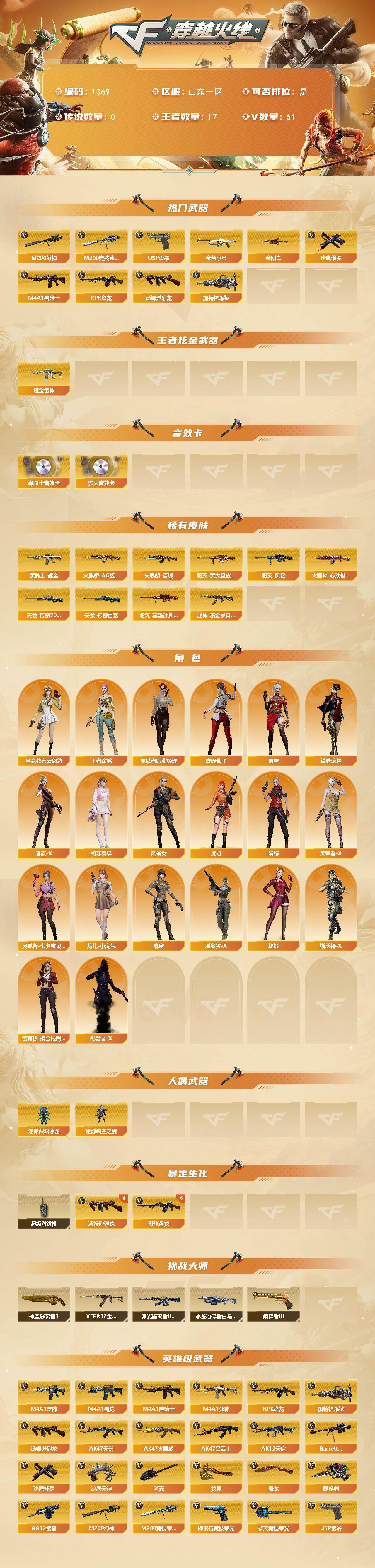 [16640545]山东一区-61v-17王者-1炫金 【热门武器】:m200-幻神,m200-竞技荣光,金色小号,m4a1-黑骑士2,汤姆逊-烈龙6,rpk-盘龙6,加特林-炼狱,usp-雷暴,沙鹰-修罗,金刚伞 【王者炫金武器】:炫金雷神 【音效卡】:m4a1-黑骑士音效卡,barrett-毁灭音效卡 【皮肤】:火麒麟-ag战队皮肤,火麒麟-百城,火麒麟-心动糖果,毁灭-黑大圣皮肤,毁灭-风暴,毁灭-英雄计划 皮肤,黑骑士耀金皮肤,战神-流金岁月皮肤,awm-天龙-传奇70kg,awm-天龙-传奇白鲨 【角色】:电竞教官-云悠悠,王者涂鸦,暗夜-x,初恋灵狐,风暴女,虎妞,娟娟,灵狐者-x,灵狐者-七夕宝贝,灵狐者-职业经理,龙儿-小淘气,麻雀,潘多拉-x,青霞仙子,蛇姬,斯沃特-x,蜀雪,铁骑荣耀,雪莉杨-摸金校尉,影武者-x 【人偶武器】:迷你深渊冰龙,迷你裂空之翼 【暴走生化】:超级对讲机 【挑战大师】:神圣爆裂者iii,冰龙粉碎者-白马银呛2,激光毁灭者iii-白马银呛,vepr-12-金魔,阐释者iii 【英雄级武器】:ak47-火麒麟3,m4a1-黑龙,m4a1-雷神,m4a1-黑骑士2,ak47-无影,m4a1-死神,ak47-黑武士,ak12-天启,ak-47-猩红传说,q-03-王者蔷薇-觉醒版,barrett-毁灭,m200-幻神,m200-竞技荣光,rpk-盘龙6,加特林-炼狱,汤姆逊-烈龙6,aa-12-雷霆,沙鹰-修罗,沙鹰-天神4,usp-雷暴,cop 357-雷霆王者-觉醒版,柯尔特-竞技荣光,屠龙2,龙啸,擎天2,麒麟刺,擎天-竞技荣光,王者之锋-觉醒版,王者之击-觉醒版,高爆手蕾-幻灵2,高爆手蕾-竞技荣光,闪光丹-竞技荣光5,闪光丹-雷霆王者-觉醒版2,盐雾蛋-竞技荣光5 【道具】:战舰背包,炫彩背包,超级背包,绿色巨人,灵魂忍者,变异宝贝,妖姬,迷雾幽灵2,生化弹匣,夺命之镰,防化服2,ep战队名片,防弹头盔2,防弹衣2,c4工具钳2,手蕾包2 【特殊呛械】:2黑骑士,6烈龙,6盘龙,1炼狱