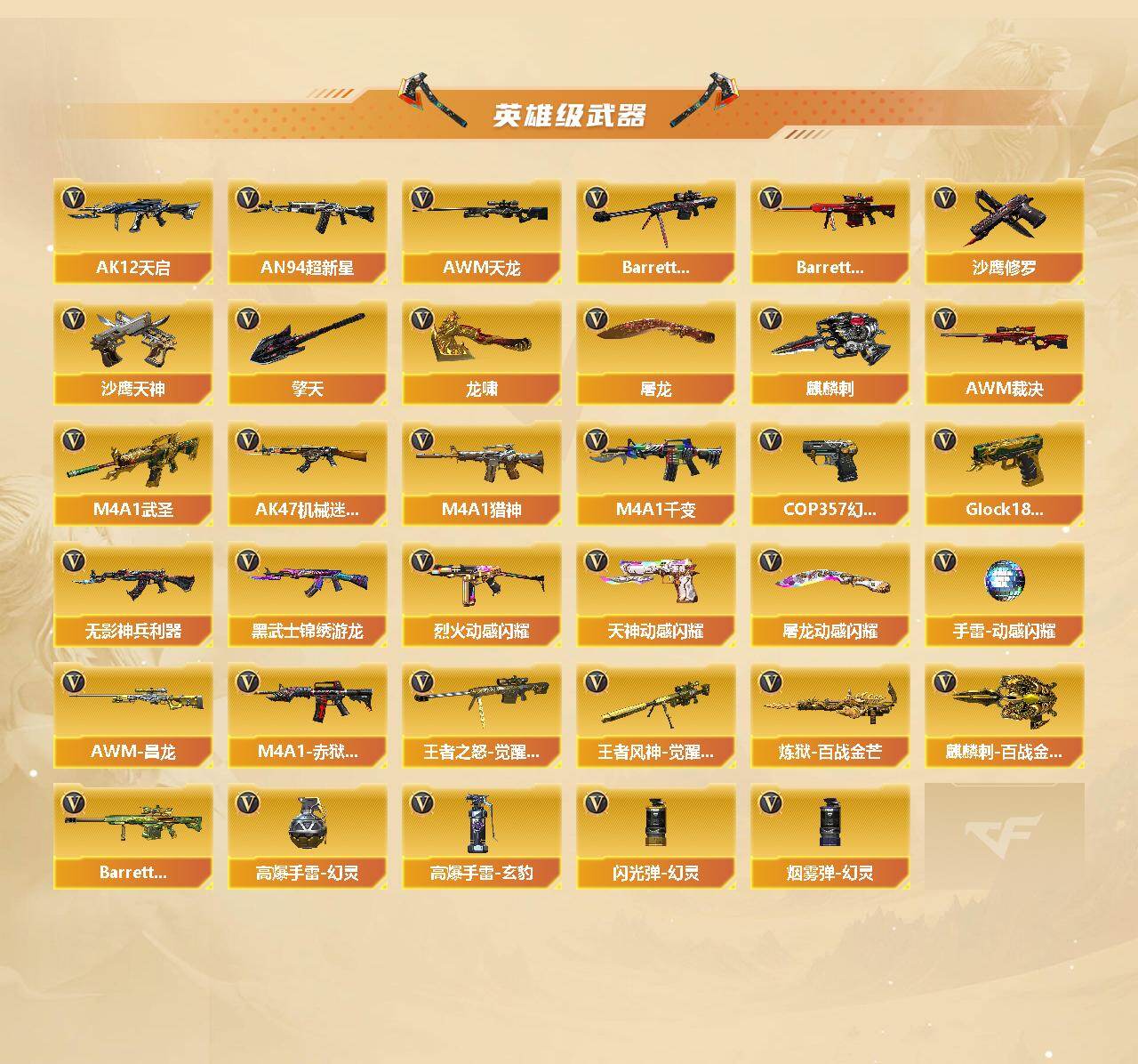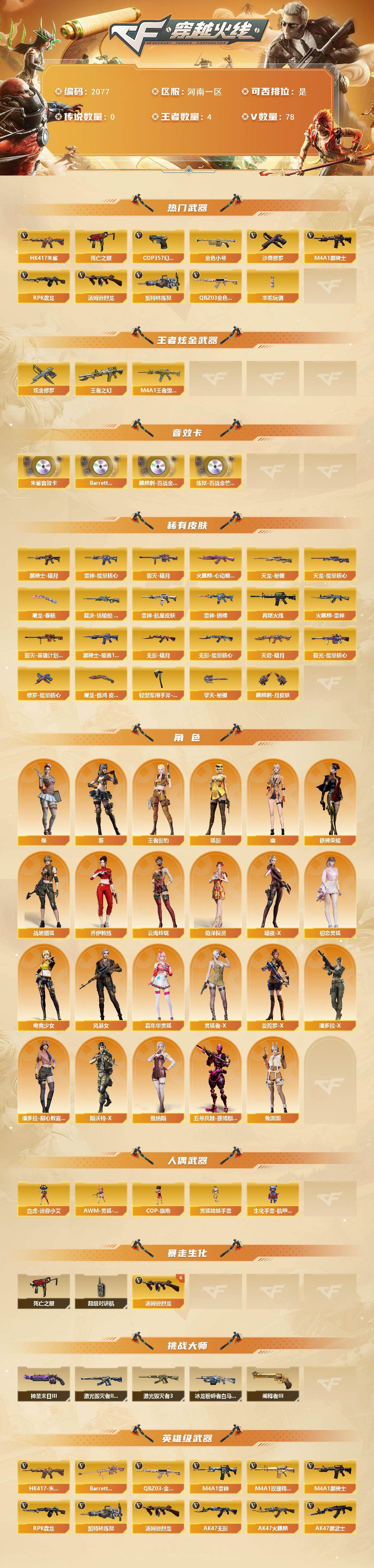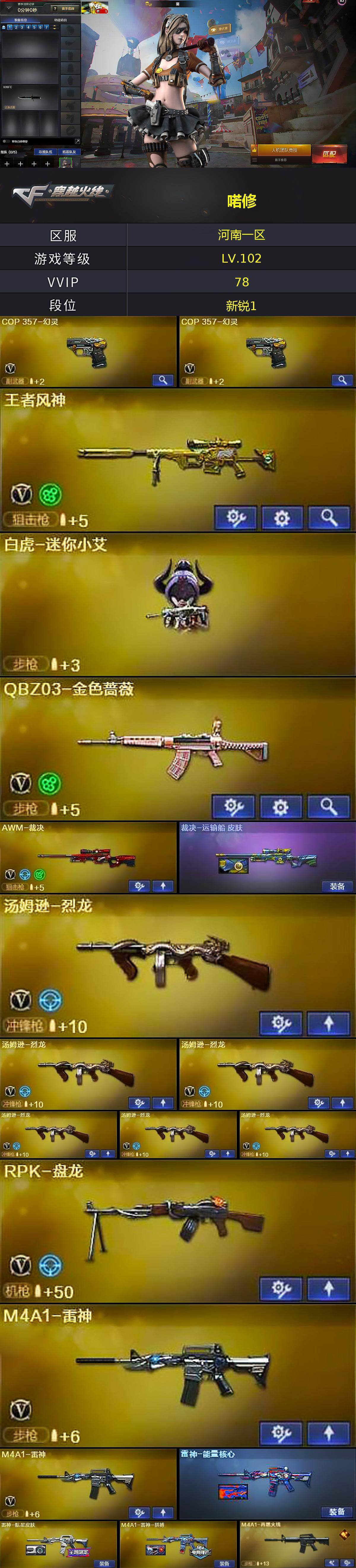 河南一区-80v-4王者武器数-1炫金武器数 【热门武器】:q03-金色蔷薇,hk417-朱雀,死亡之眼3,金色小号,m4a1-黑骑士2,汤姆逊-烈龙6,rpk-盘龙,加特林-炼狱,羊驼玩偶,cop 357-幻灵2,沙鹰-修罗4 【王者炫金武器】:王者之幻,m4a1-王者堕天神,炫金修