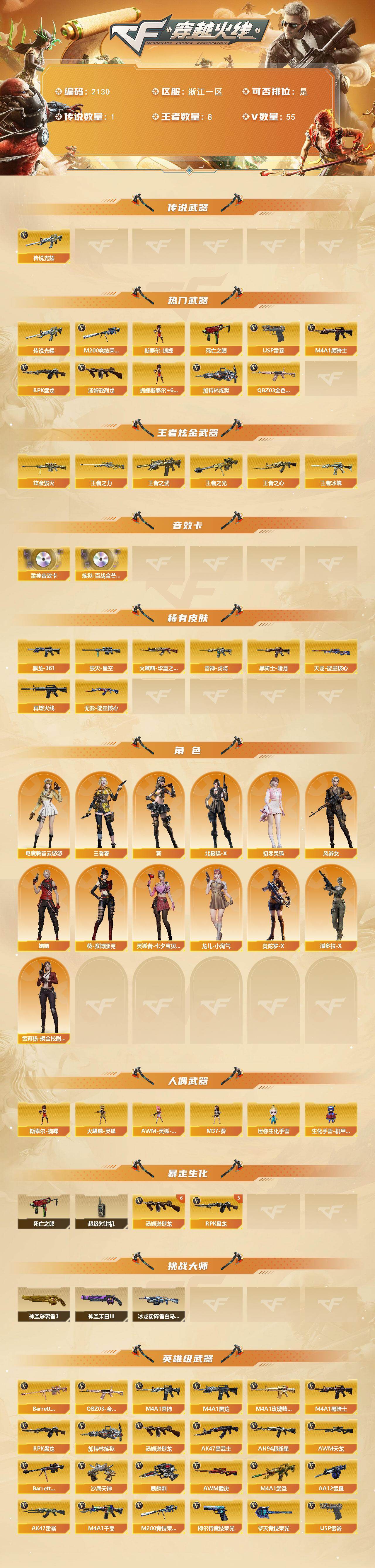 浙江一区-55v-8王者武器数-2炫金武器数 【传说武器】:传说光耀 【热门武器】:传说光耀,q03-金色蔷薇,m200-竞技荣光,死亡之眼2,m4a1-黑骑士,汤姆逊-烈龙6,rpk-盘龙5,加特林-炼狱2,斯泰尔-蝴蝶,usp-雷暴 【王者炫金武器】:王者冰魄,王者之武,王者之心,王者之光,王者之力,炫金毁灭2 【音效卡】:m4a1-雷神音效卡,炼狱-百战金芒-庆典舞曲音效卡