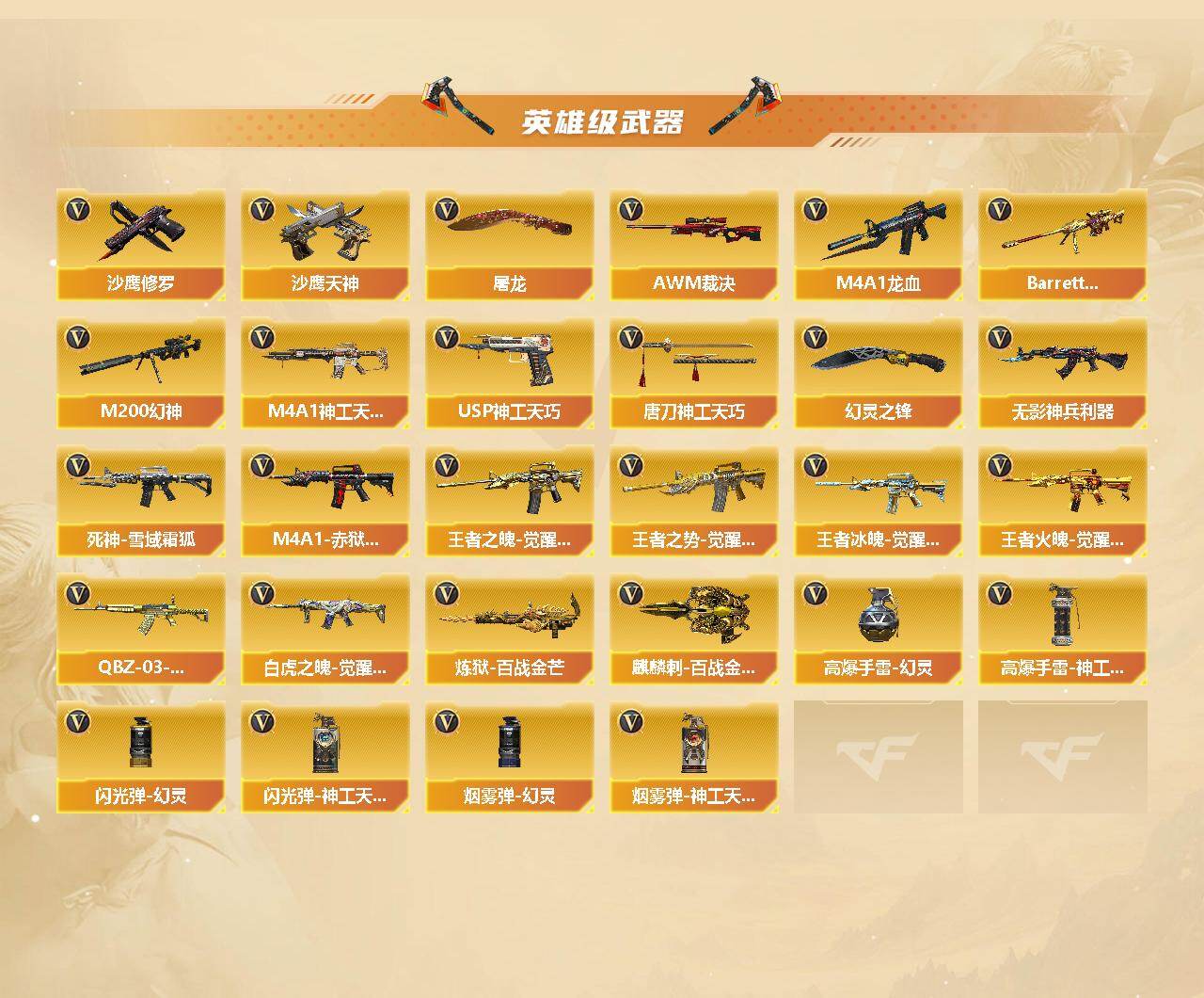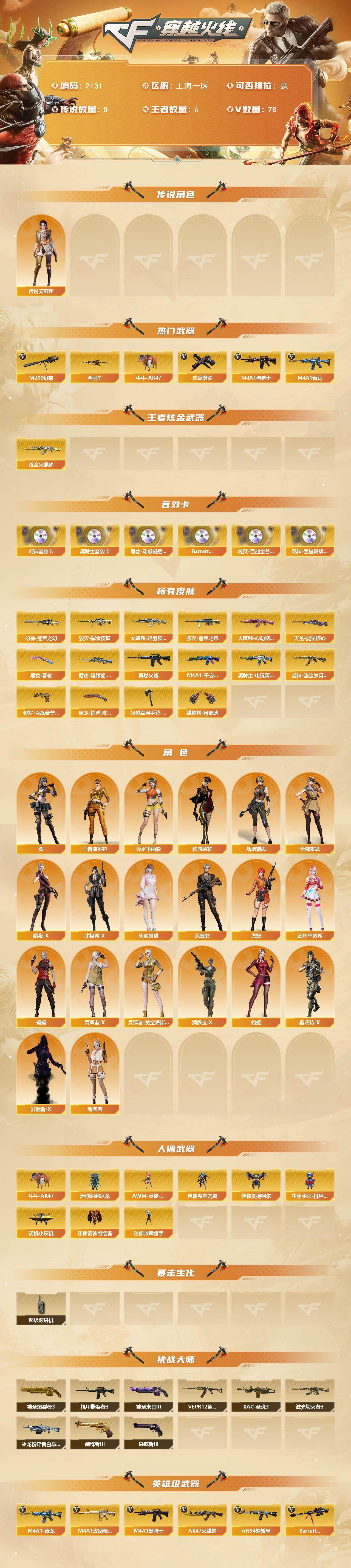 上海一区-78v-6王者武器数-1炫金武器数 【传说角色】:传说艾莉莎 【热门武器】:m4a1-青龙,m200-幻神,牛牛-ak47,m4a1-黑骑士,沙鹰-修罗7,金刚伞 【王者炫金武器】:炫金火麒麟 【音效卡】:屠龙-动感闪耀 音效卡,m200-幻神音效卡,m4a1-黑骑士音效卡,barrett-碧霄极光音效卡2,炼狱-百战金芒-庆典舞曲音效卡,死神-雪域霜狐-怀旧音效卡 【皮肤】:幻
