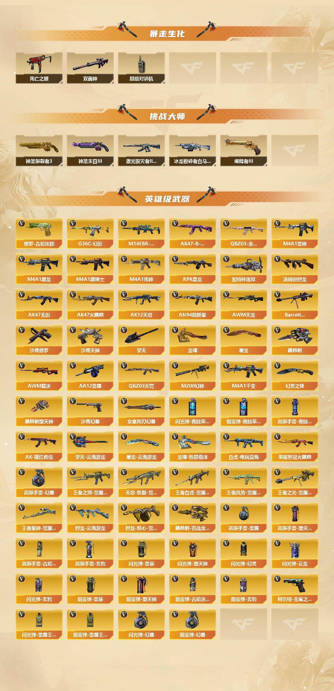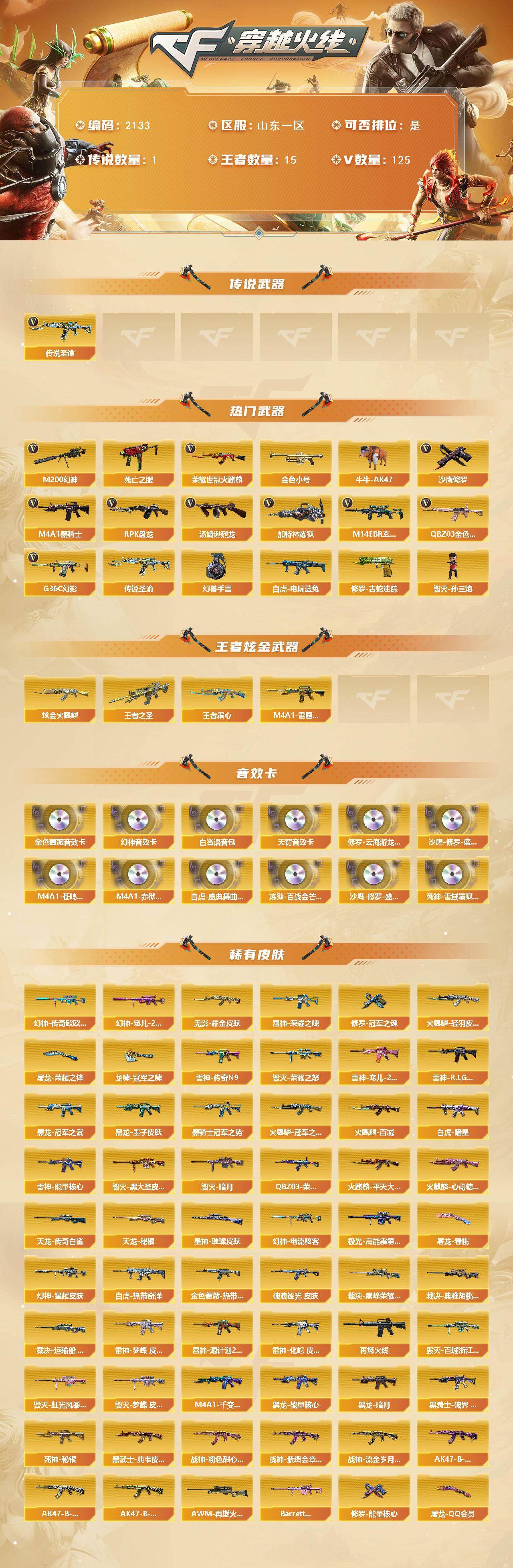 山东一区-125v-15王者武器数-1炫金武器数【幻兽套-手蕾套】 【传说武器】:传说圣谕 【热门武器】:传说圣谕,g36c-幻影,q03-金色蔷薇,m14ebr-玄武,m200-幻神2,修罗-古蛇迷踪,死亡之眼,荣耀世冠-火麒麟,白虎-电玩蓝兔,金色小号,牛牛-ak47,m4a1-黑骑士,汤姆逊-烈龙,rpk-盘龙,加特林-炼狱2,毁灭-孙三炮,沙鹰-修罗6,高爆手蕾-幻兽 【王者