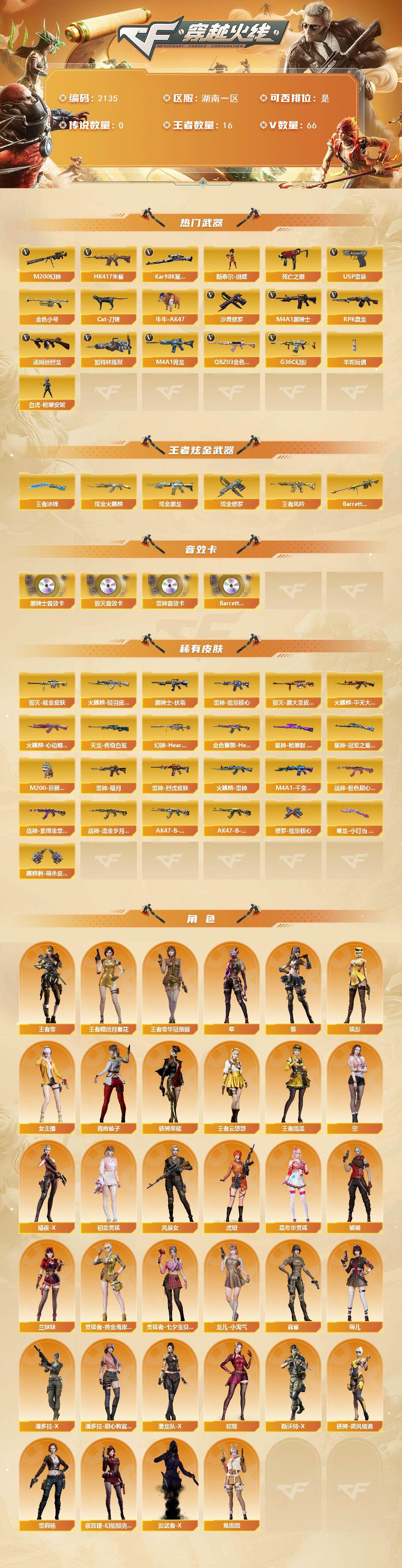 湖南一区-66v-16王者武器数-3炫金武器数 【热门武器】:g36c-幻影,q03-金色蔷薇,hk417-朱雀,m4a1-青龙,m200-幻神,死亡之眼,kar98k-星神,金色小号,cat-刀锋,牛牛-ak47,m4a1-黑骑士,汤姆逊-烈龙,rpk-盘龙,加特林-炼狱,斯泰尔-蝴蝶,羊驼玩偶,白虎-呛娘安妮,usp-雷暴,沙鹰-修罗2 【王者炫金武器】:王者凤吟,barrett-雷