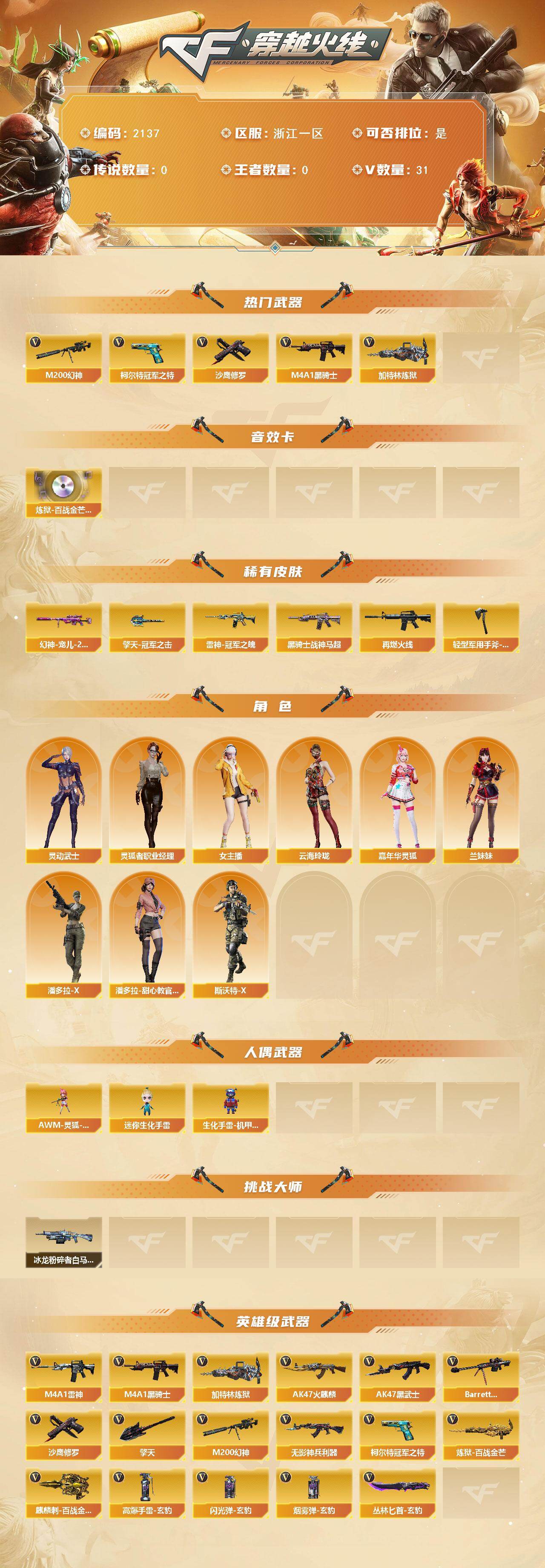 浙江一区-31v-0王者武器数-0炫金武器数 【热门武器】:m200-幻神,柯尔特-冠军之特,m4a1-黑骑士2,加特林-炼狱,沙鹰-修罗 【音效卡】:炼狱-百战金芒-庆典舞曲音效卡 【皮肤】:幻神-宠儿-2021mvp,雷神-冠军之魄,m4a1-再燃火线,黑骑士-战神马超,轻型军用手斧-再燃火线,擎天-冠军之击 【角色】:云海玲珑,嘉年华灵狐,兰妹妹,灵动武士,灵狐者-职业经理,女主播,潘