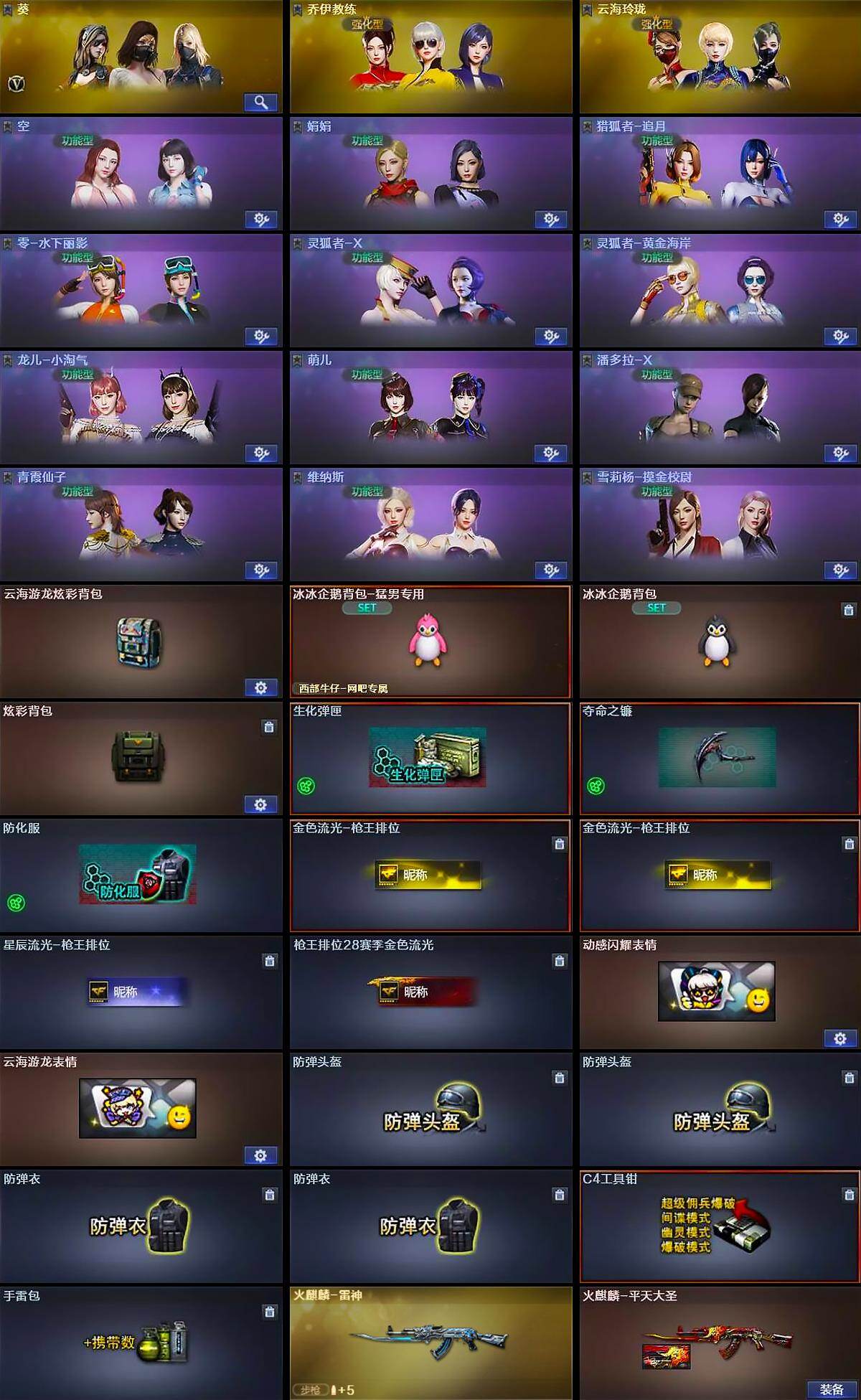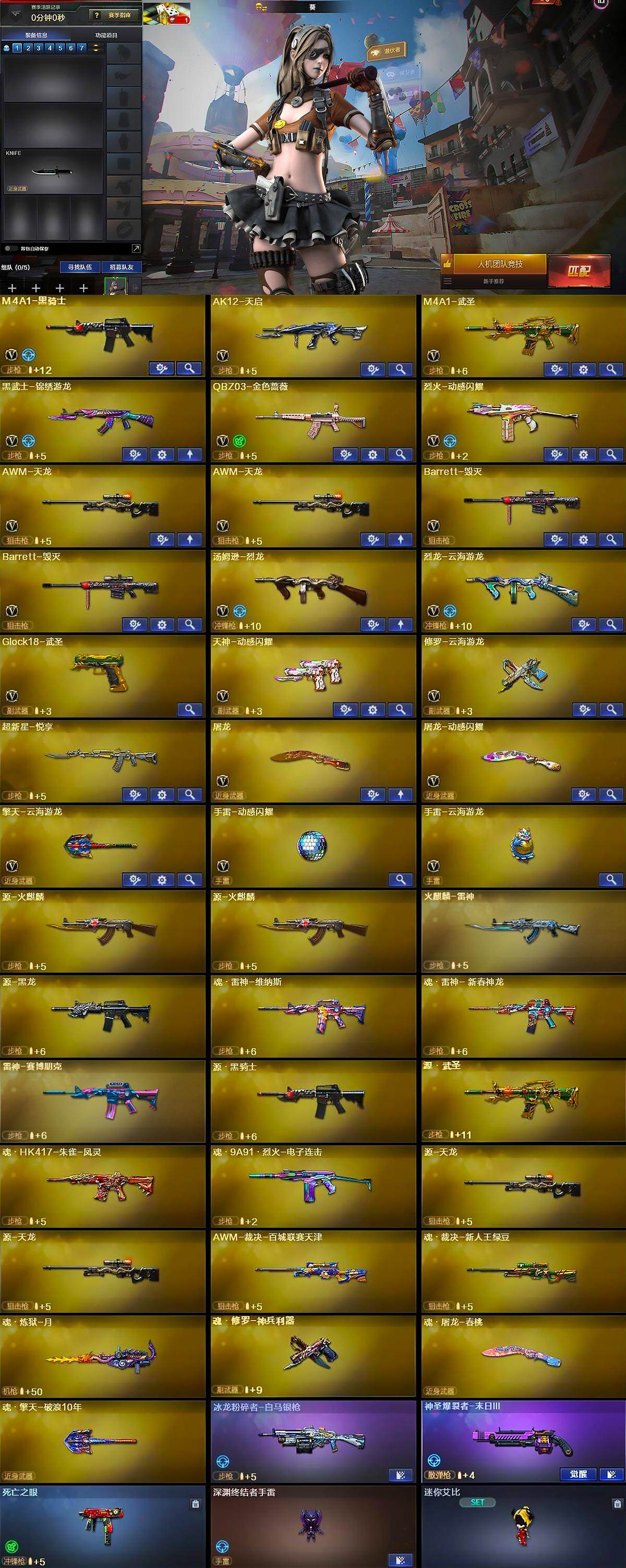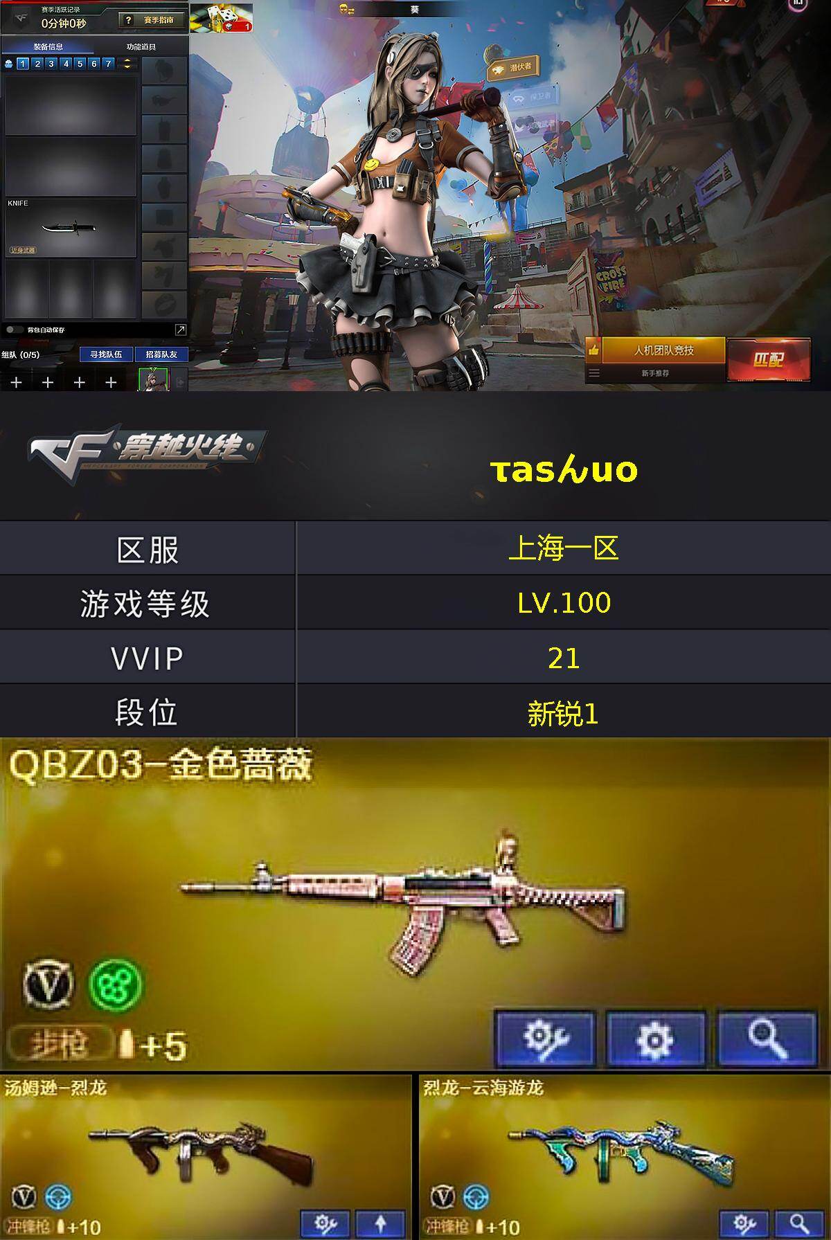 上海一区-21v-1王者武器数-0炫金武器数 【热门武器】:q03-金色蔷薇,死亡之眼,m4a1-黑骑士,汤姆逊-烈龙 【王者炫金武器】:超新星-悦享 【皮肤】:火麒麟-雷神,火麒麟-平天大圣 【角色】:葵,乔伊教练,云海玲珑,空,娟娟,猎狐者-追月,零-水下丽影,灵狐者-x,灵狐者-黄金海岸,龙儿-小淘气,萌儿,潘多拉-x,邱刚敖,青霞仙子,兔囡囡,维纳斯,雪莉杨-摸金校尉,樱-缤纷夏日 【人偶武器】:深渊终结者手蕾,迷你艾比 【暴走生化】:死亡之眼 【挑战大师】:冰龙粉碎者-白马银呛,神圣爆裂者-末日iii 【英雄级武器】:m4a1-黑骑士,ak12-天启,m4a1-武圣,黑武士-锦绣游龙,q03-金色蔷薇,烈火-动感闪耀,awm-天龙2,barrett-毁灭2,汤姆逊-烈龙,烈龙-云海游龙,glock18-武圣,天神-动感闪耀,修罗-云海游龙,屠龙,屠龙-动感闪耀,擎天-云海游龙,手蕾-动感闪耀,手蕾-云海游龙 【道具】:云海游龙炫彩背包,冰冰企鹅背包-猛男专用,冰冰企鹅背包,炫彩背包,生化弹匣,夺命之镰,防化服,金色流光-呛王排位2,星辰流光-呛王排位,呛王排位28赛季金色流光,动感闪耀表情,云海游龙表情,防弹头盔2,防弹衣2,c4工具钳,手蕾包 【特殊呛械】:1黑骑士,1烈龙
