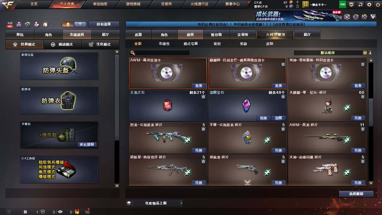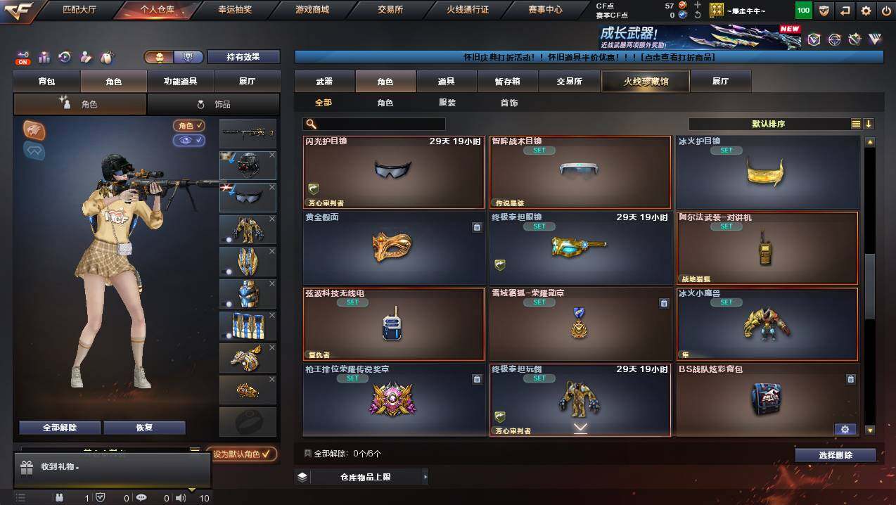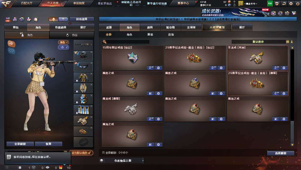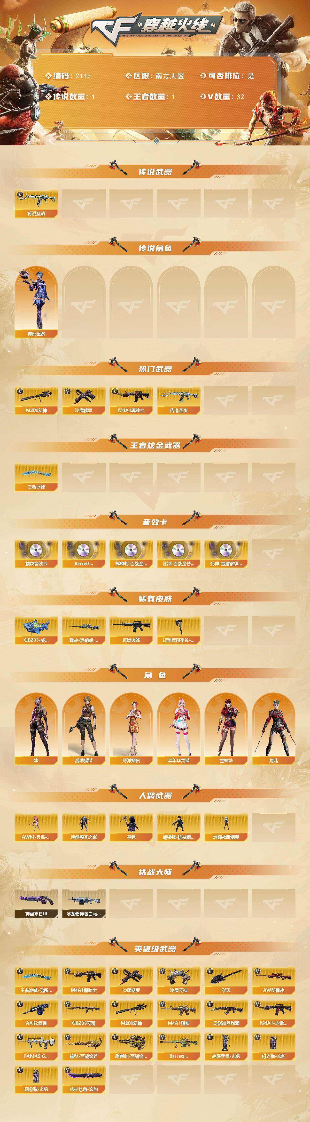 南方大区-29v-1王者武器数-0炫金武器数 【传说武器】:传说圣谕 【传说角色】:传说星骇 【热门武器】:传说圣谕,m200-幻神,m4a1-黑骑士,沙鹰-修罗2 【王者炫金武器】:王者冰锋 【音效卡】:awm-裁决音效卡,barrett-碧霄极光音效卡,麒麟刺-百战金芒-盛典舞曲音效卡,炼狱-百战金芒-庆典舞曲音效卡,死神-雪域霜狐-怀旧音效卡 【皮肤】:q03-威猛悍鲨,裁决-运输