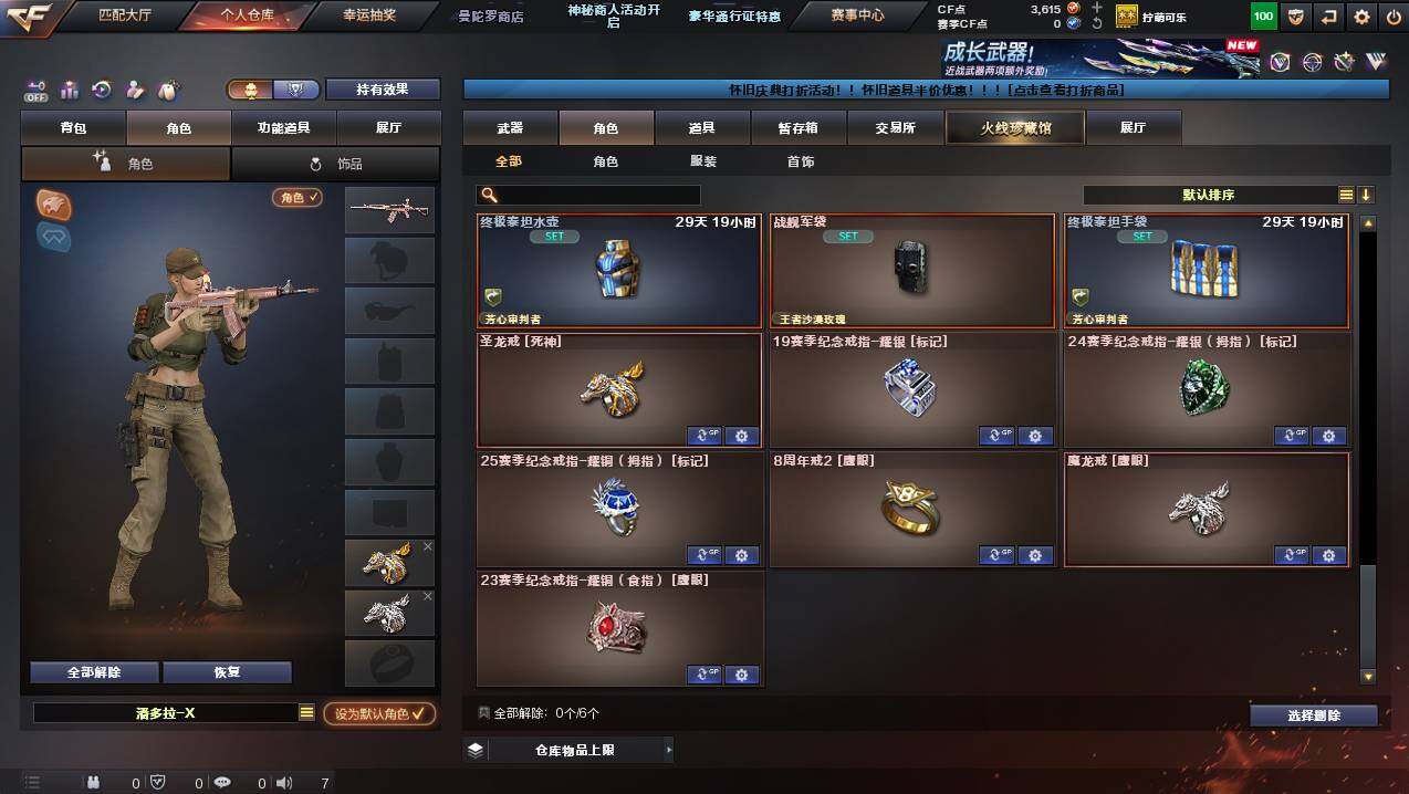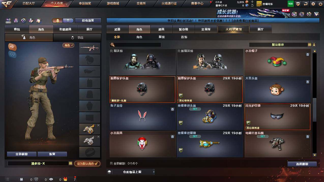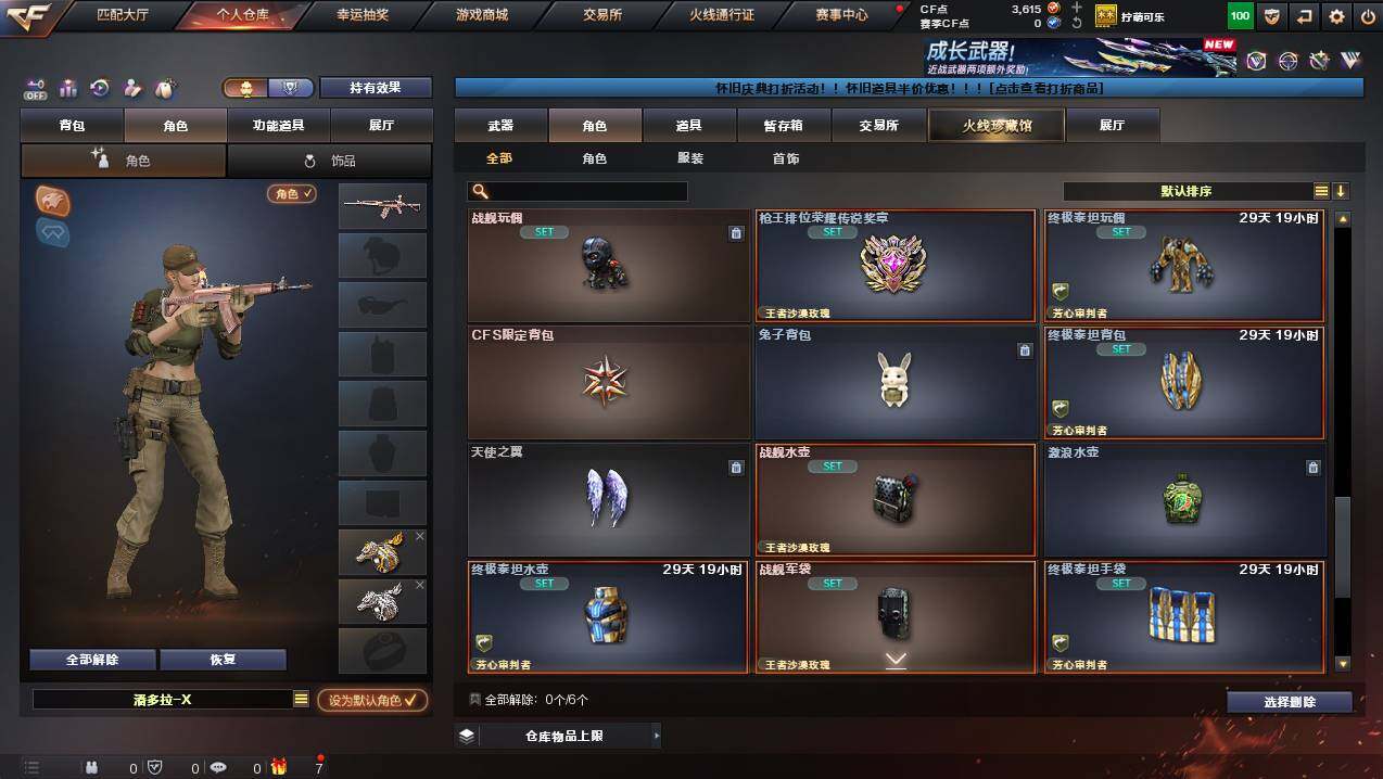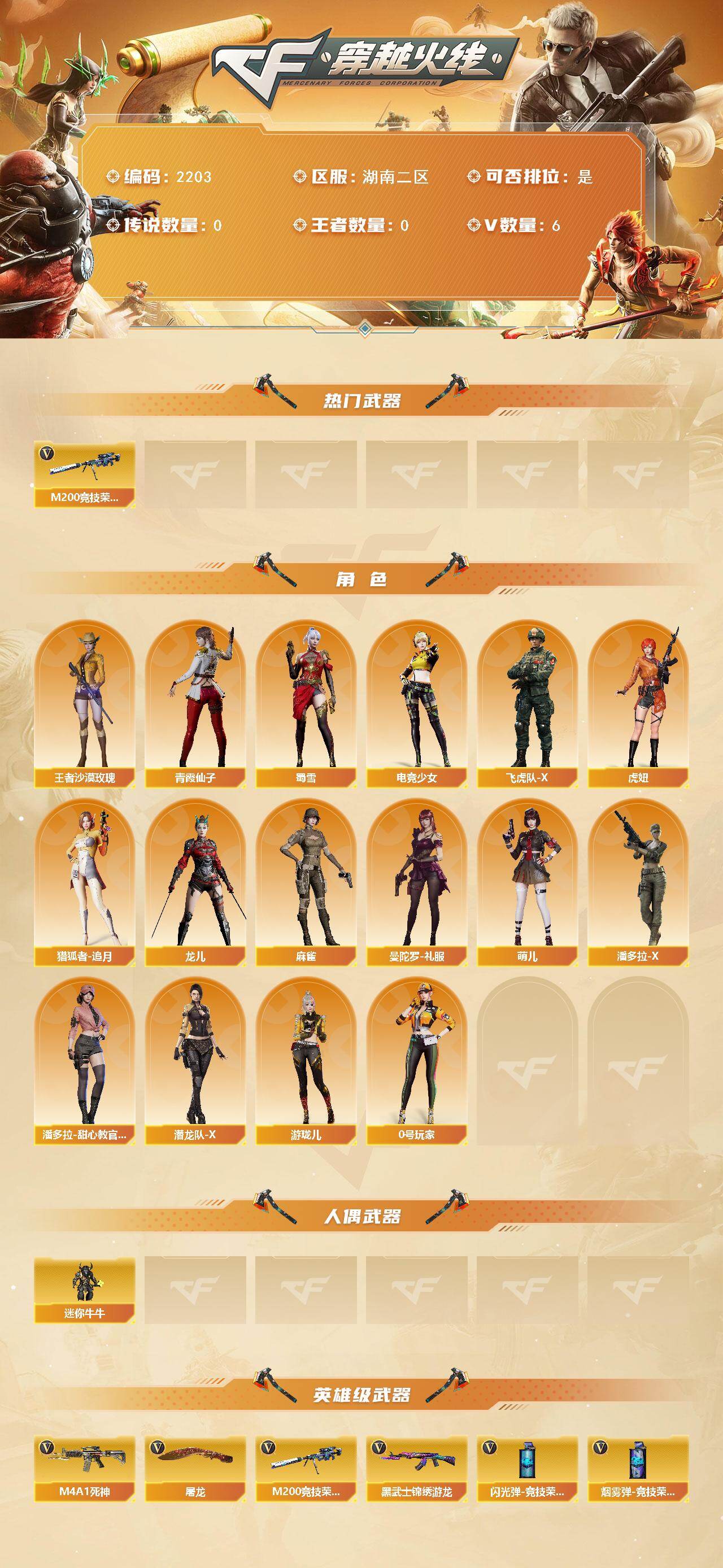 湖南二区-6v-0王者武器数-0炫金武器数 【热门武器】:m200-竞技荣光 【角色】:四防王者沙漠玫瑰,电竞少女,飞虎队-x,虎妞,猎狐者-追月,0号玩家,龙儿,麻雀,曼陀罗-礼服,萌儿,潘多拉-x,潘多拉-甜心教官,潜龙队-x,青霞仙子,蜀雪,游珑儿 【人偶武器】:迷你牛牛 【英雄级武器】:m4a1-死神,黑武士-锦绣游龙,m200-竞技荣光,屠龙,闪光丹-竞技荣光,盐雾蛋-竞技荣光 【道