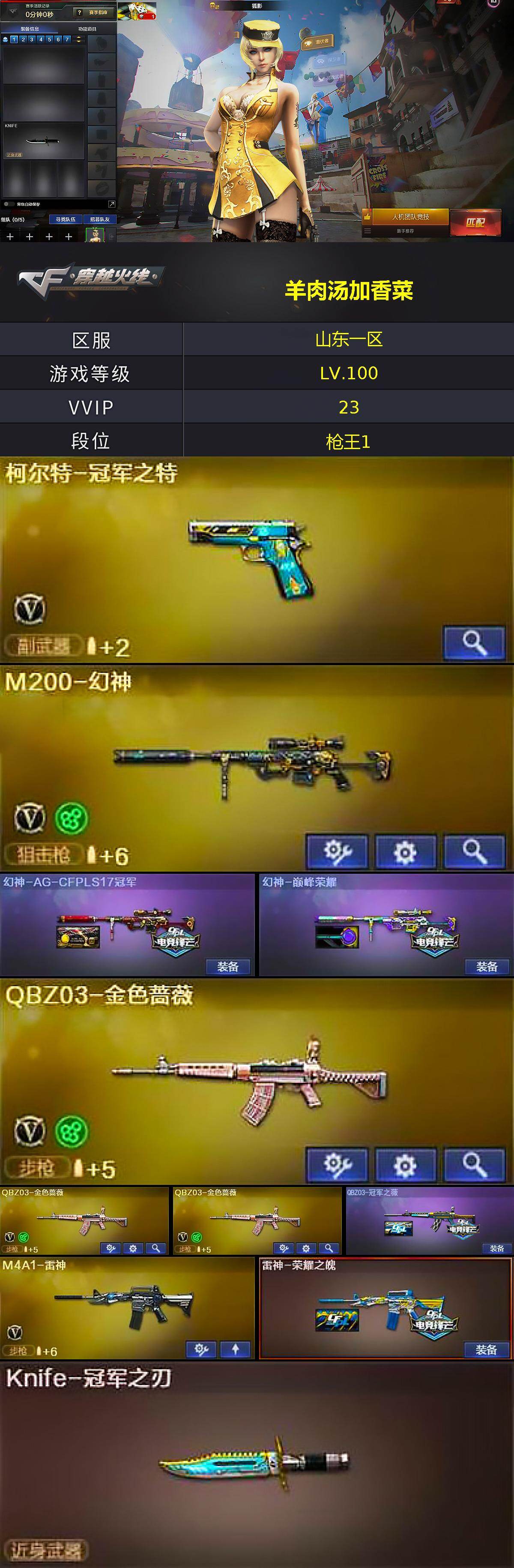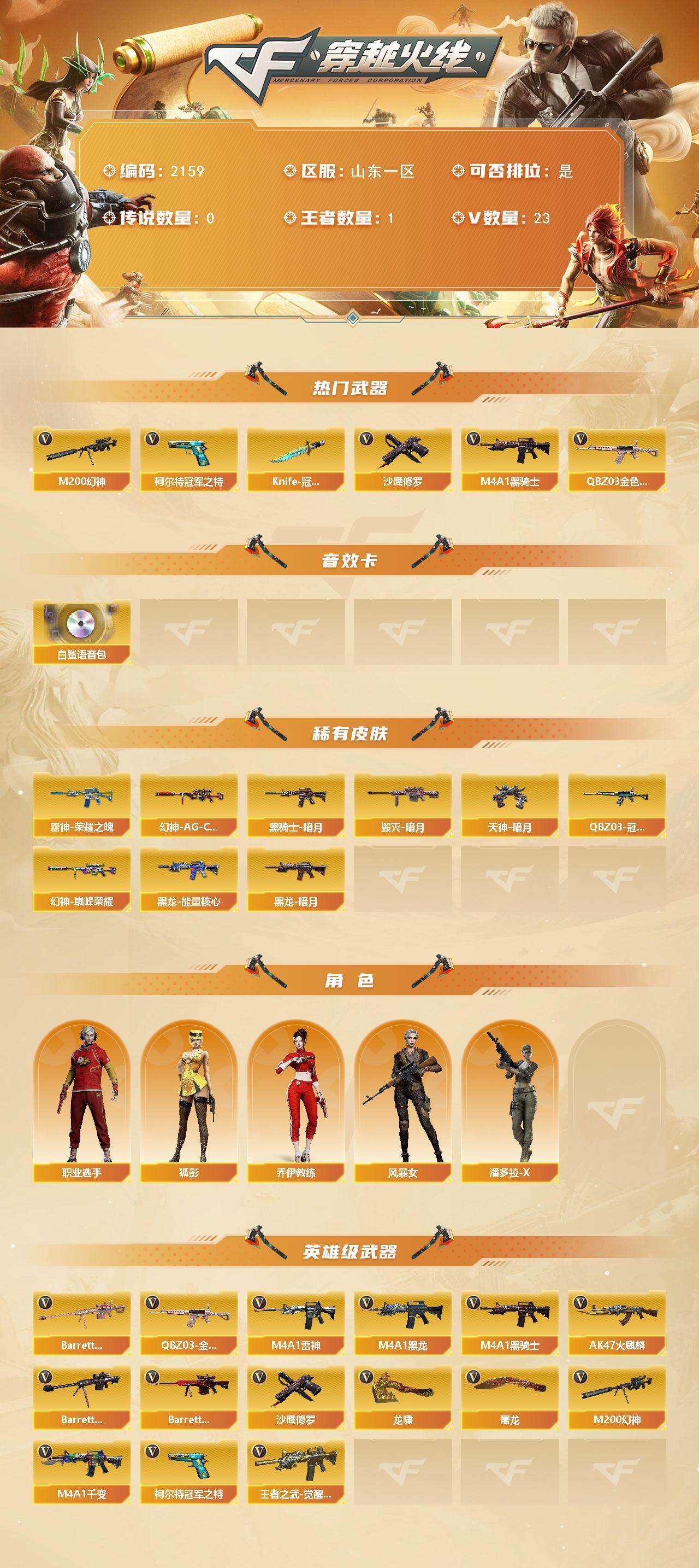 【2159】贝57165可排位-可二次【山东一区/23v/vip1】【幻神2皮肤/冠军之特冠军小刀/q带皮】【m200-幻神/幻神-巅峰荣耀/幻神-ag-cfpls17冠军】【knife-冠军之刃】【柯尔特-冠军之特】【q03-金色蔷薇3/q03-冠军之薇】【m4a1-雷神/雷神-荣耀之魄】【barrett-毁灭/毁灭-暗月】【ak47-火麒麟2】【m4a1-黑骑士】【m4a1-黑龙/黑龙-能量核心】【barrett-极光】【m4a1-千变】【沙鹰-修罗3/修罗-cfstar】【屠龙】【龙啸】【职业选手/狐影/乔伊教练/潘多拉-x】【斩魔刀】【征服者】【王者之武】【闪光丹-电竞装甲/盐雾蛋-电竞装甲】【白鲨语音包】【超级背包/防弹头盔2/防弹衣2/c4工具钳2/手蕾包2/防化服2】