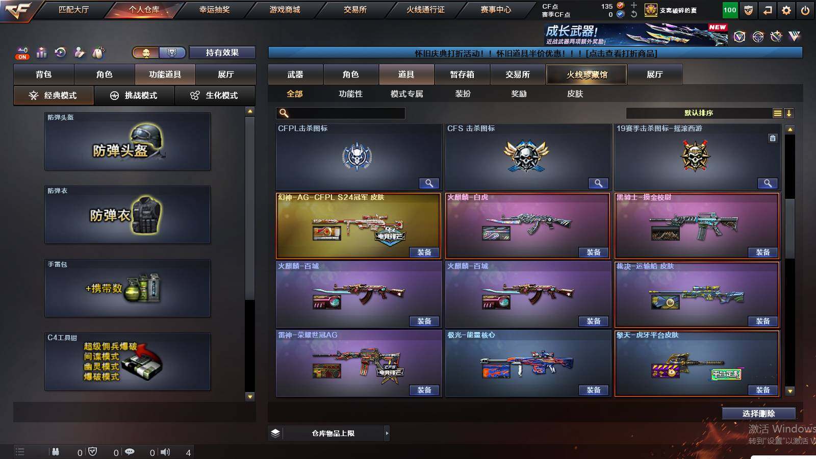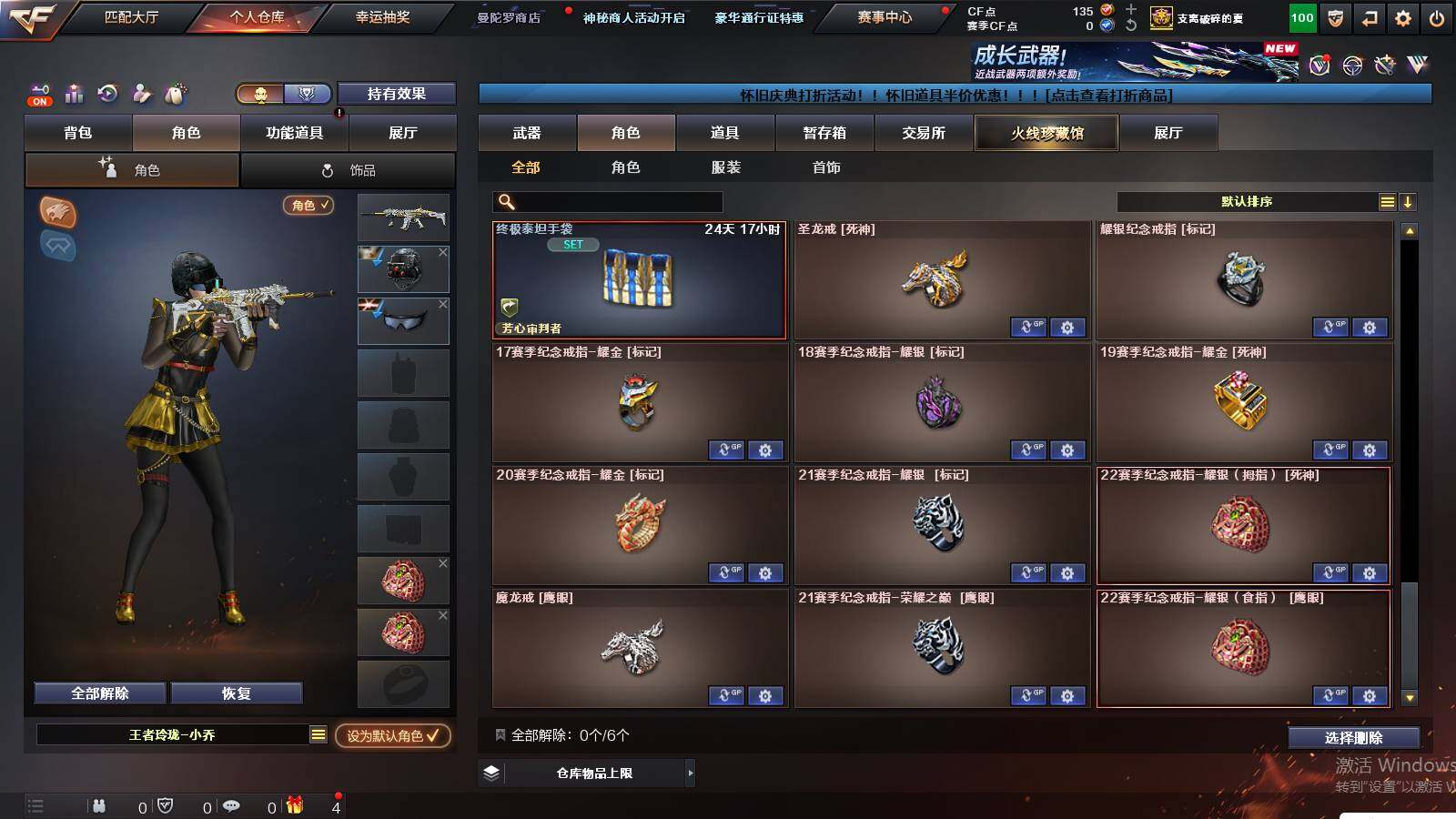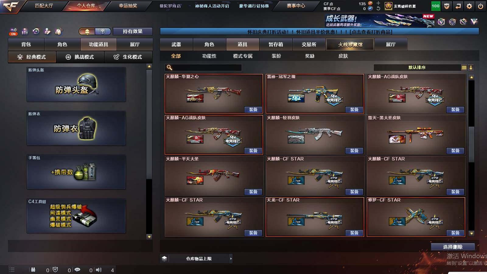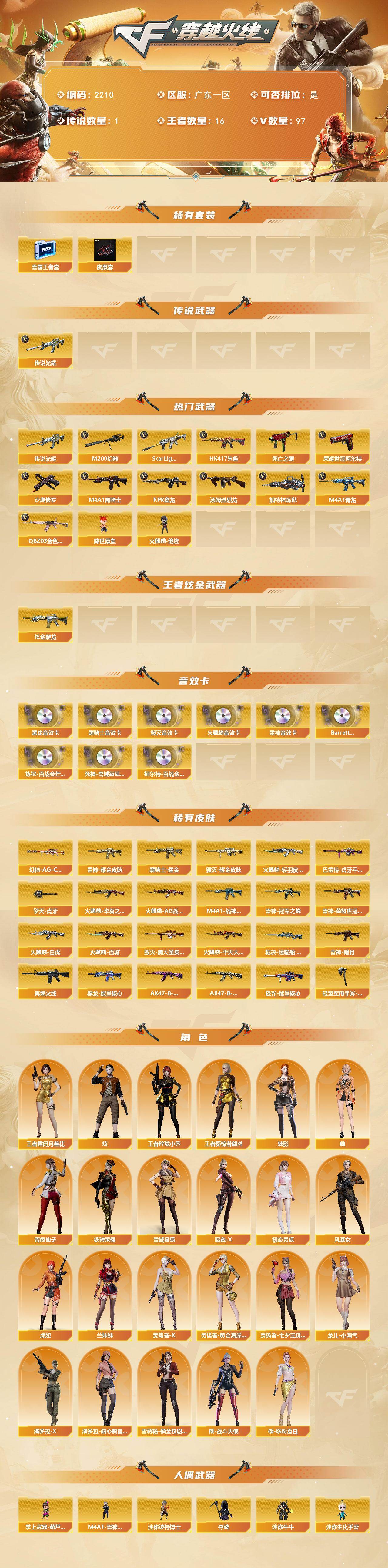 广东一区-97v 【传说武器】:传说光耀 【热门武器】:传说光耀,q03-金色蔷薇,scar light-白虎,hk417-朱雀,m4a1-青龙,m200-幻神,死亡之眼,荣耀世冠-柯尔特,m4a1-黑骑士,汤姆逊-烈龙7,rpk-盘龙,加特林-炼狱,降世魔童,火麒麟-绝迹,沙鹰-修罗6 【王者炫金武器】:炫金黑龙 【音效卡】:ak47-火麒麟音效卡,m4a1-雷神音效卡,m4a1-黑