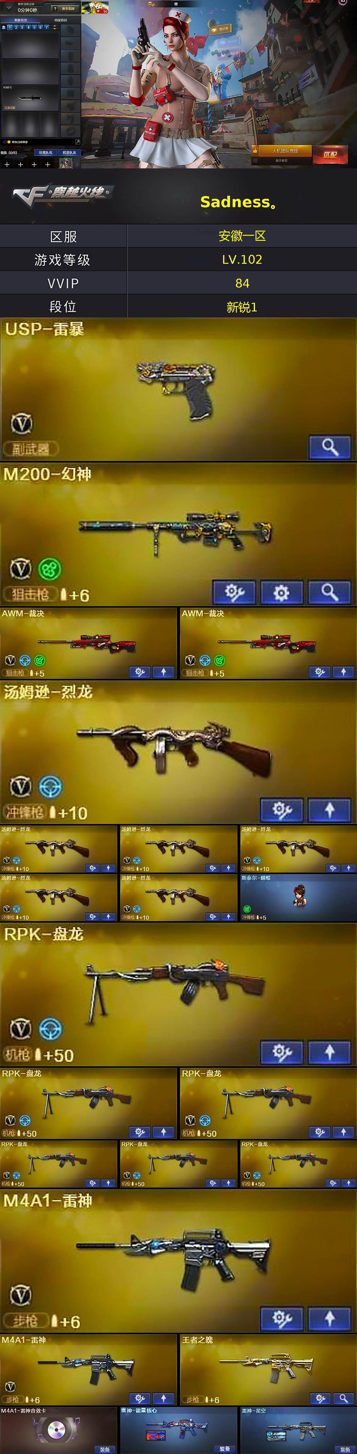 安徽一区-85v-9王者武器数-6炫金武器数 【热门武器】:m200-幻神,死亡之眼,m4a1-黑骑士2,汤姆逊-烈龙6,rpk-盘龙6,加特林-炼狱,斯泰尔-蝴蝶,usp-雷暴,沙鹰-修罗4 【王者炫金武器】:天启-悦智,王者之幻,王者之翼,王者之影,王者之魄,王者之力2,炫金武士2,炫金超新星,炫金毁灭,炫金天龙,炫金修罗 【音效卡】:m4a1-雷神音效卡,barrett-毁灭