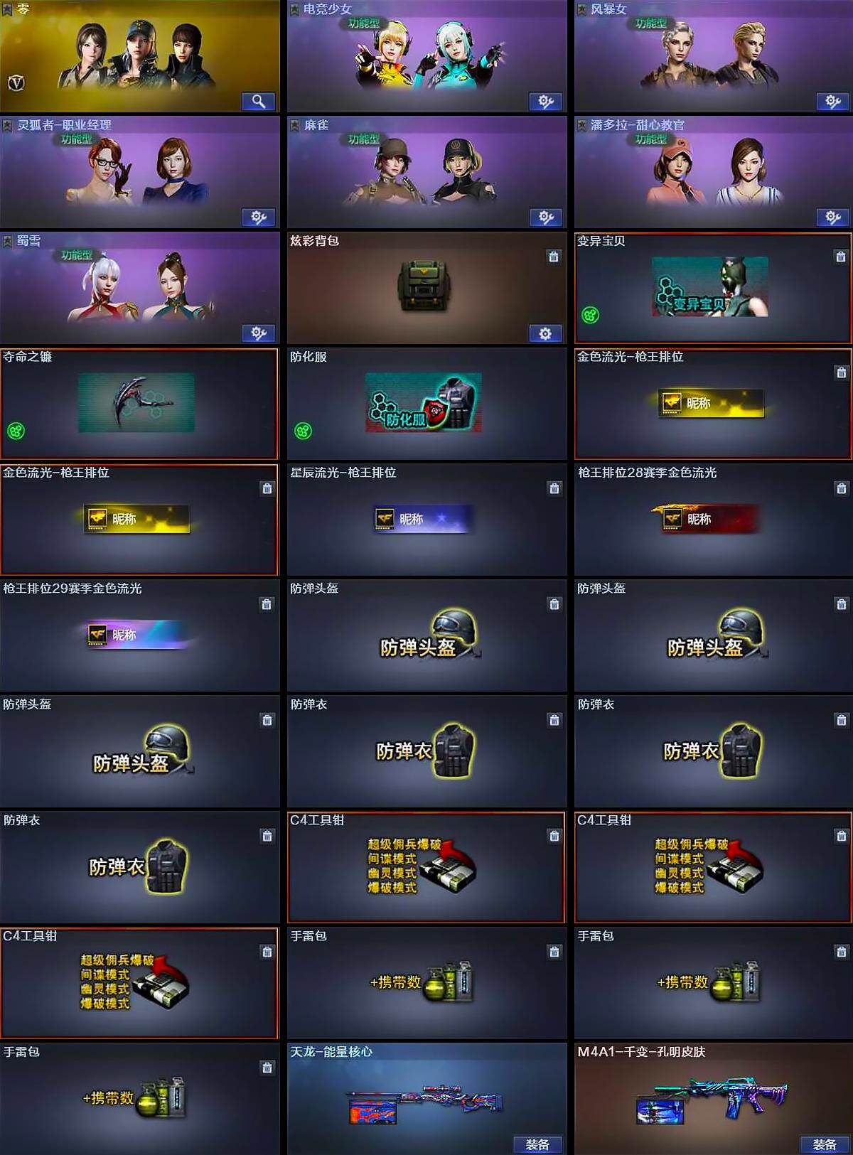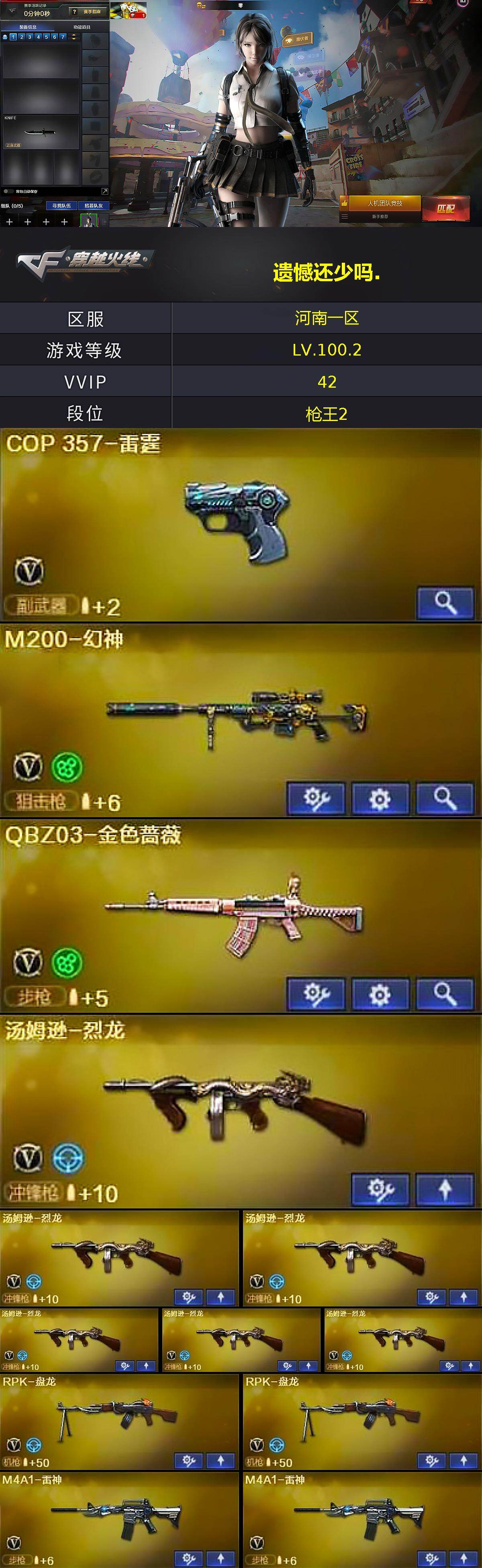 [16716970]河南一区-44v-3王者武器数-1炫金武器数 【热门武器】:q03-金色蔷薇,m200-幻神,死亡之眼,汤姆逊-烈龙6,rpk-盘龙2,加特林-炼狱,沙鹰-修罗4 【王者炫金武器】:王者之光,王者之力2,炫金毁灭 【皮肤】:m4a1-千变-孔明皮肤,天龙-能量核心 【角色】:零,电竞少女,风暴女,灵狐者-职业经理,麻雀,潘多拉-甜心教官,蜀雪 【人偶武器】:cop-旗袍 【暴走生化】:死亡之眼 【英雄级武器】:ak47-火麒麟,m4a1-雷神2,ak12-天启,黑武士-锦绣游龙,q03-金色蔷薇,awm-天龙2,barrett-毁灭2,m200-幻神,rpk-盘龙2,加特林-炼狱,汤姆逊-烈龙6,沙鹰-修罗4,沙鹰-天神,cop-雷霆,屠龙2,龙啸,擎天,麒麟刺,高爆手蕾-雷霆2,闪光丹-雷霆2,盐雾蛋-雷霆2 【道具】:炫彩背包,变异宝贝,夺命之镰,防化服,金色流光-呛王排位2,星辰流光-呛王排位,呛王排位28赛季金色流光,呛王排位29赛季金色流光,防弹头盔3,防弹衣3,c4工具钳3,手蕾包3 【特殊呛械】:6烈龙,2盘龙,1炼狱