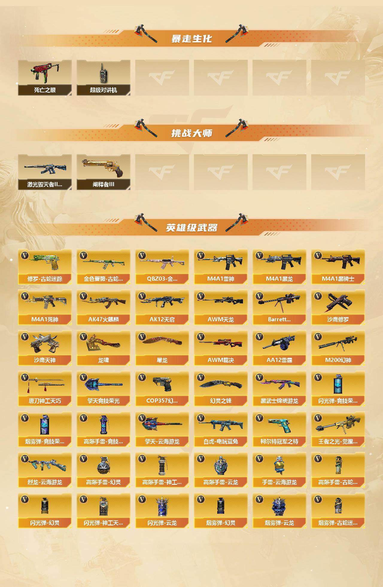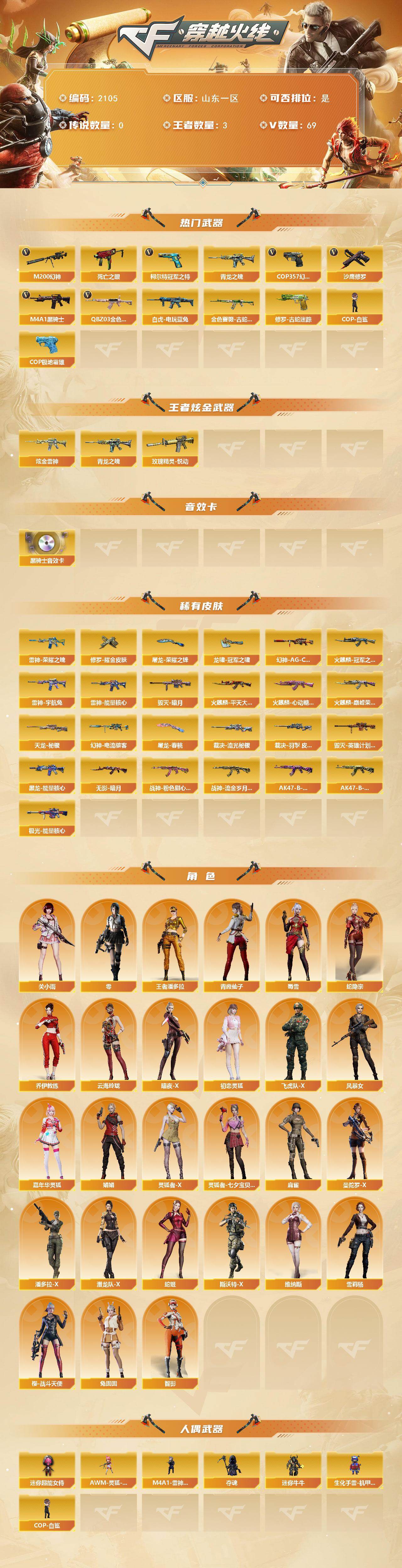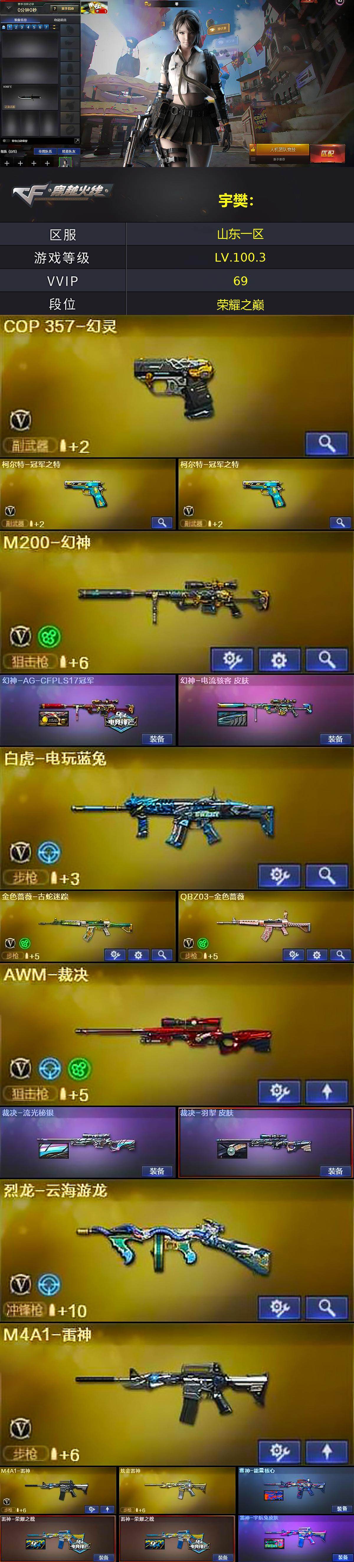 [16717172]山东一区-68v-3王者武器数-1炫金武器数 【热门武器】:q03-金色蔷薇,m200-幻神,金色蔷薇-古蛇迷踪,修罗-古蛇迷踪,死亡之眼,青龙之魄,白虎-电玩蓝兔,柯尔特-冠军之特2,m4a1-黑骑士,cop-白鲨,cop 357-幻灵,沙鹰-修罗2,cop 357-极地霜雄 【王者炫金武器】:玫瑰精灵-悦动,青龙之魄,炫金雷神 【音效卡】:m4a1-黑骑士音效卡 【皮肤】:幻神-ag-cfpls17冠军,幻神-电流骇客 皮肤,裁决-流光秘银,裁决-羽掣 皮肤,雷神-能量核心,雷神-荣耀之魄2,雷神-宇航兔皮肤,火麒麟-冠军之心,火麒麟-平天大圣,火麒麟-巅峰荣耀,火麒麟-心动糖果,毁灭-暗月2,毁灭-英雄计划 皮肤,黑龙-能量核心,无影-暗月,战神-粉色甜心皮肤,战神-流金岁月皮肤2,ak47-b-常胜将军-曹操,ak47-b-常胜将军-孙权,天龙-秘银,极光-能量核心,修罗耀金皮肤,屠龙-荣耀之锋3,屠龙-春桃 皮肤,龙啸-冠军之啸 【角色】:零,关小雨,王者潘多拉,蛇隐宗,乔伊教练,云海玲珑,暗夜-x,初恋灵狐,飞虎队-x,风暴女,嘉年华灵狐,娟娟,灵狐者-x,灵狐者-七夕宝贝,麻雀,曼陀罗-x,潘多拉-x,潜龙队-x,青霞仙子,蛇姬,斯沃特-x,蜀雪,兔囡囡,维纳斯,雪莉杨,樱-战斗天使,智影 【人偶武器】:cop-白鲨,m4a1-雷神-精英刀锋,awm-灵狐-15周年嘉年华,夺魂,迷你牛牛,生化手蕾-机甲核心,迷你超能女侍 【暴走生化】:死亡之眼,超级对讲机 【挑战大师】:激光毁灭者iii-白马银呛,阐释者iii 【英雄级武器】:ak47-火麒麟2,m4a1-黑龙,m4a1-雷神2,m4a1-黑骑士,m4a1-死神,ak12-天启,黑武士-锦绣游龙,金色蔷薇-古蛇迷踪,q03-金色蔷薇,白虎-电玩蓝兔,awm-天龙,barrett-毁灭,awm-裁决,m200-幻神,王者之光-觉醒版,烈龙-云海游龙,aa-12-雷霆,沙鹰-修罗2,沙鹰-天神,cop 357-幻灵,柯尔特-冠军之特2,修罗-古蛇迷踪,屠龙5,龙啸,幻灵之锋,擎天-竞技荣光,唐刀-神工天巧,擎天-云海游龙,高爆手蕾-幻灵3,高爆手蕾-竞技荣光2,高爆手蕾-神工天巧,高爆手蕾-云龙3,手蕾-云海游龙,高爆手蕾-古蛇迷踪,闪光丹-幻灵3,闪光丹-竞技荣光