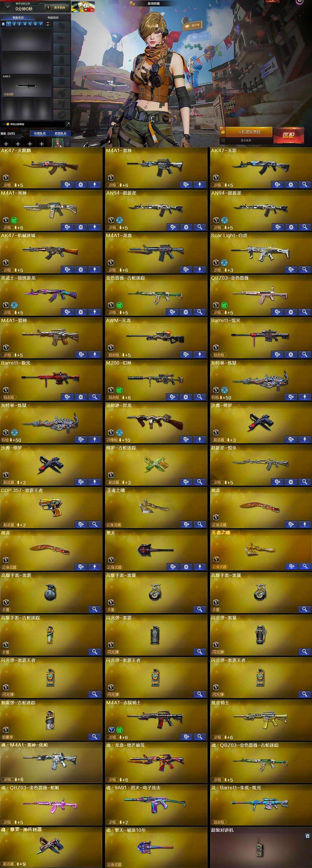 黑龙江区-37v-7王者武器数-1炫金武器数 【热门武器】:q03-金色蔷薇,scar light-白虎,m200-幻神,金色蔷薇-古蛇迷踪,修罗-古蛇迷踪,汤姆逊-烈龙,加特林-炼狱2,cop 357-雷霆王者,沙鹰-修罗2 【王者炫金武器】:超新星-悦享,cop 357-雷霆王者,王者之